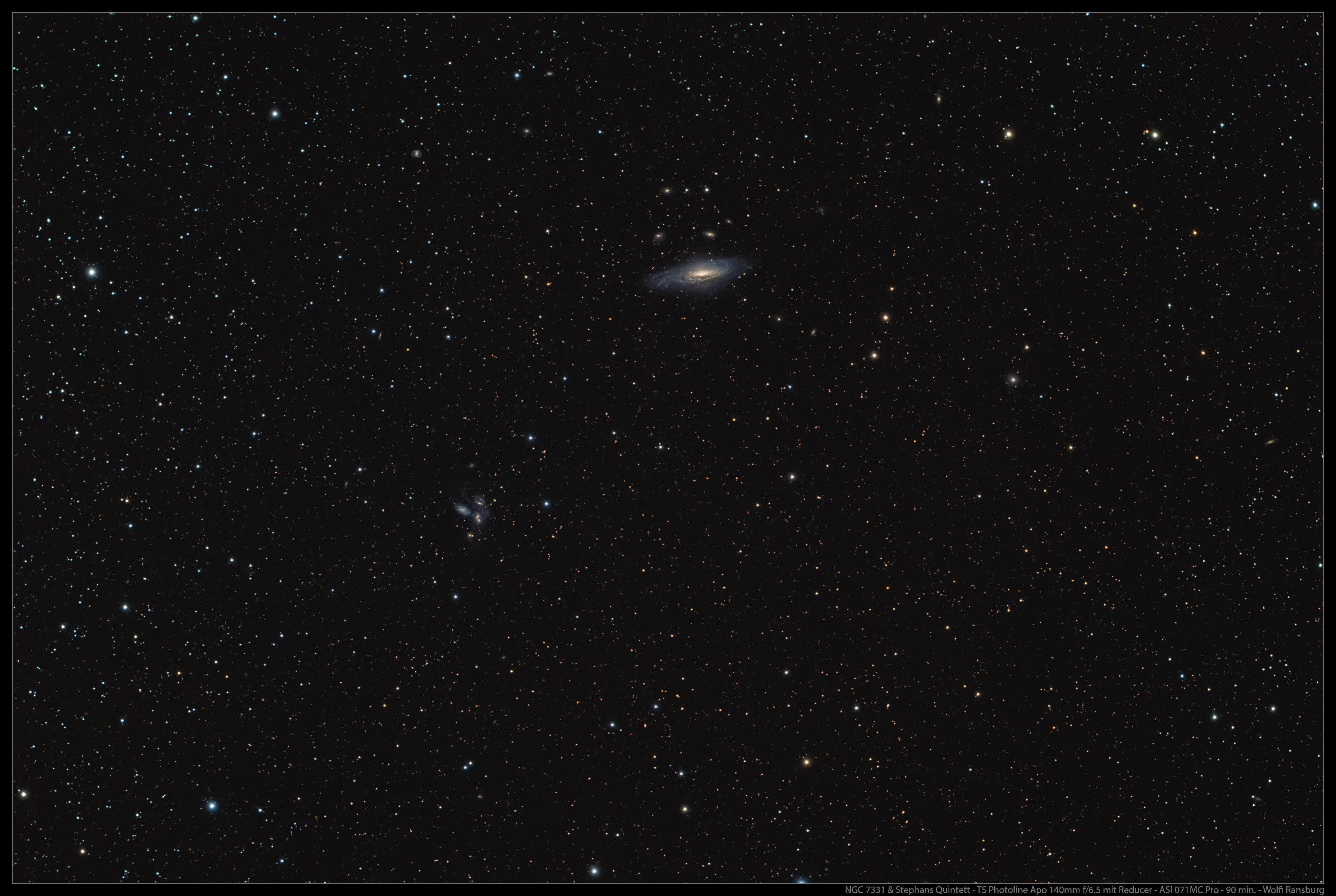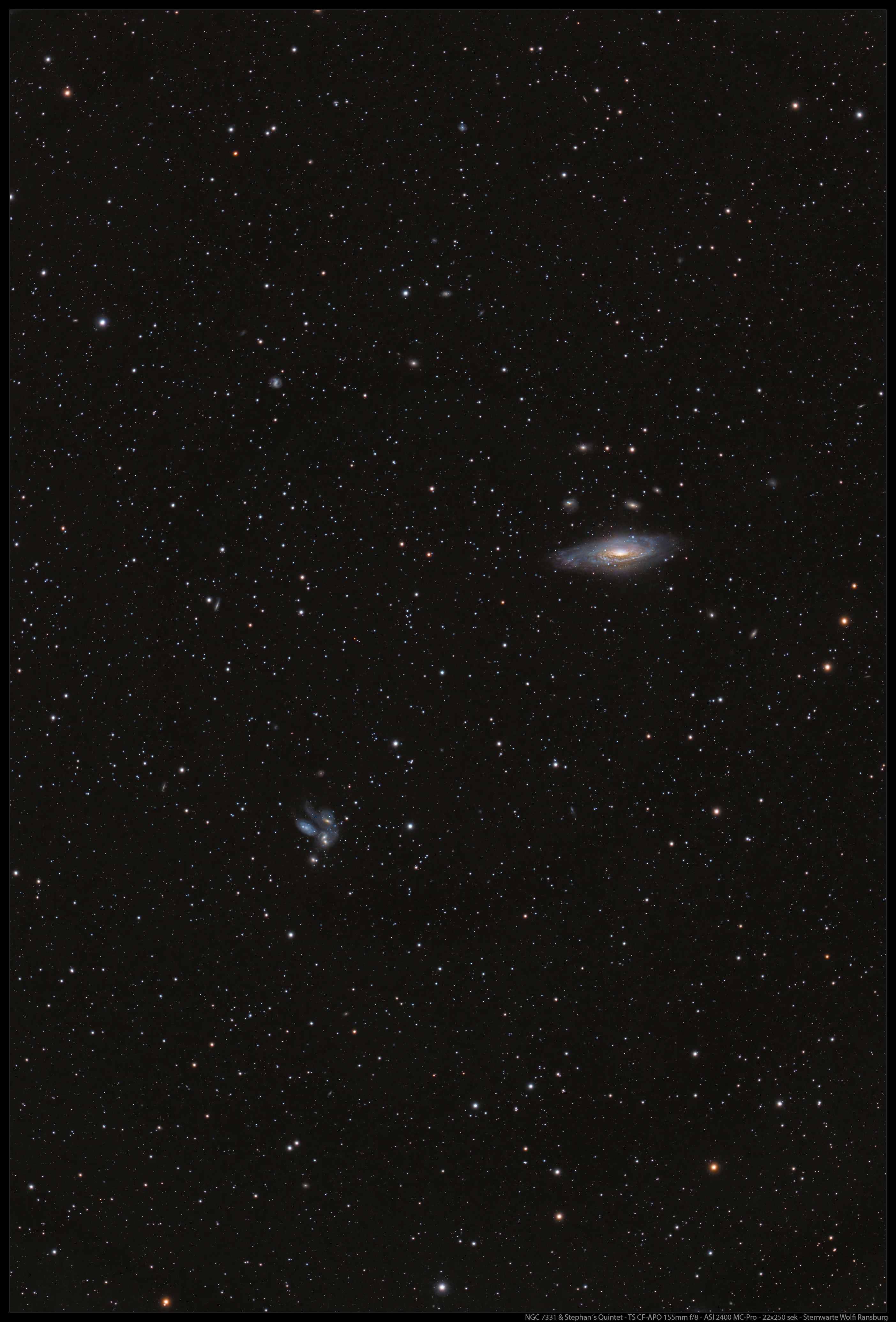 NGC 7331 ist eine Galaxie im Sternbild Pegasus. Dieses Areal ist fernab der Milchstraße. Das Licht ferner Galaxien kann so ungehindert von Gas und Staub zu uns durchdringen. Entsprechend hoch ist die Anzahl der Galaxien in diesem Feld. Links unterhalb von NGC 7331 findet man eine bekannte Galaxiengruppe, Stephans Quintett. Die Galaxien sind auch räumlich verbundenen und beeinflussen ihre Form durch die Gravitation.
