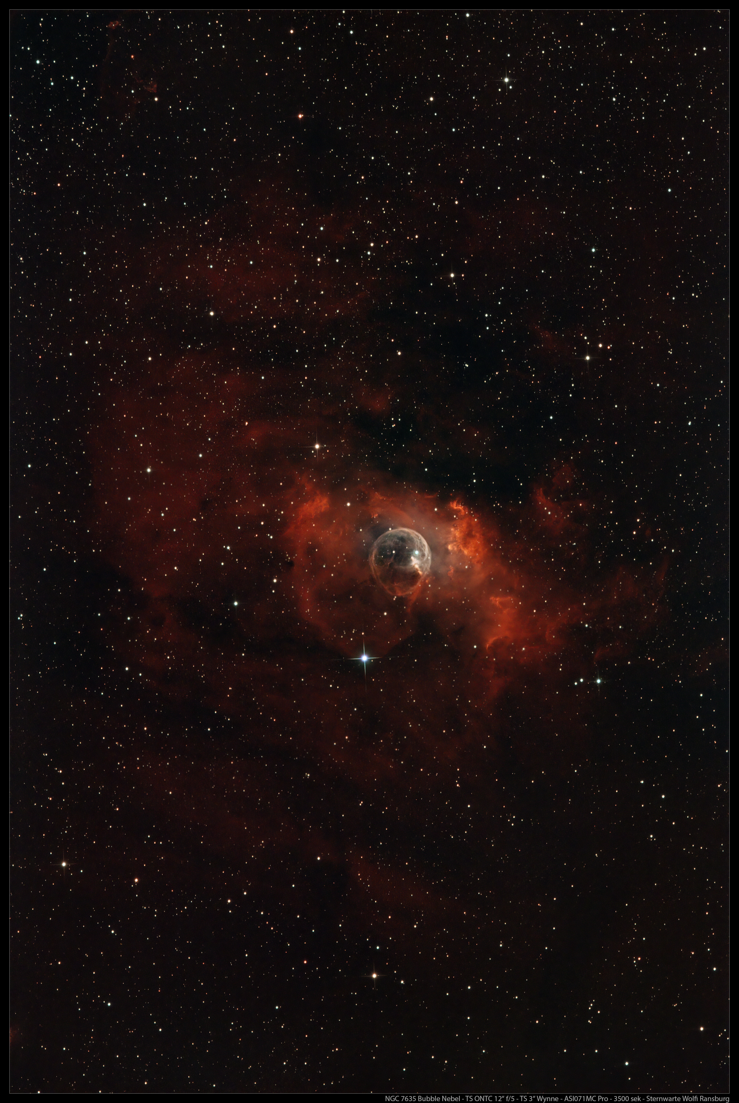 Zum Einsatz ist wieder der TS-Optics CF-APO 155mm f/8 gekommen. Die Bildkorrektur wurde wieder mit dem TSFLAT 2,5 gemacht. Dieser Korrektor verändert die Brennweite nicht. Der Aufnahmeort ist wieder meine Sternwarte, die im Münchner Osten gelegen ist. Ein Nebelfilter von Hutech ist zum Einsatz gekommen, um die Störwirkungen des Stadtlichtes zu geduzieren. Durch den großen Sensor der ASI 2400MC Pro konnte ich, trotz 1240mm Aufnahmebrennweite, viele Galaxien ins Feld bekommen.Der Bubble Nebel ist ein markanter Nebel im Sternbild Cassiopeia. Ein Stern im Inneren dieser Blase stößt große Mengen an Gas aus und dort, wo dieses Gas an die große rötlich schimmernde Molekülwolke stößt, bildet sich diese Blasenform aus. Der Nebel ist zwar auch visuell zu sehen aber Astrofotos zeigen erst die markante Form des Nebels. Der offene Sternhaufen in der linken oberen Ecke ist M52.