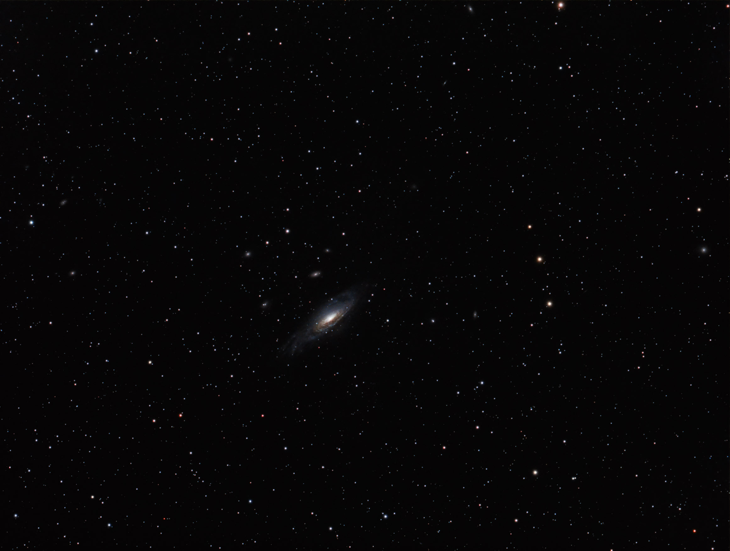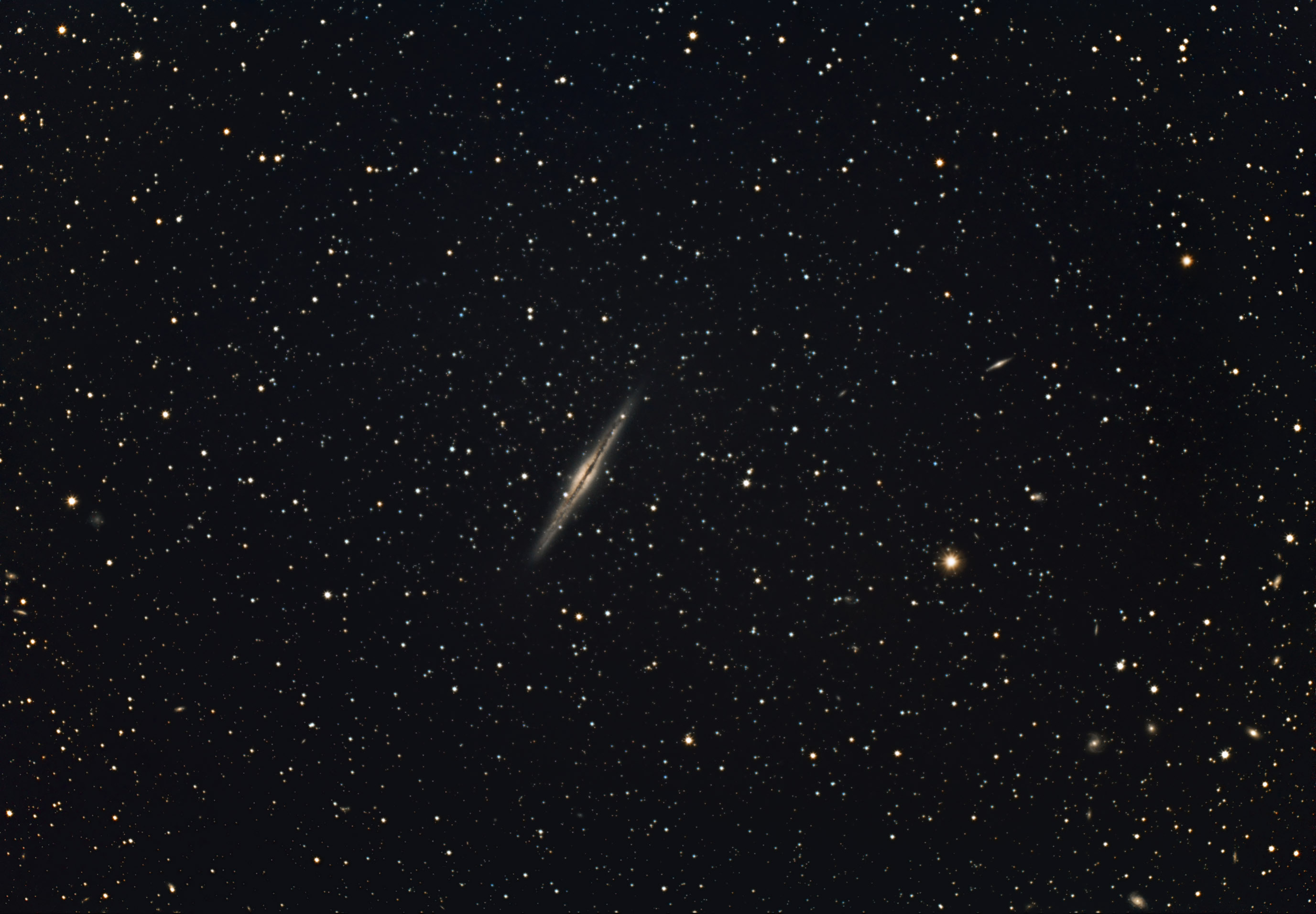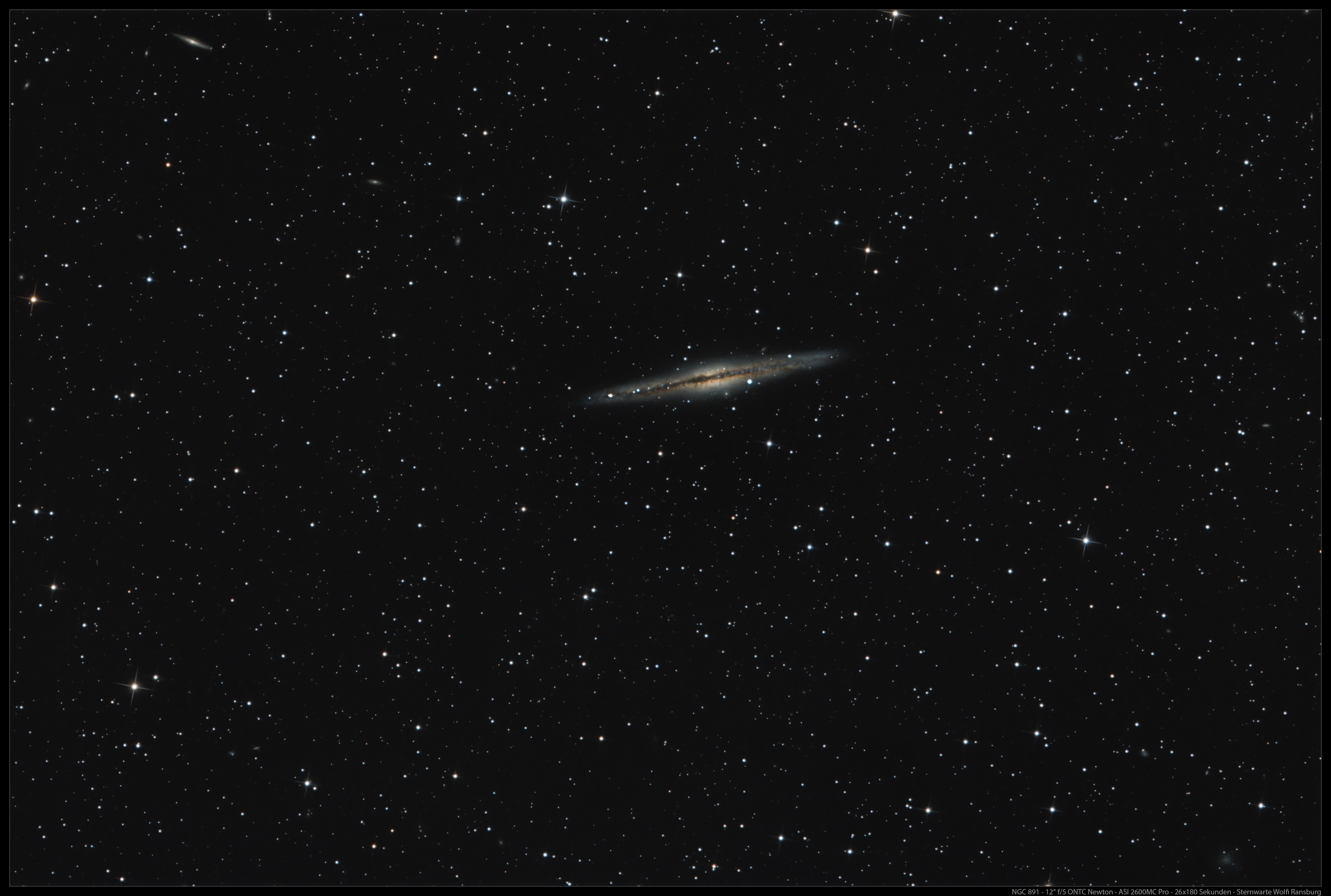 NGC 891 im Sternbild Andromeda ist eine klassische Edge-On Galaxie, sie ist genau von der Seite aus zu sehen. Gut sind die Dunkelregionen in der zentralen Achse der Galaxie zu sehen, die das Licht der Sterne verschlucken. Im Umfeld von NGC 891 sind viele kleinere Galaxien zu sehen.