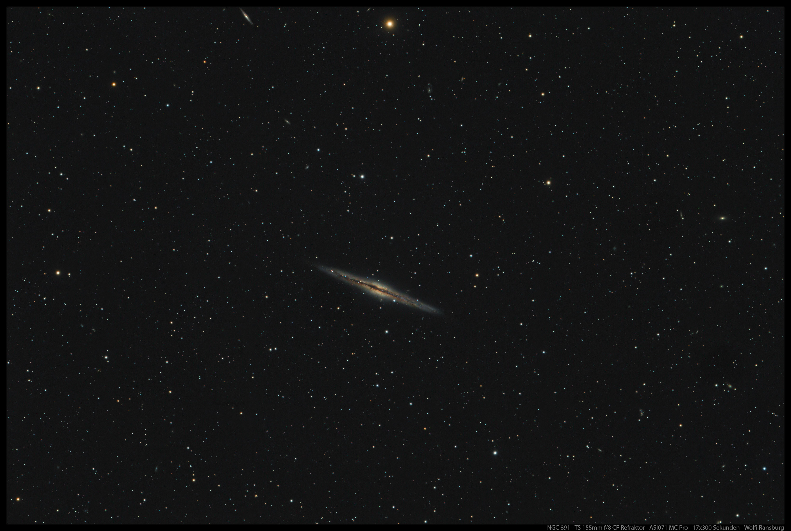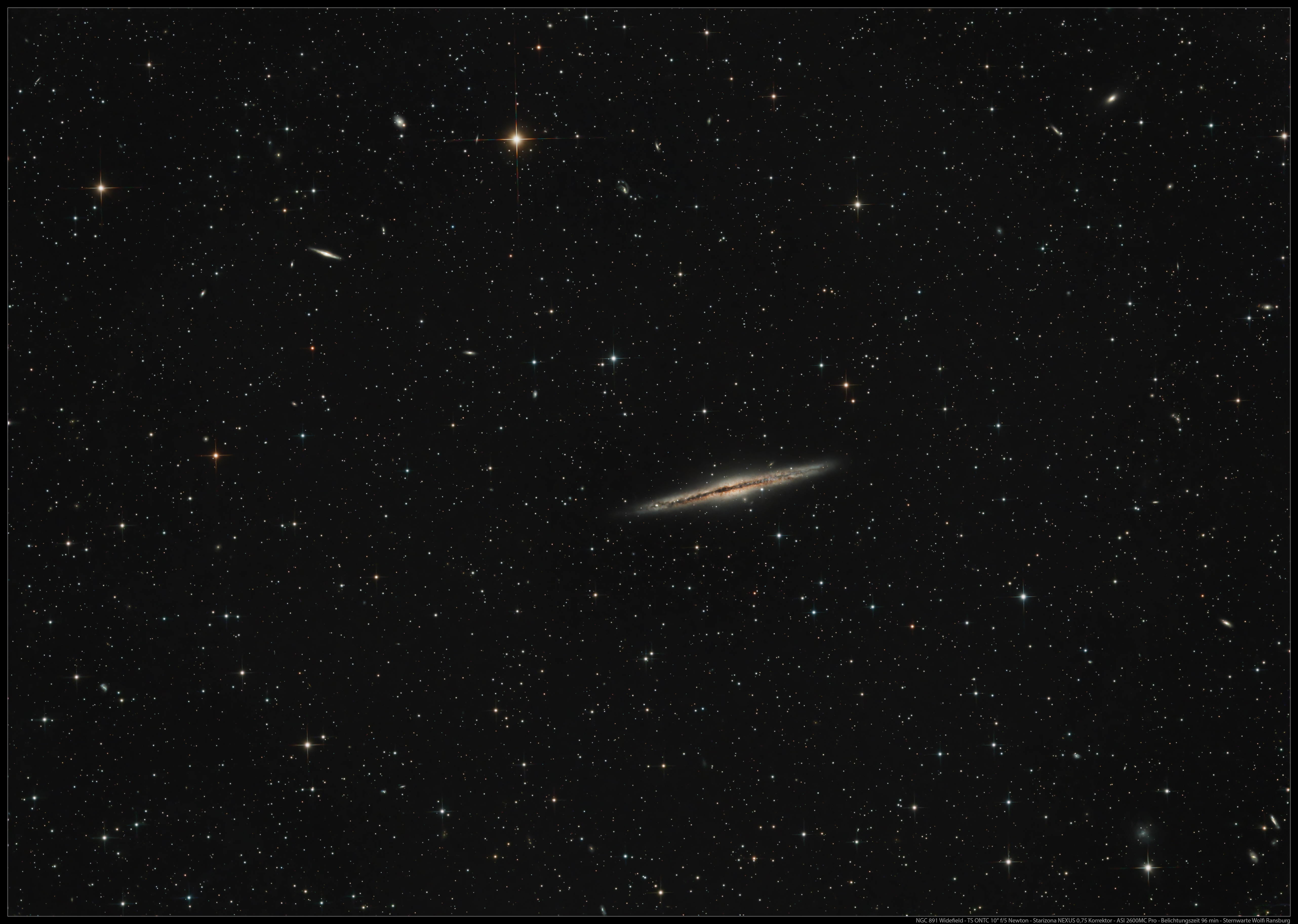 NGC 891 ist eine Edge-On Galaxie im Sternbild Andromeda. Man sieht genau auf die Kante der Galaxie. Schön ist die Ansammlung von Staub in der zentralen Achse der Galaxie zu sehen, die das Licht der Sterne schluckt. Spannend ist auch die Fülle von kleineren Galaxien in der Nähe von NGC 891.