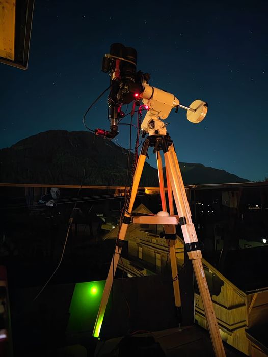 Die Aufnahme ist "First Light" mit meinem neuesten Sternwartenteleskop, den TS Photoline 140mm f/6.5 Triplet Apo. Die Bildfeldkorrektur und die Verkürzung der Brennweite wurde mit dem TS 0,74x Reducer/Korrektor bewerkstelligt.spontan haben Tino und ich unsere Nachbarn eingeladen, auf den Irschenberg zu fahren und einfach Sterne zu knipsen. Unser Ziel war es, einfach gemeinsam die Freude am "Fotografieren des Nachthimmels" weiterzugeben. Also keine "Technikschlacht" sondern einfach der Spaß steht im Mittelpunkt. Mit dabei sind unsere Skywatcher Star-Advernturer und meine alte H-EQ5 Synscan. Die Montierungen werden in der Dämmerung eingenordet und dann hat jeder einfach Freude und kann munter drauflos knipsen.