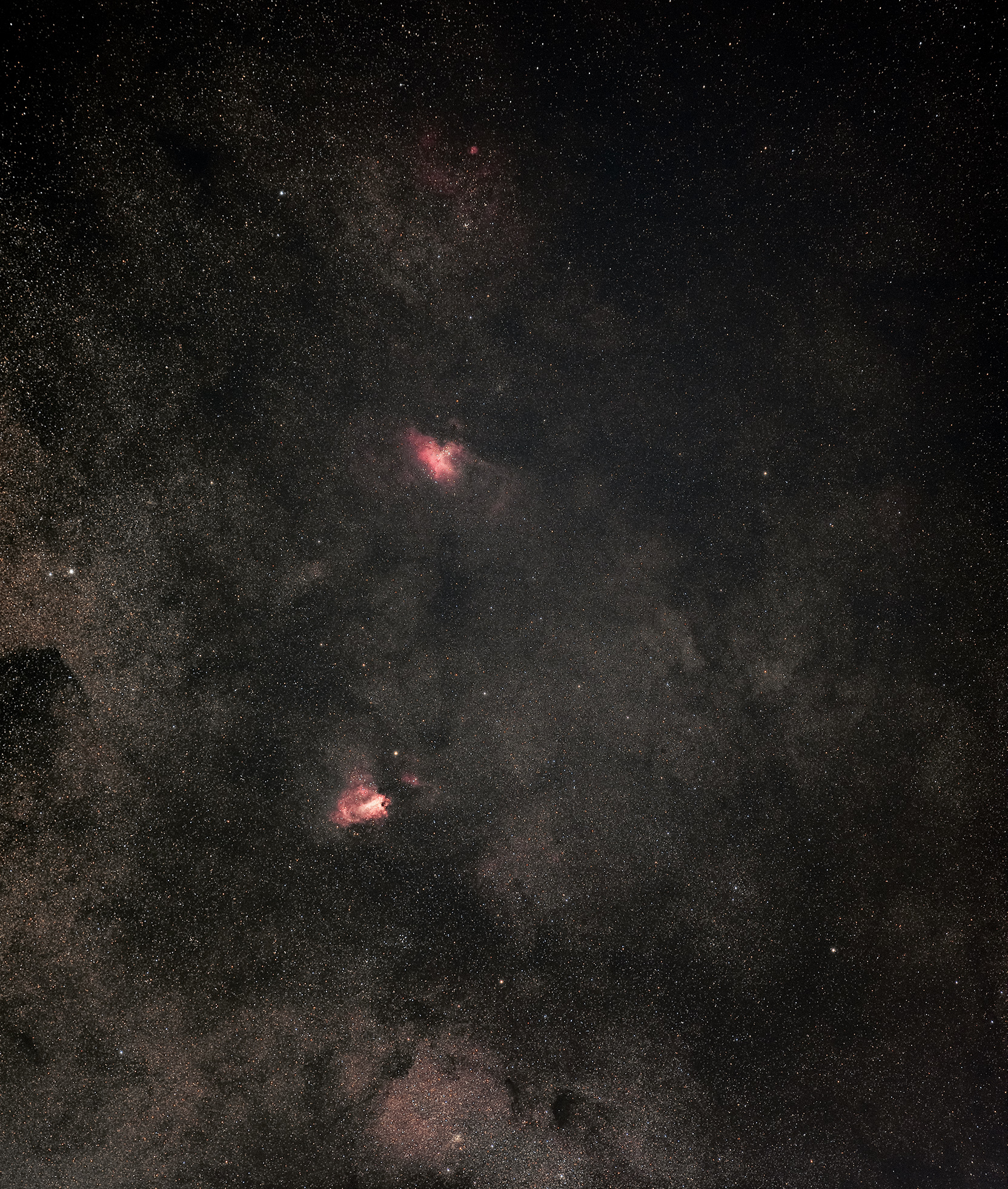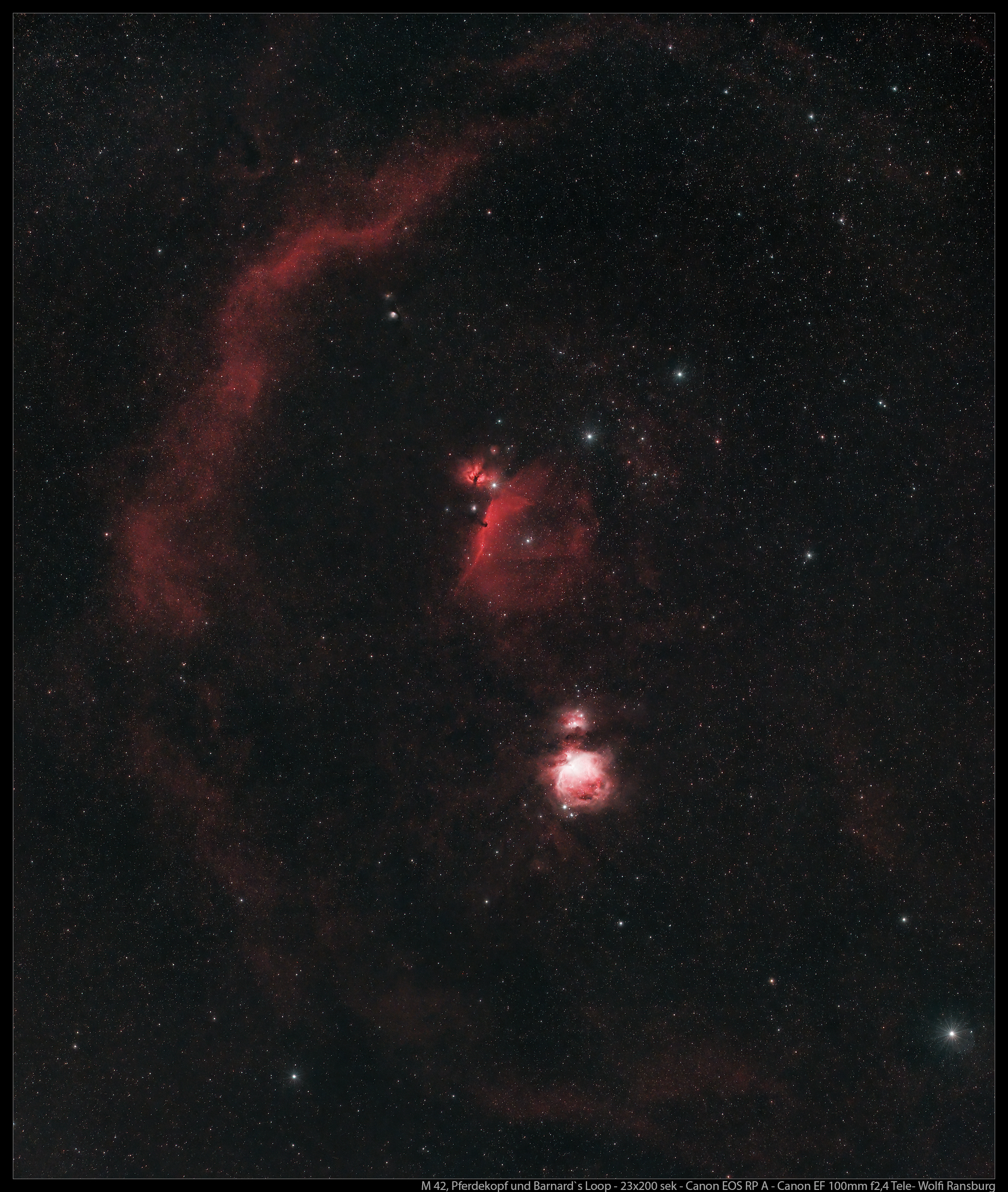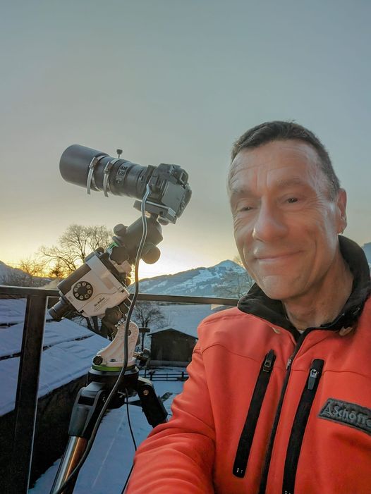 Nur 23x200 Sekunden haben gereicht, um das Objekt zu belichten. Da meine Location, nahe München, alles andere als dunkel ist, habe ich den Antlia ALP-5 Schmalband-Nebelfilter verwendet. Die Ausarbeitung war etwas aufwendiger, da durch den Schmalband Filter kaum die inneren Reflexionsanteile zu sehen waren. Ich musste also zwei getrennte Ausarbeitungen machen, in Pix, und diese dann im Photoshop kombinieren. Uff , ich war definitiv länger bei der Ausarbeitung, als bei der Belichtung...zwei Tage nach dem Vollmond wollte ich einfach mal wieder Astrofotografie machen und zwar mit richtig wenig Aufwand. Einfach den Star Adventurer auf die Terasse, mein Canon 100mm EF Tele und meine astromodifizierte Canon EOS RP und dann einfach mit einem guten Glas hinsetzen und 23x 200 Sekunden abdrücken .. dann noch ein paar Aufnahmen mit kürzerer Belichtungszeit nachlegen und fertig. Daß der "fast Vollmond" schon am Himmel war, hat mich nicht gestört. Bei der Ausarbeitung hingegen habe ich es gesehen. Da in Kirchberg (Tirol) noch gut Schnee gelegen ist, habe ich einen gigantischen Gradienten reinbekommen. Da habe ich ganz schön in die Trickkiste greifen müssen aber es hat recht gut geklappt. Und für gut 45 Minuten ist doch ein wenig rübergekommen. So macht Astrofotografie auch Spaß, ohne Aufwand, einfach genießen !! Es hat einfach viel Freude gemacht !