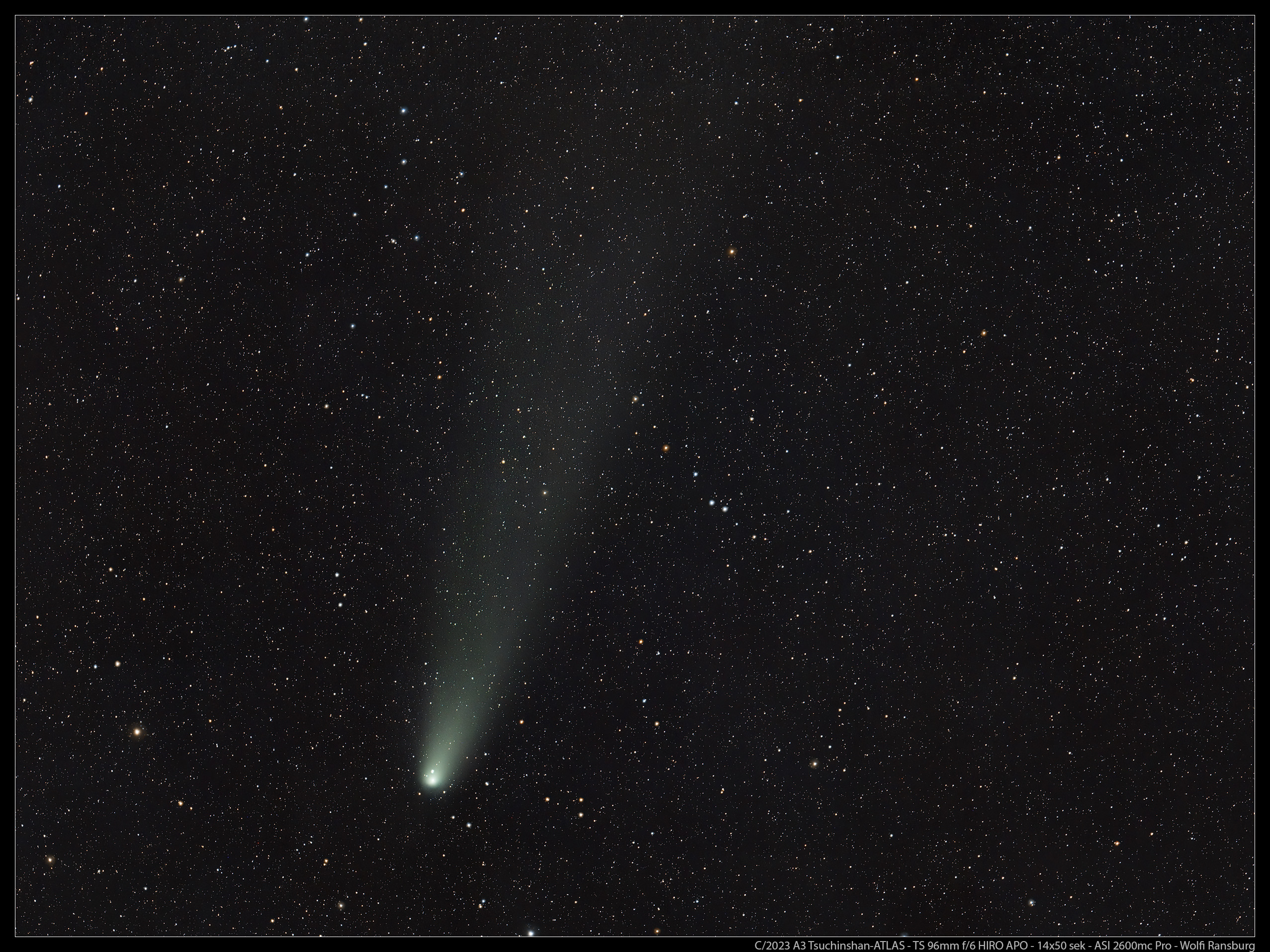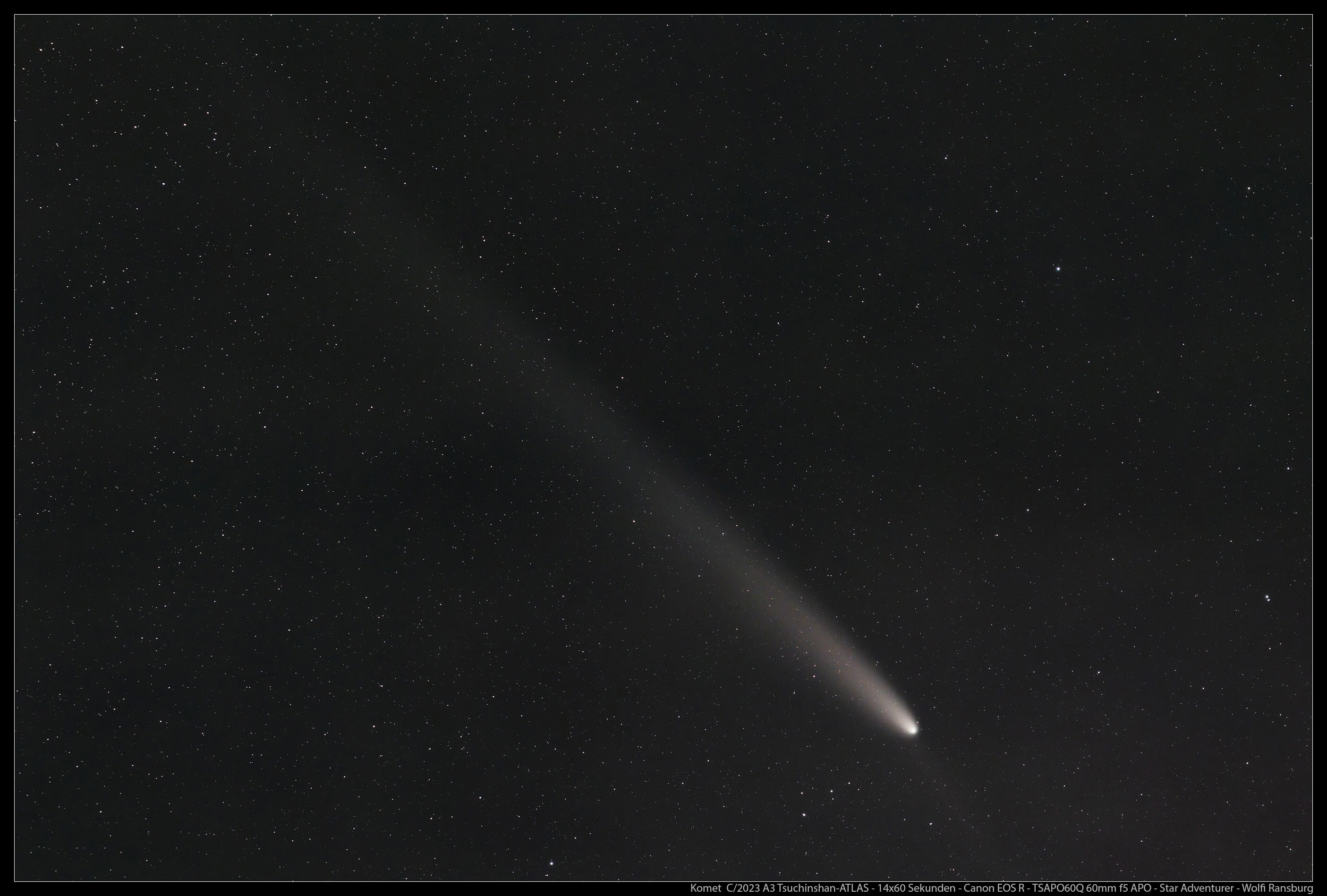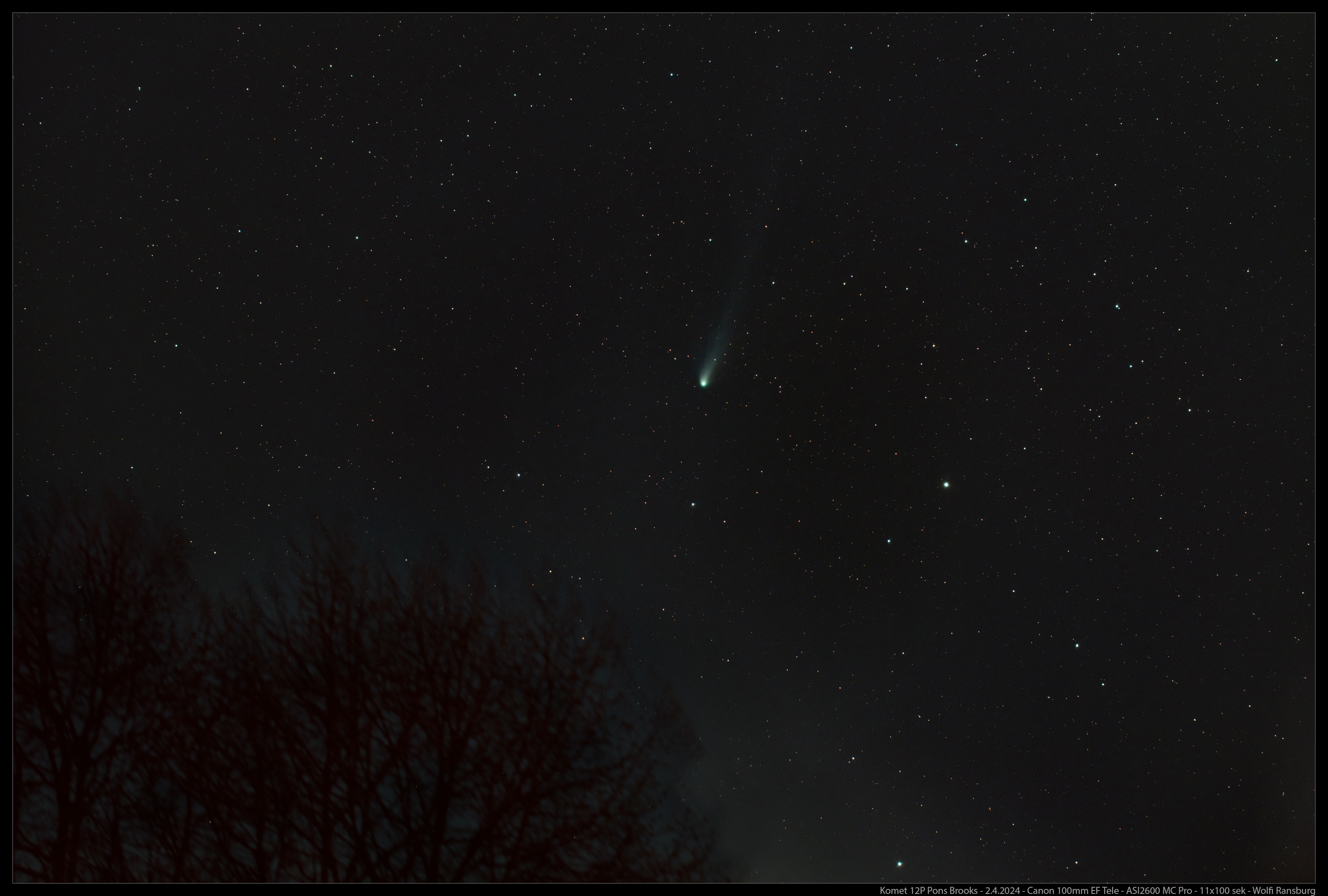 Am 2.4. war es recht klar und so habe ich mir auch mal einen Blick auf den Kometen gegönnt. Spontan habe ich den Star Adventurer auf meinen Balkon aufgestellt und das 100mm EF Tele von Canon draufgeschnallt mit meiner ASI2600MC Pro und 11x100 Sekunden draufgehalten. Die Position des Kometen zum Baum im Vordergrund ist real. Ich habe einfach den Vordergrund der letzten Aufnahme genommen und den verschwommenen Vordergrund durch den Baum ersetzt. Ansonsten habe ich nicht allzuviel Nachbearbeitung investiert.