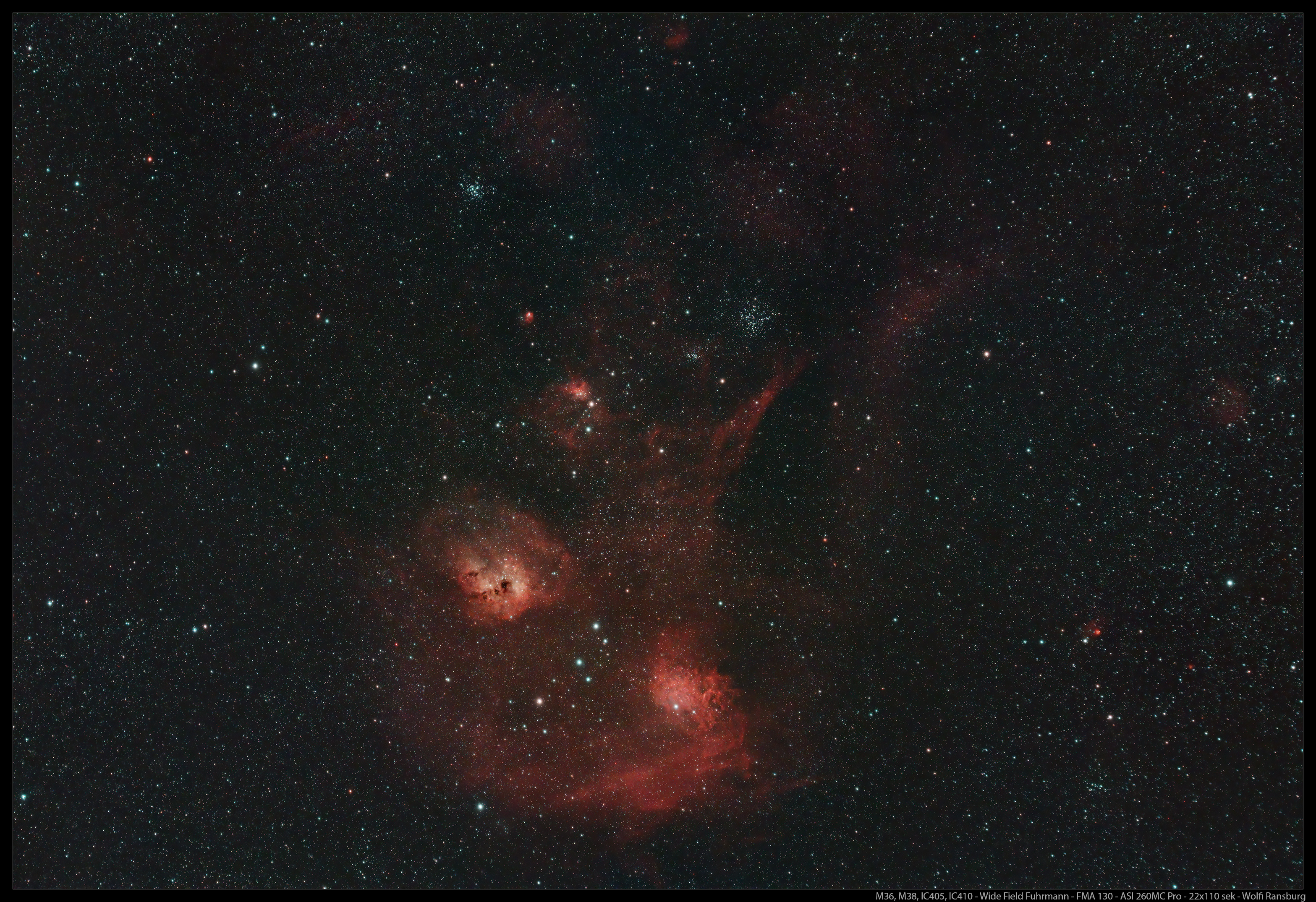 Im Sternbild Fuhrmann befindet sich der lichtschwache Emissionsnebel IC 410. Der Nebel ist aber reich an Filamenten. Besonders markant sind die beiden kaulquappenförmigen Nebel in der Bildmitte. Das ist ein Ort, in dem zur Zeit Sterne entstehen. Diese beiden Nebel sind etwa 10 Lichtjahre groß.