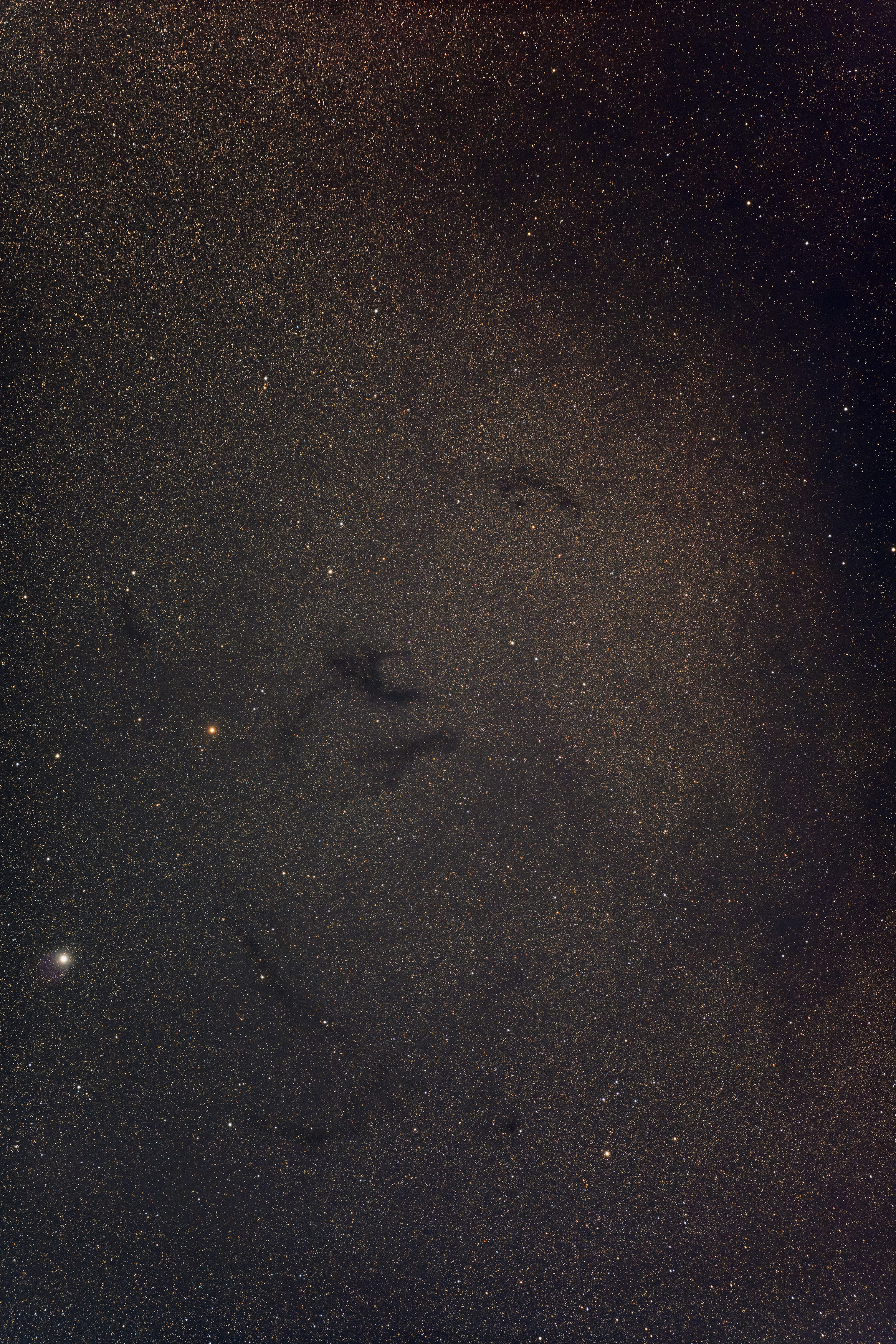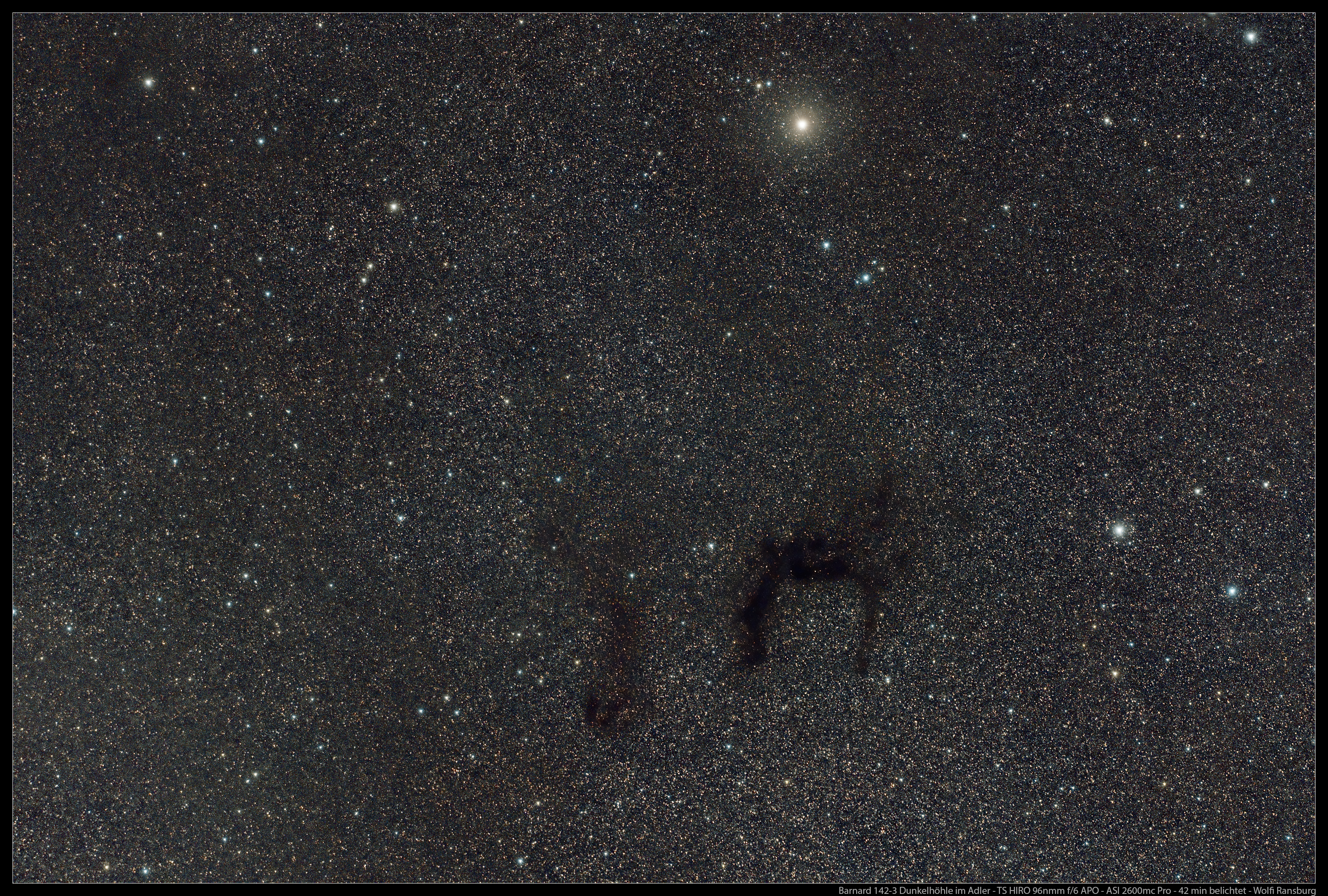 Die Dreiteilige Dunkelhöhle im Adler (Barnard 142-3) ist ein Dunkelnebel, eine Staubwolke, die kaum Licht ausstrahlt oder reflektiert. Erst längere Belichtungen bei erstklassigem Himmel lassen erahnen, daß auch diese Dunkelwolke kein "Loch" in den Sternen ist, sondern eine kühle große Gaswolke, die das Licht der dahinterliegenden Sterne verschluckt.
