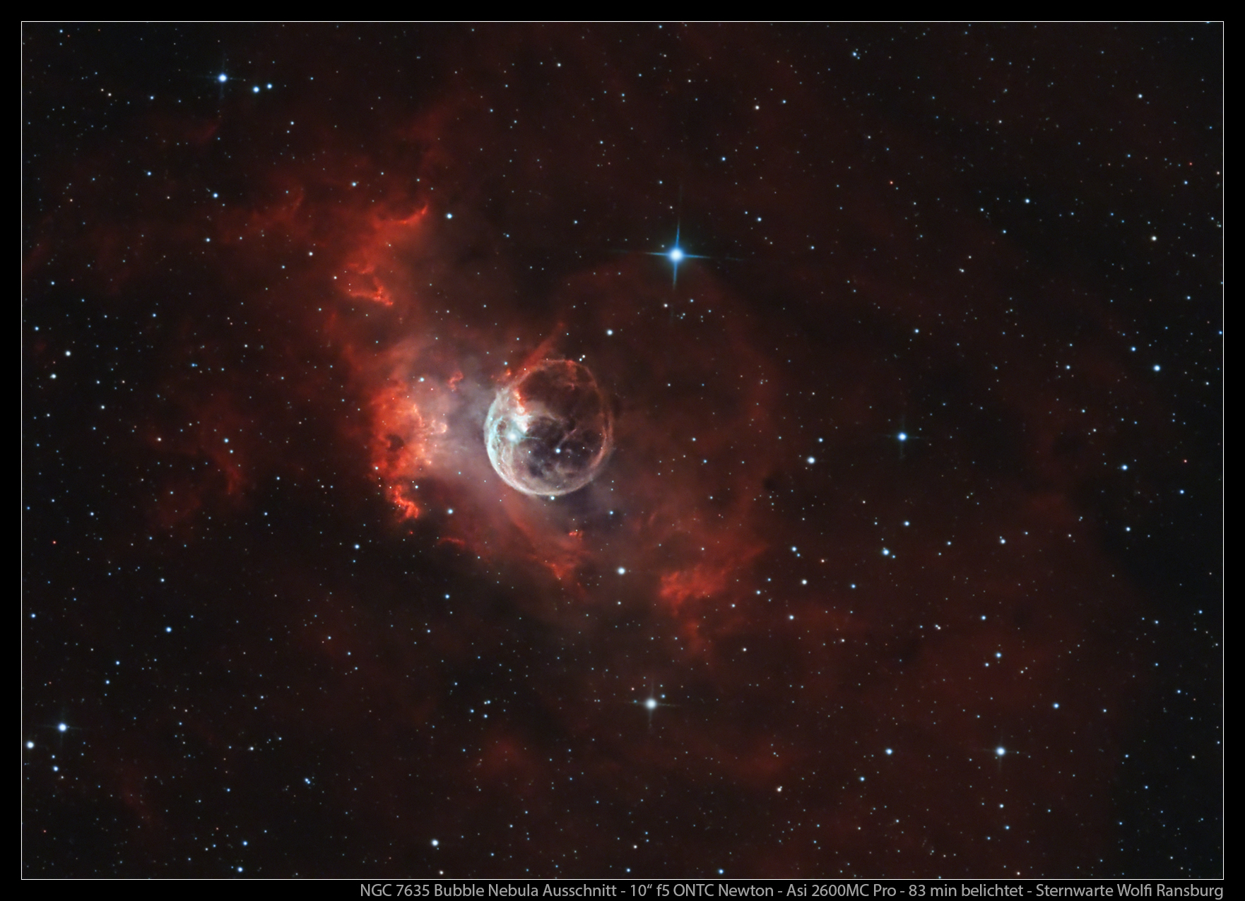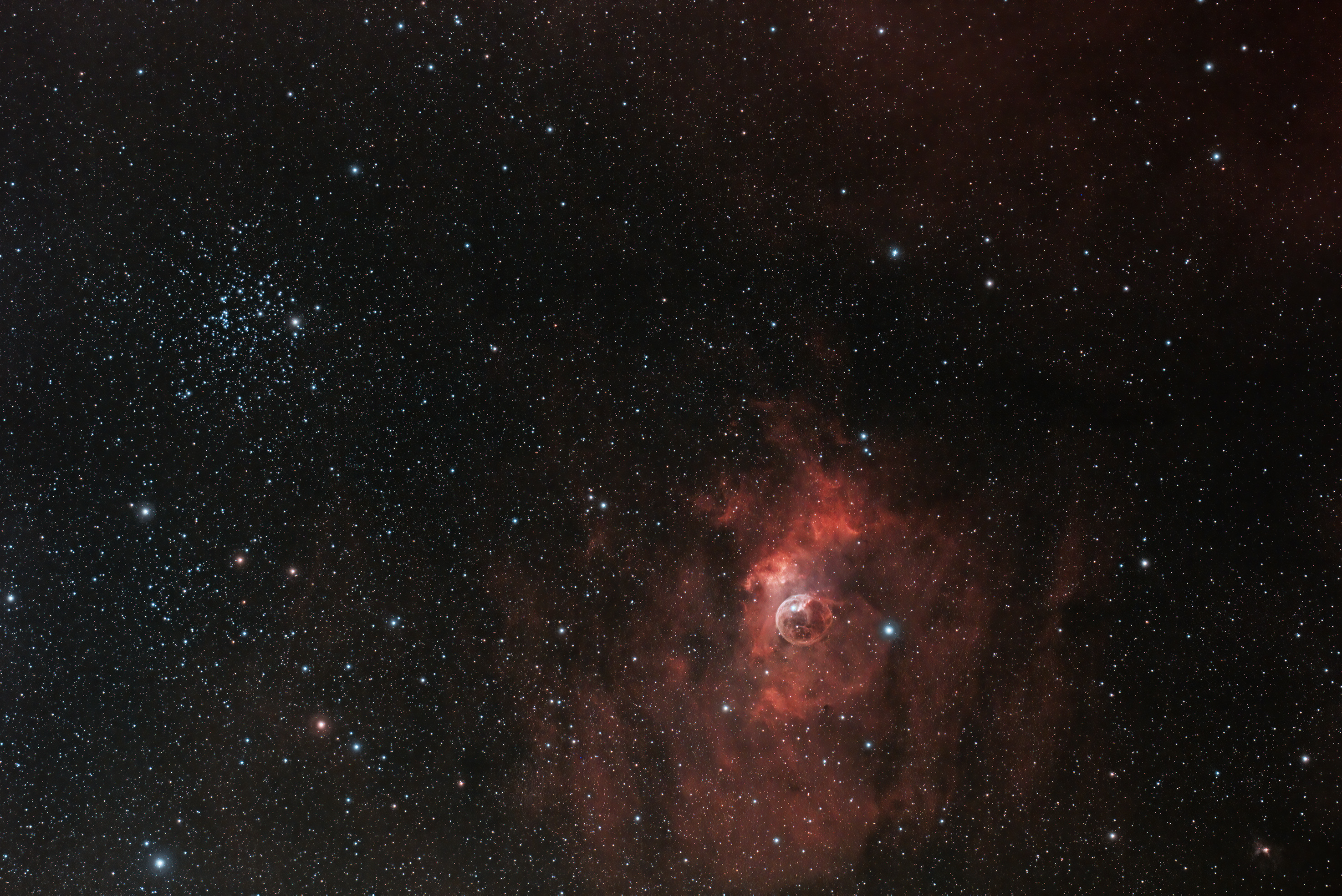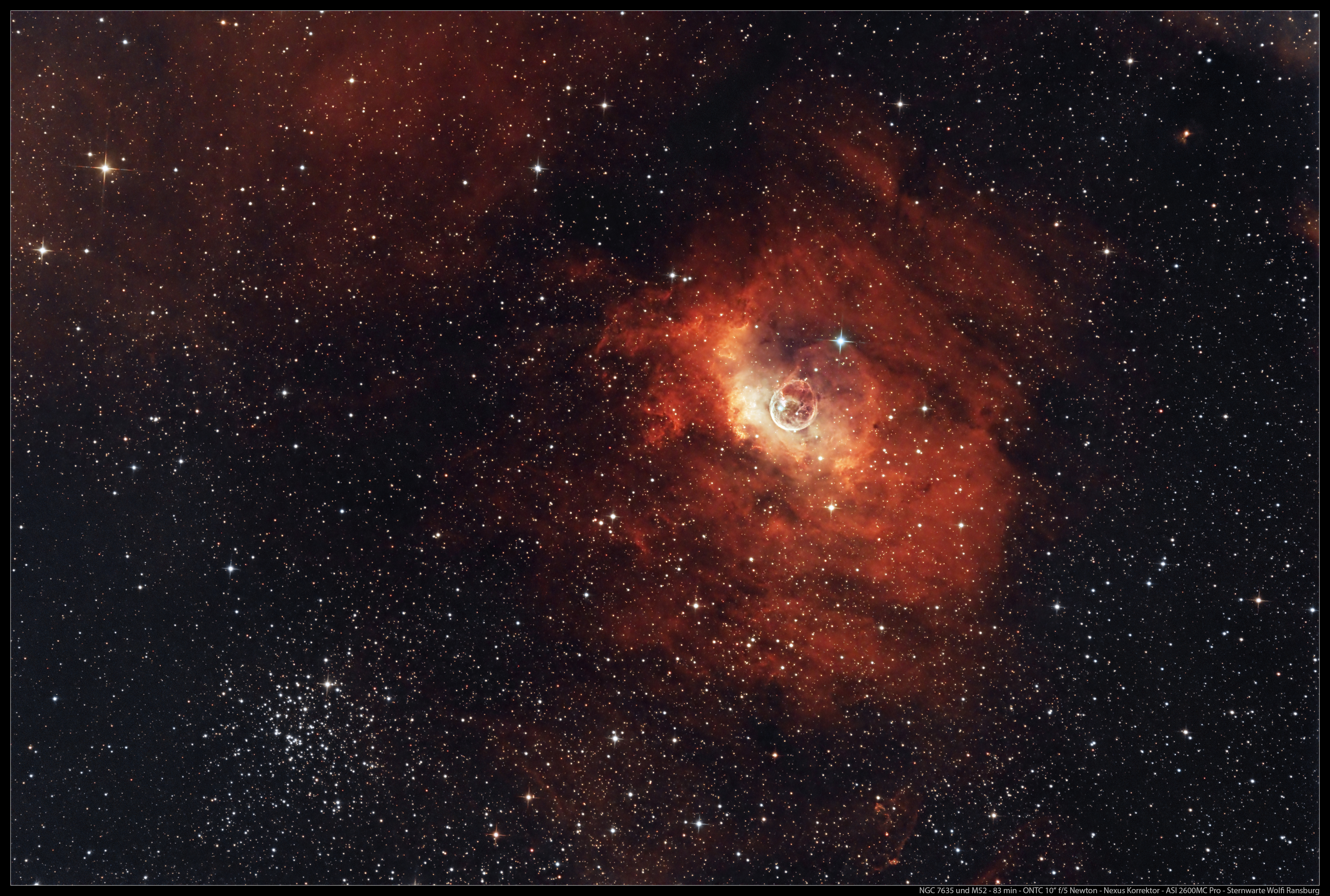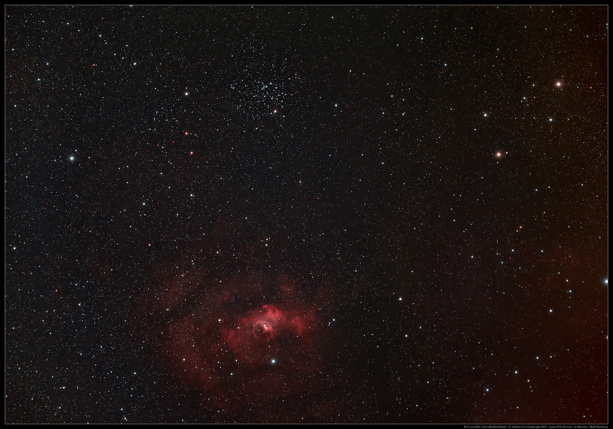 Eine schöne Region im Sternbild Cassiopeia .. ein Gasnebel mit spannenden Strukturen, der Bubble Nebel, in dichter Nachbarschaft zum offenen Sternhaufen M52. Diese Region liegt inmitten der Milchstraße. Auf der rechten Bildseite sieht man die Ausläufer einer wesentlich größeren aber lichtschwächeren Nebelregion.