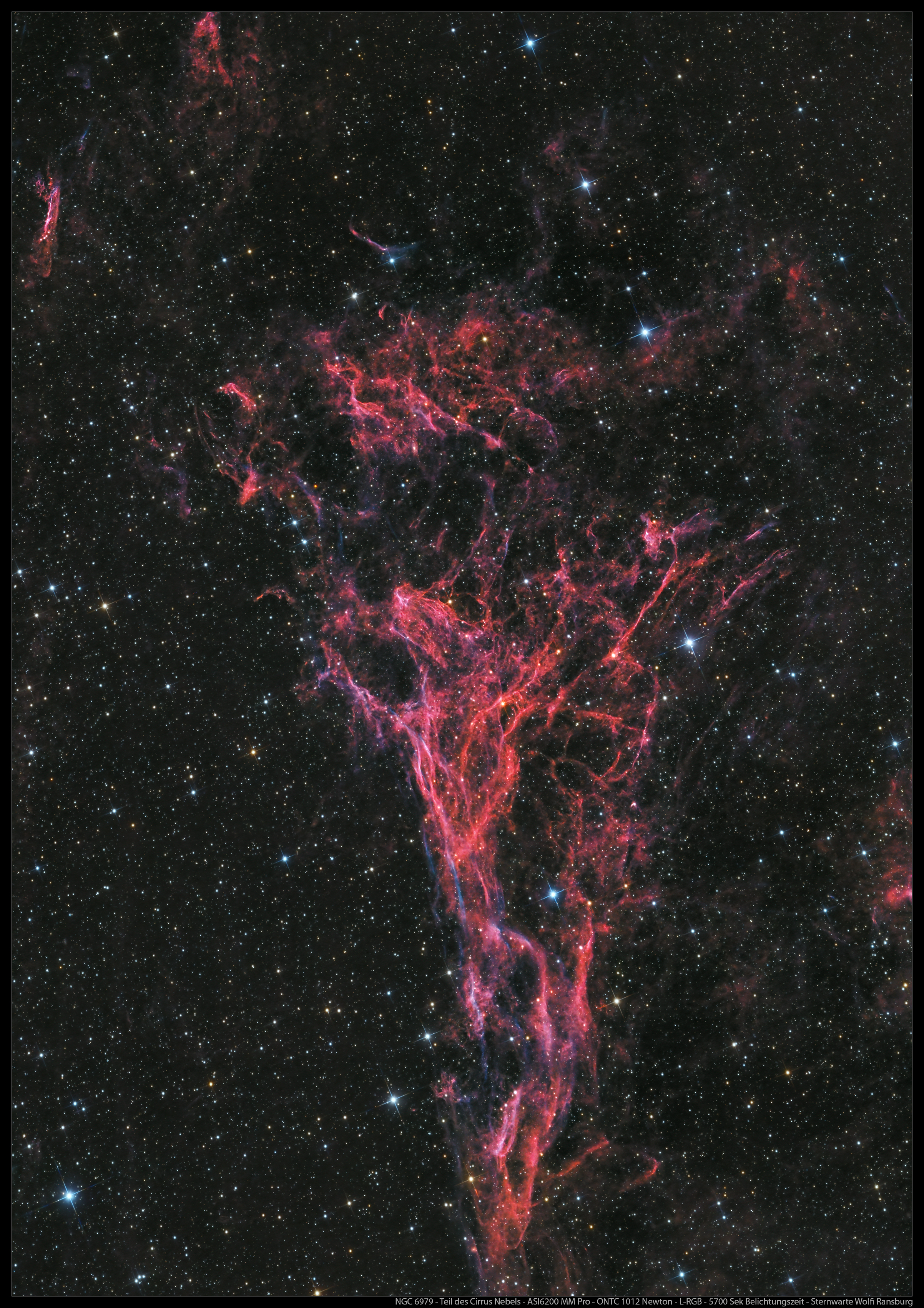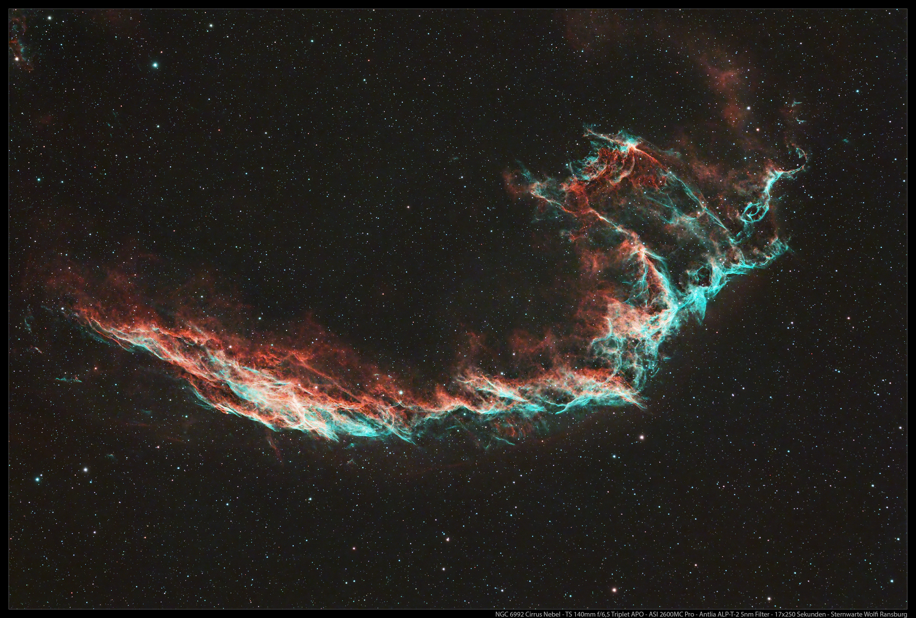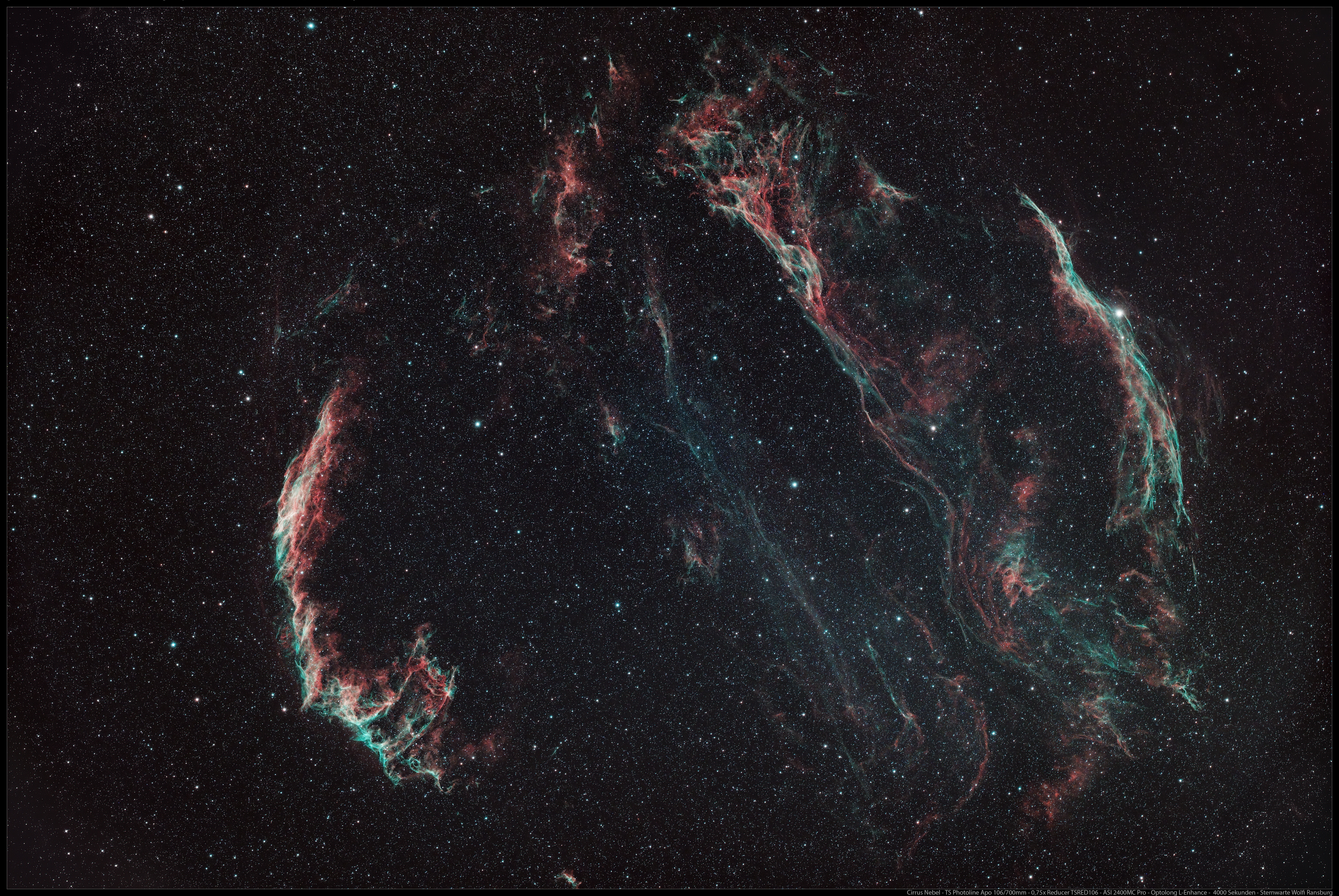 Diese Aufnahme ist eine Premiere mit meinem neuen TS Photoline 106mm f/6.6 Apo und dem 0,75x Reducer. Die Sternabbildung dieses Objektives ist wirklich fein.Der Cirrusnebel ist ein Supernova Überrest im Sternbild Schwan. Dieser recht Nebel ist der Überrest einer Sternexplosion (Supernova), die vor etwa 8000 Jahren stattgefunden hat. Die hauchzarten Filamente stammen von diesem Stern und entfernen sich seitdem mit hoher Geschwindigkeit vom Ursprung der Explosion.