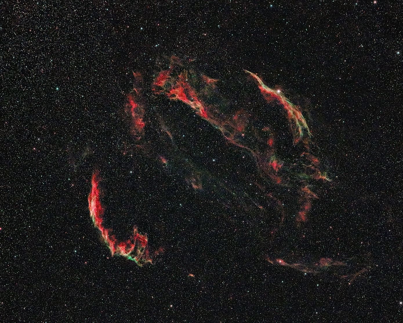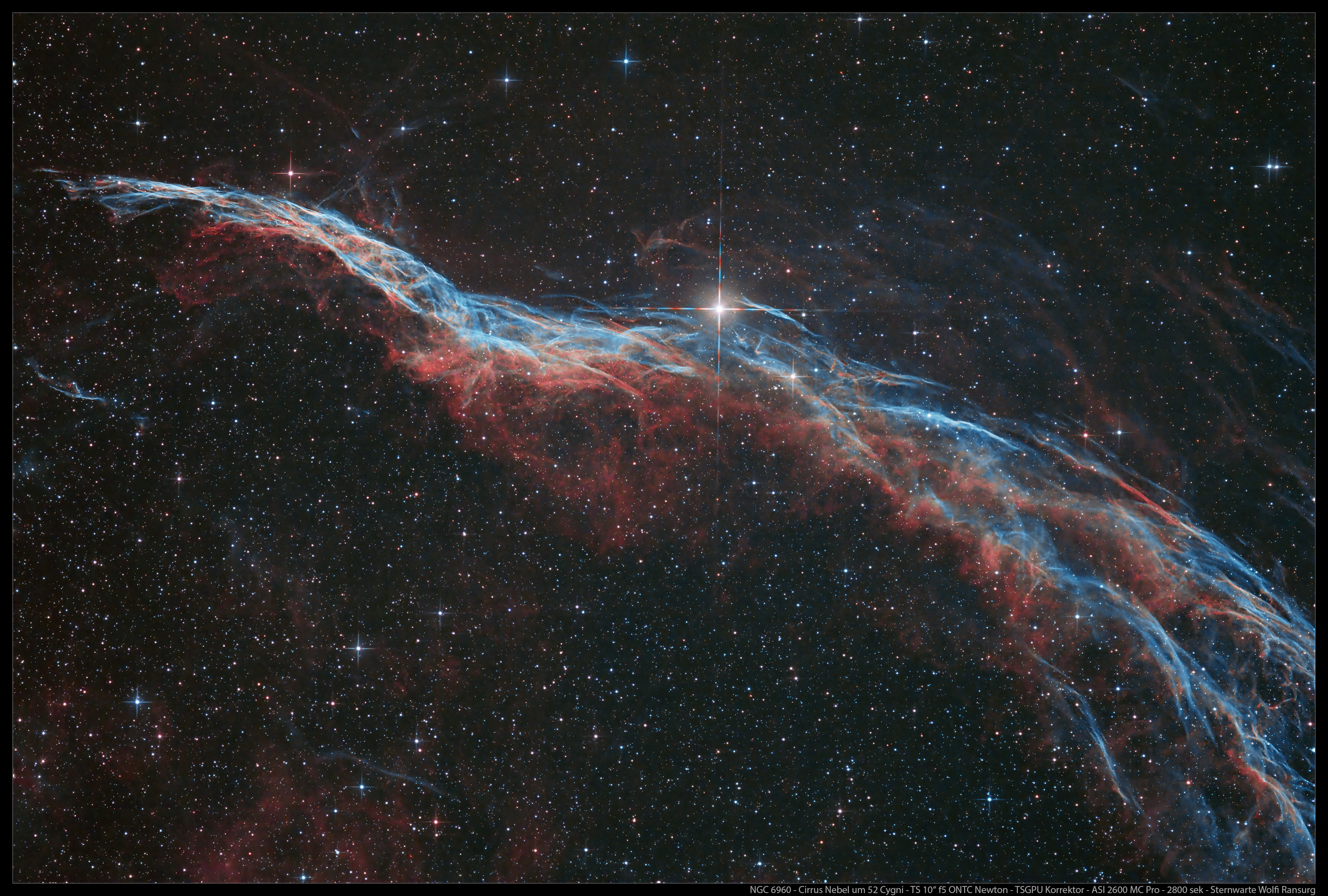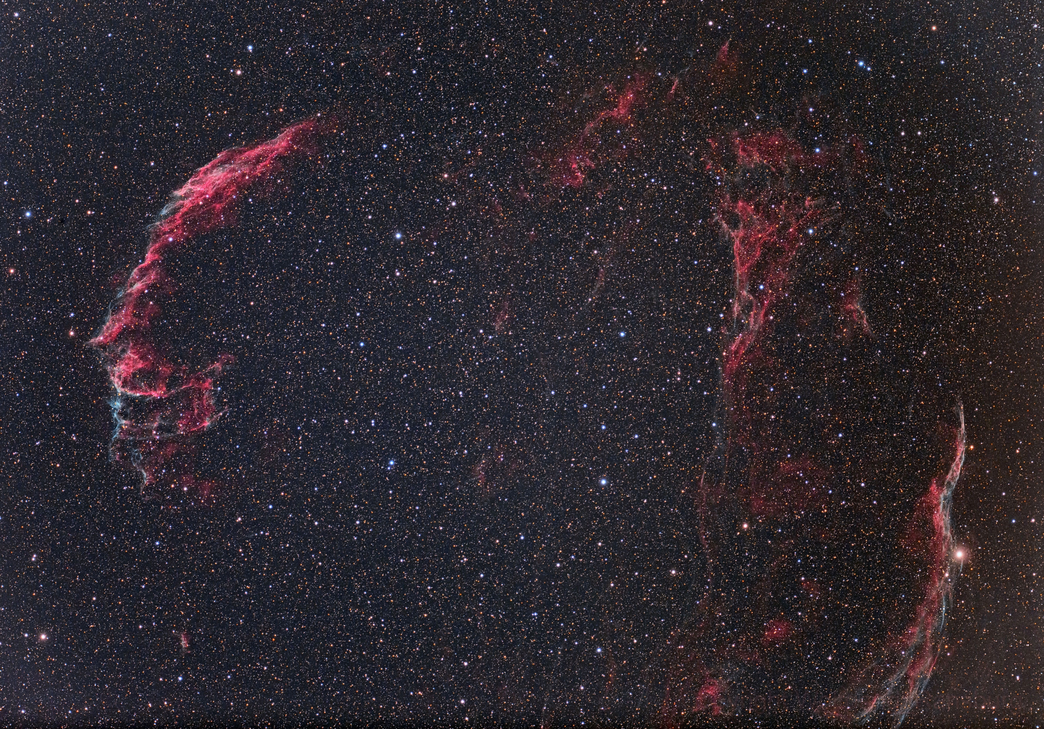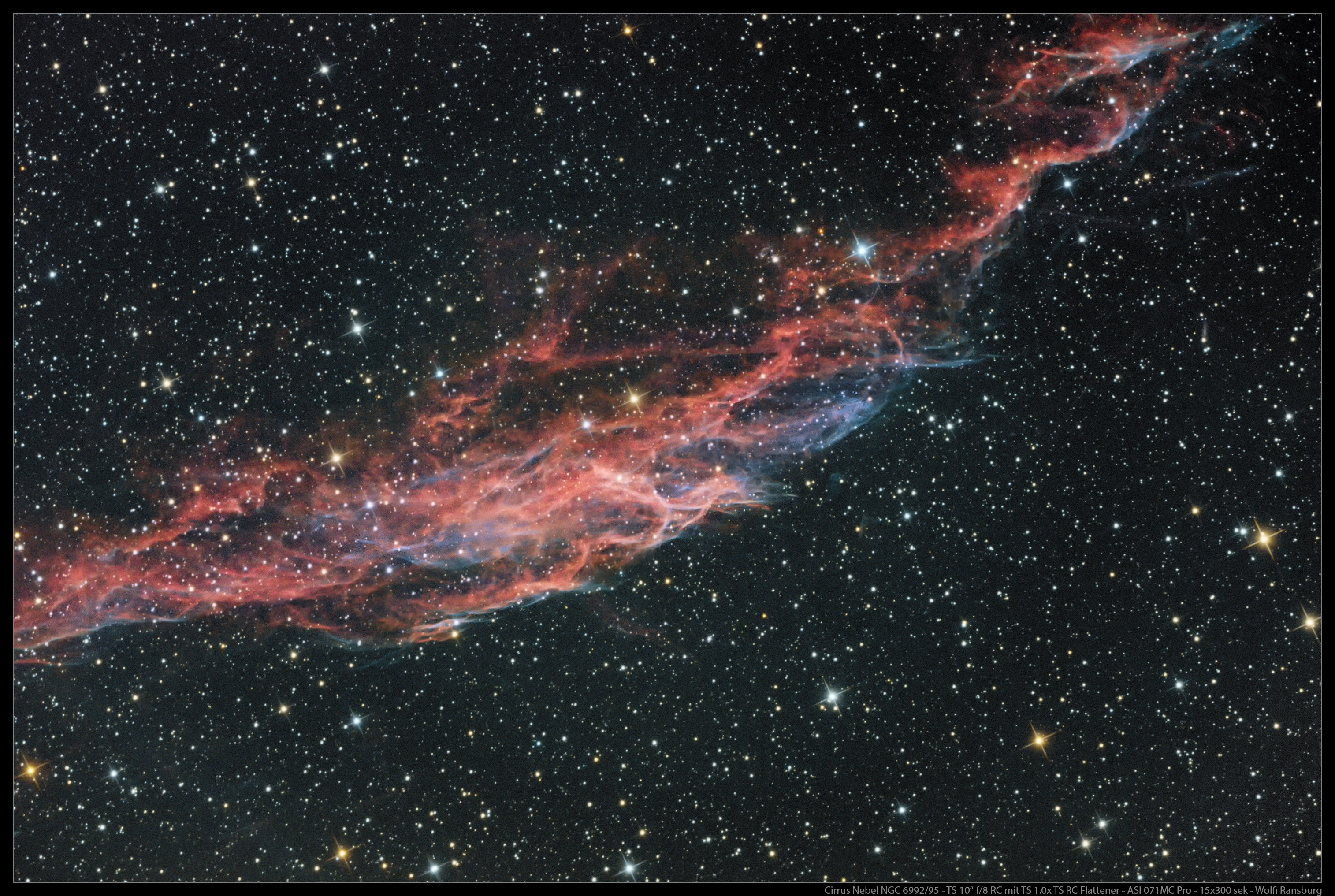 Diese Aufnahme ist eine Premiere mit meinem neuen TS Photoline 106mm f/6.6 Apo und dem 0,75x Reducer. Die Sternabbildung dieses Objektives ist wirklich fein.Der Cirrusnebel ist ein Supernova Überrest im Sternbild Schwan. Dieser recht Nebel ist der Überrest einer Sternexplosion (Supernova), die vor etwa 8000 Jahren stattgefunden hat. Die hauchzarten Filamente stammen von diesem Stern und entfernen sich seitdem mit hoher Geschwindigkeit vom Ursprung der Explosion.