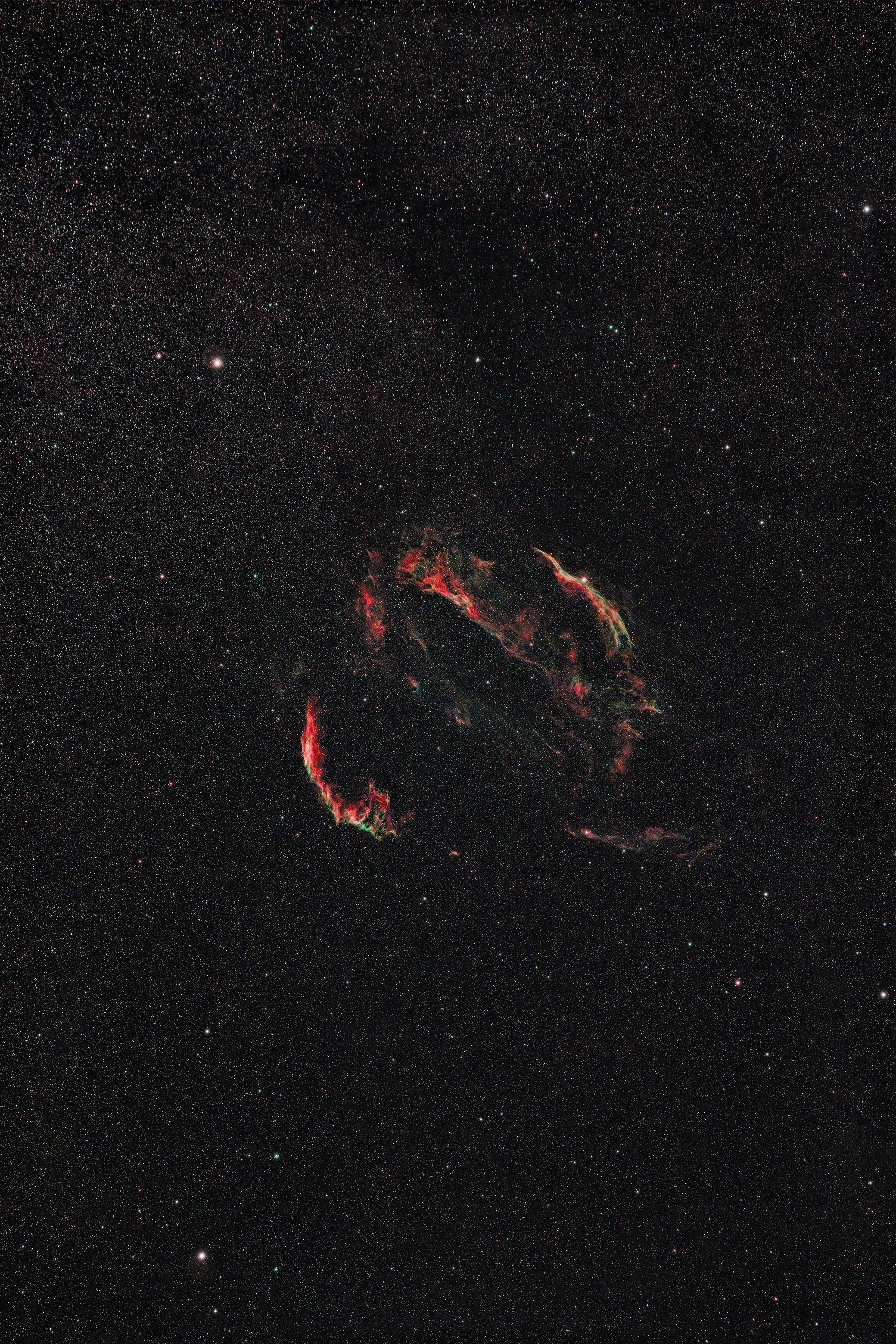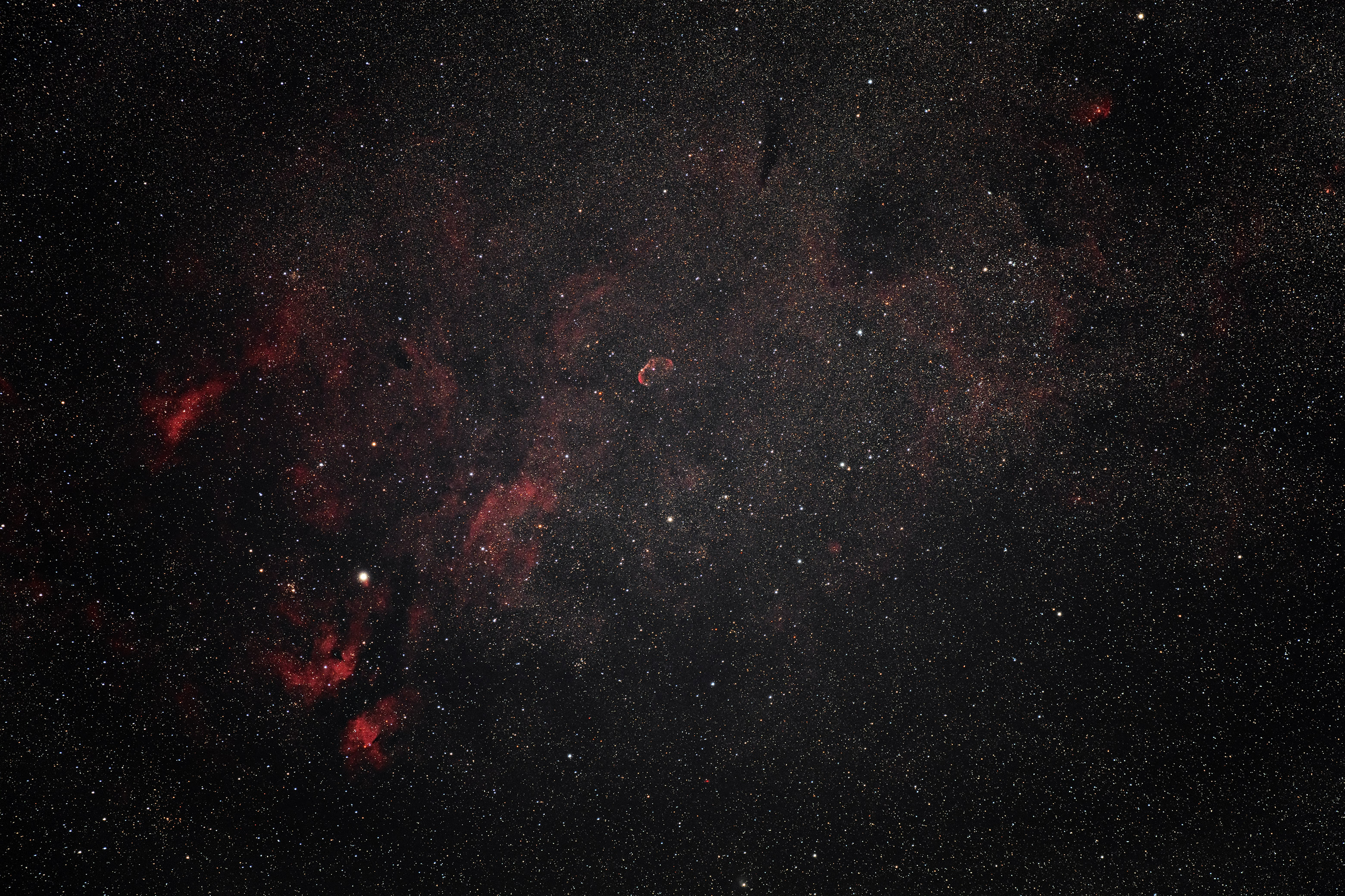 Ich habe meine alte H-EQ5 Montierung am Balkon aufgebaut, eigentlich nur um zu testen, wie alles funktioniert. Nachgeführt wurde das ACL200 APO Tele Objektiv mit meinem alten 70/500 Refraktor auf einer Doppelbefestigung. Die Nacht war alles andere als gut, für Kirchberger Verhältnisse, es war sehr dunstig aber zum Testen absolut OK. Für mich ist es vor allem um die Frage gegangen, ob Astrofotografie am Holzboden der Terasse geht. Nun ich denke, der Test ist bestanden. Belichtung 22x200 sek. mit astromodifizierter Canon EOS RP Sharpstar APO Tele 200mm f4 Montierung H-EQ5 unmodifiziert Leichter Nebelfilter von Idas (Breitband) LPS-PsDer Cirrusnebel ist immer ein dankbares Objekt für Schmalband Fotografie. Die feinen Strukturen des Supernova Überrestes sind bemerkenswert.