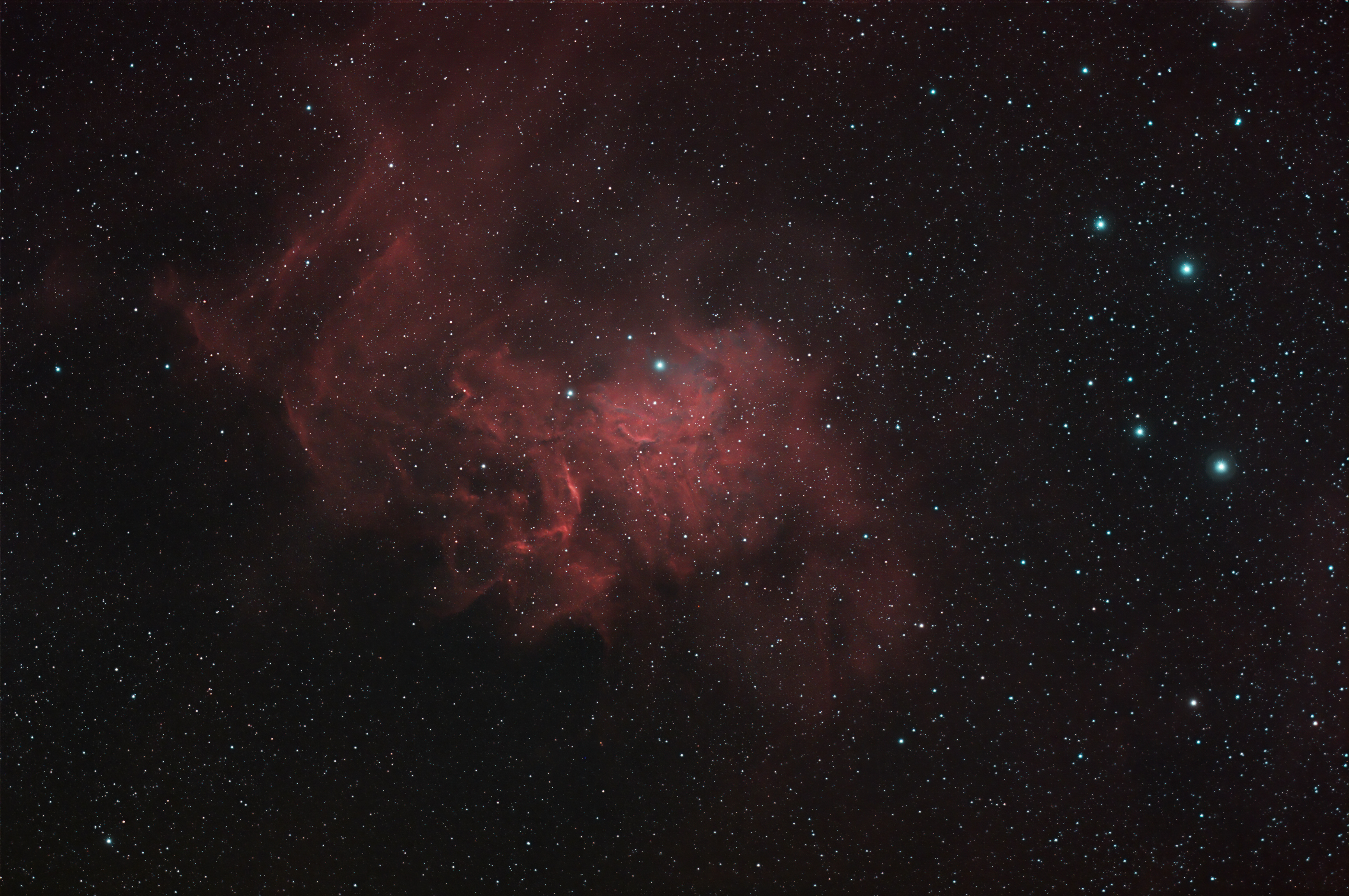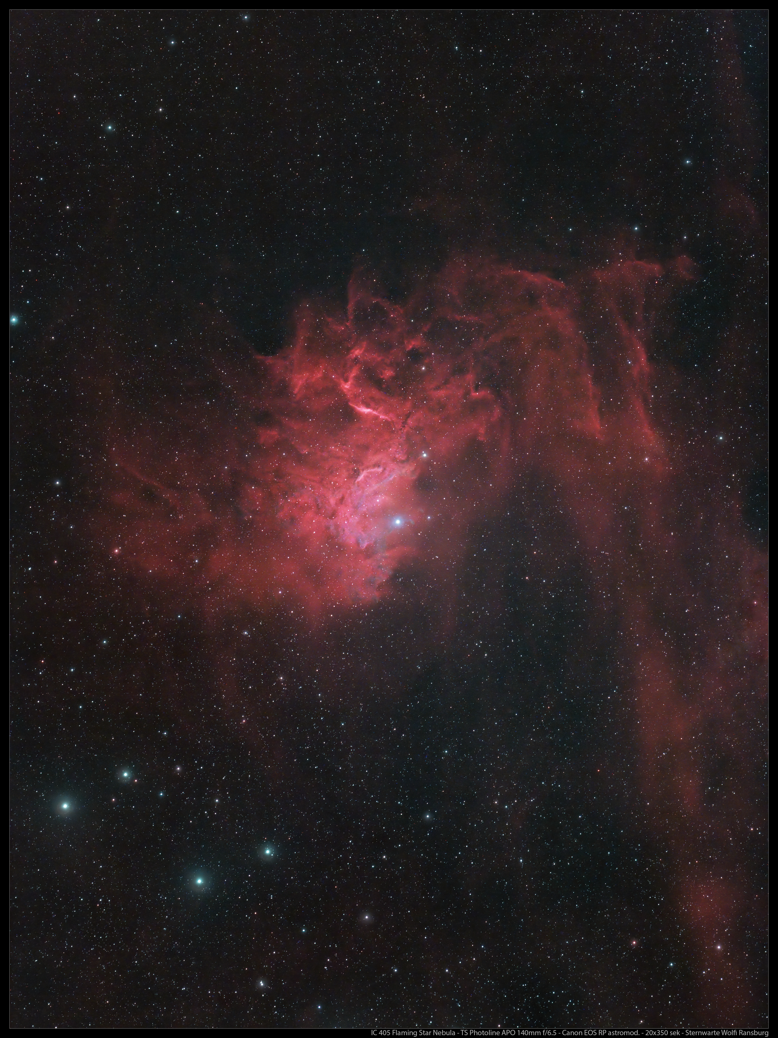 Der Flaming Star Nebel ist ein schönes Beispiel für einen Emissionsnebel mit eingelagerten Reflexionsanteilen. Der rote Anteil des Nebels wird durch den hellen Stern AE Auriga zum leuchten anregt. Die eingelagerten blauen Nebelstrukturen reflektieren das blaue Licht des Sterns.