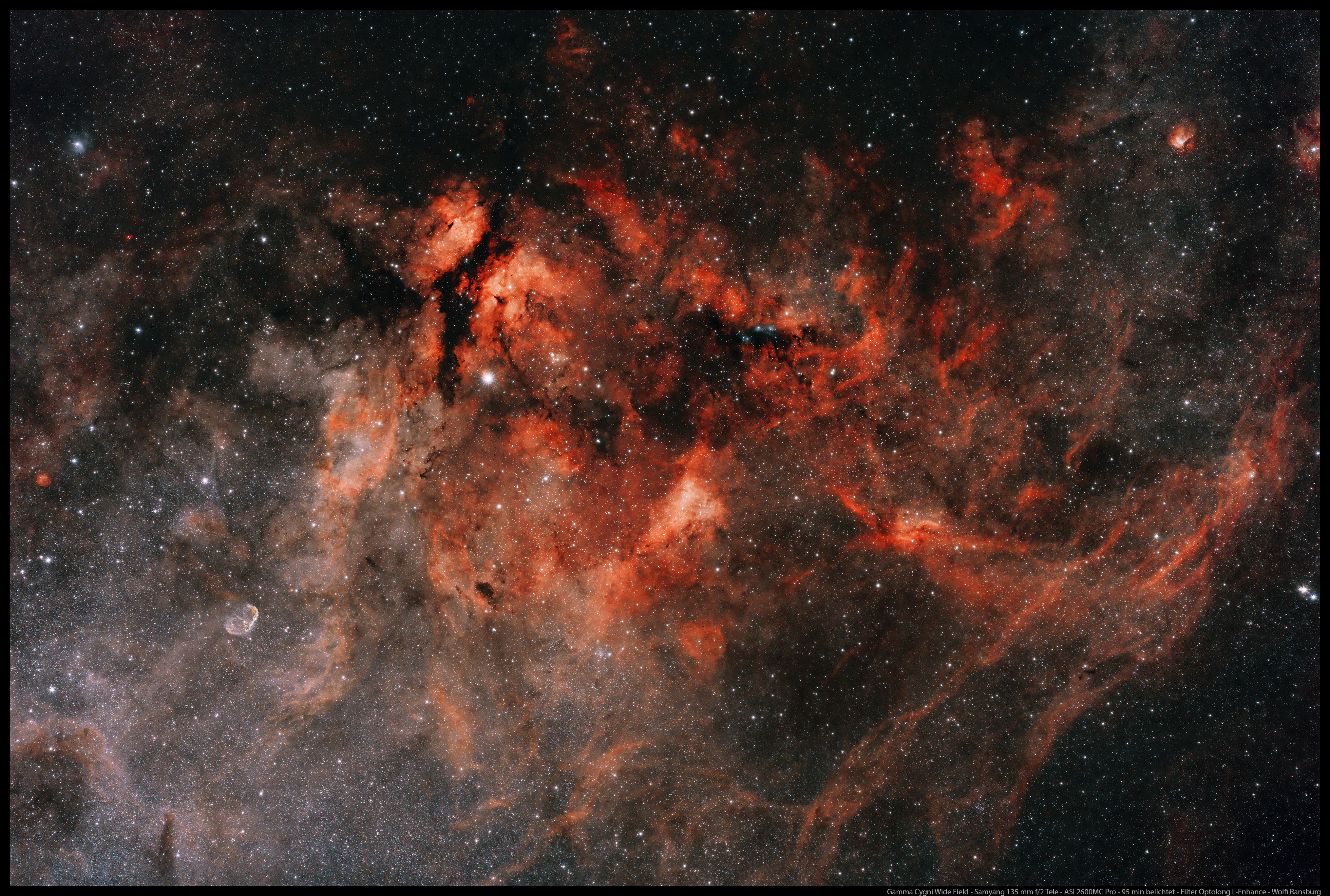 Gamma Cygni ist einer der hellsten Sterne des Sternbildes Schwan. Das Sternbild liegt inmitten der nördlichen Milchstraße. Entsprechend hoch ist die Konzentration der Nebel. Gamma Cygni ist der helle Stern in der linken Bildecke und der Nebel darunter ist der bekannte Schmetterlingsnebel oder IC 1318. Der markante halbbogenförmige Nebel in der Bildmitte ist der Cresent Nebel oder NGC 6888, ein reich strukturierter Gasnebel, der auch für größere Brennweiten gut geeignet ist.