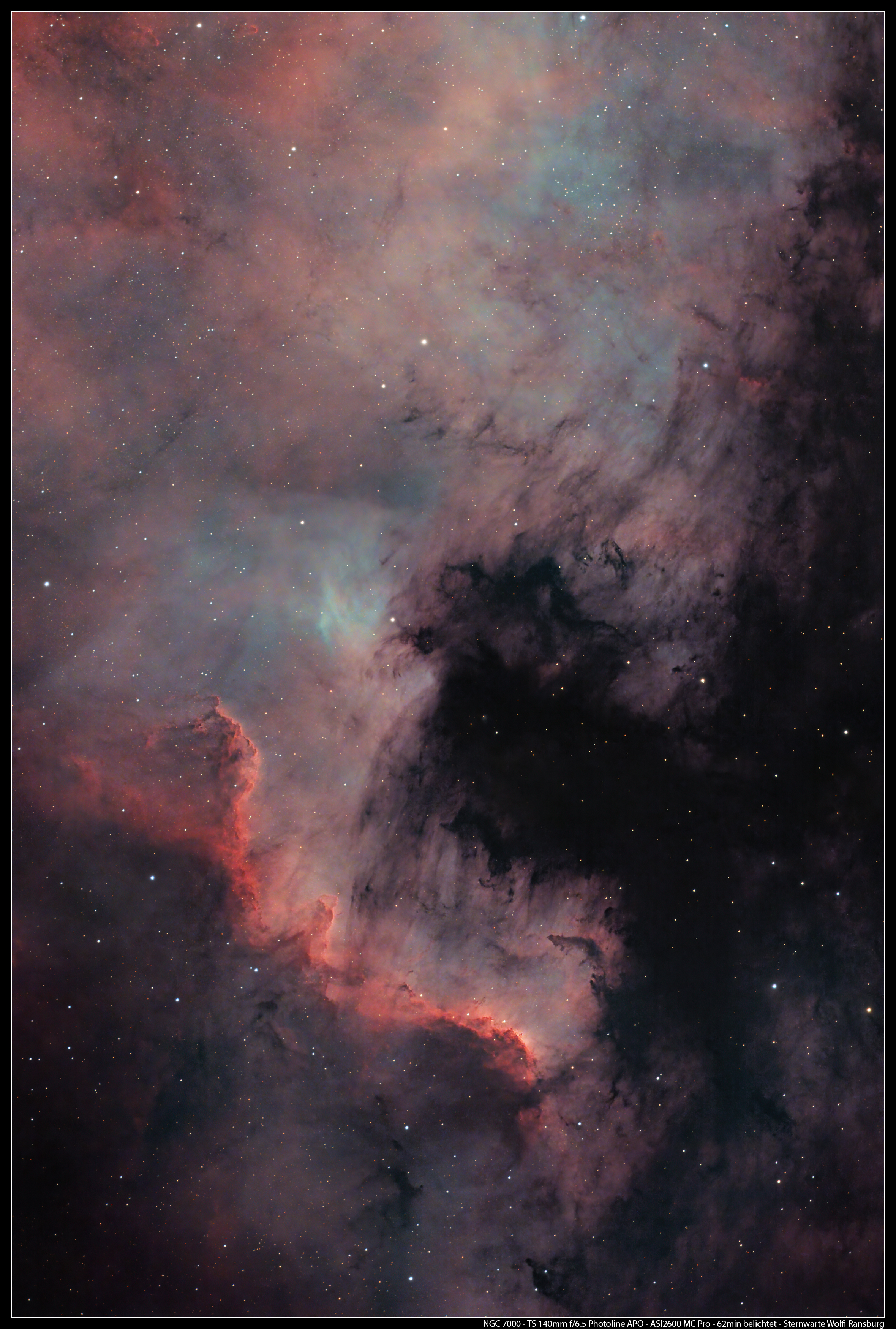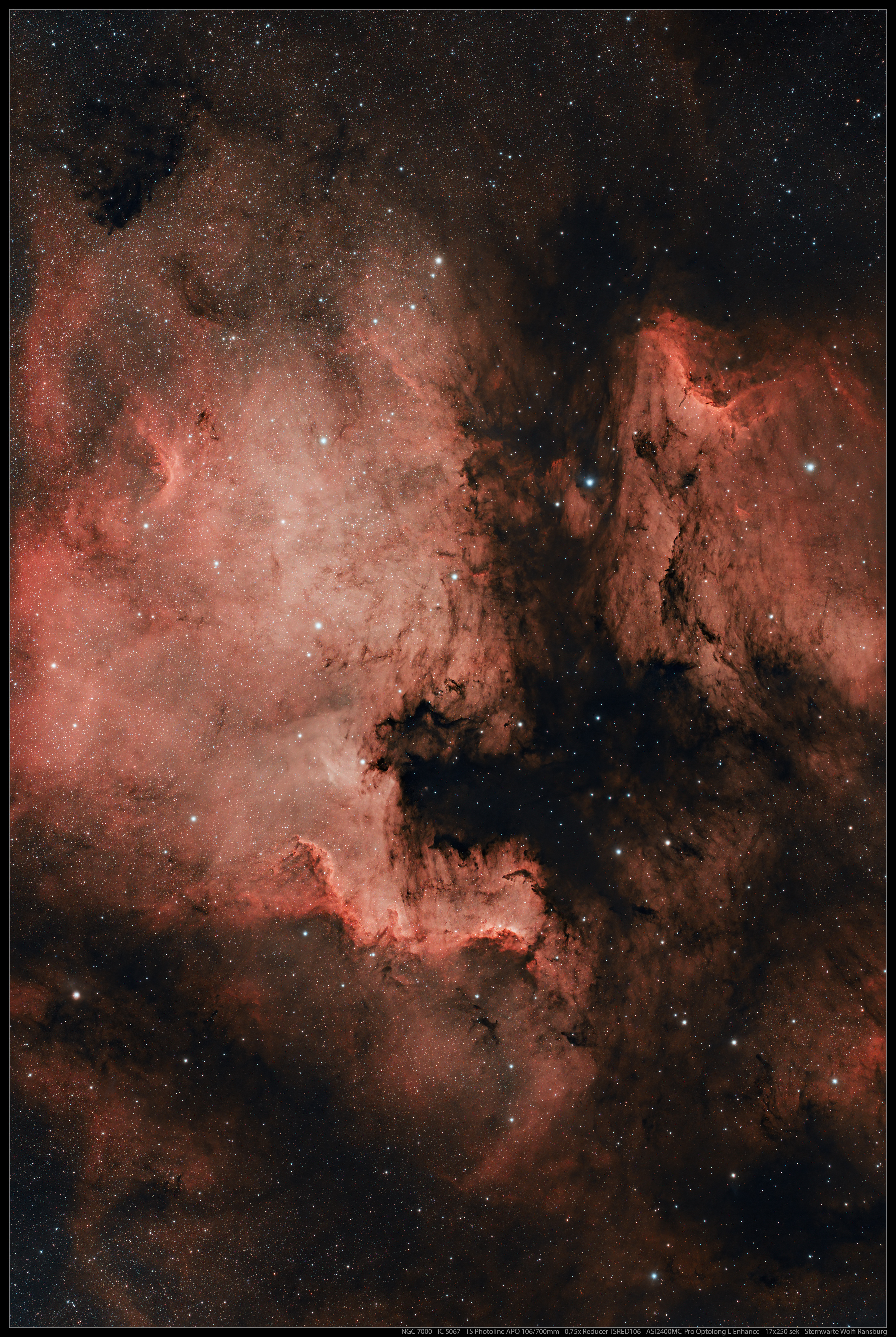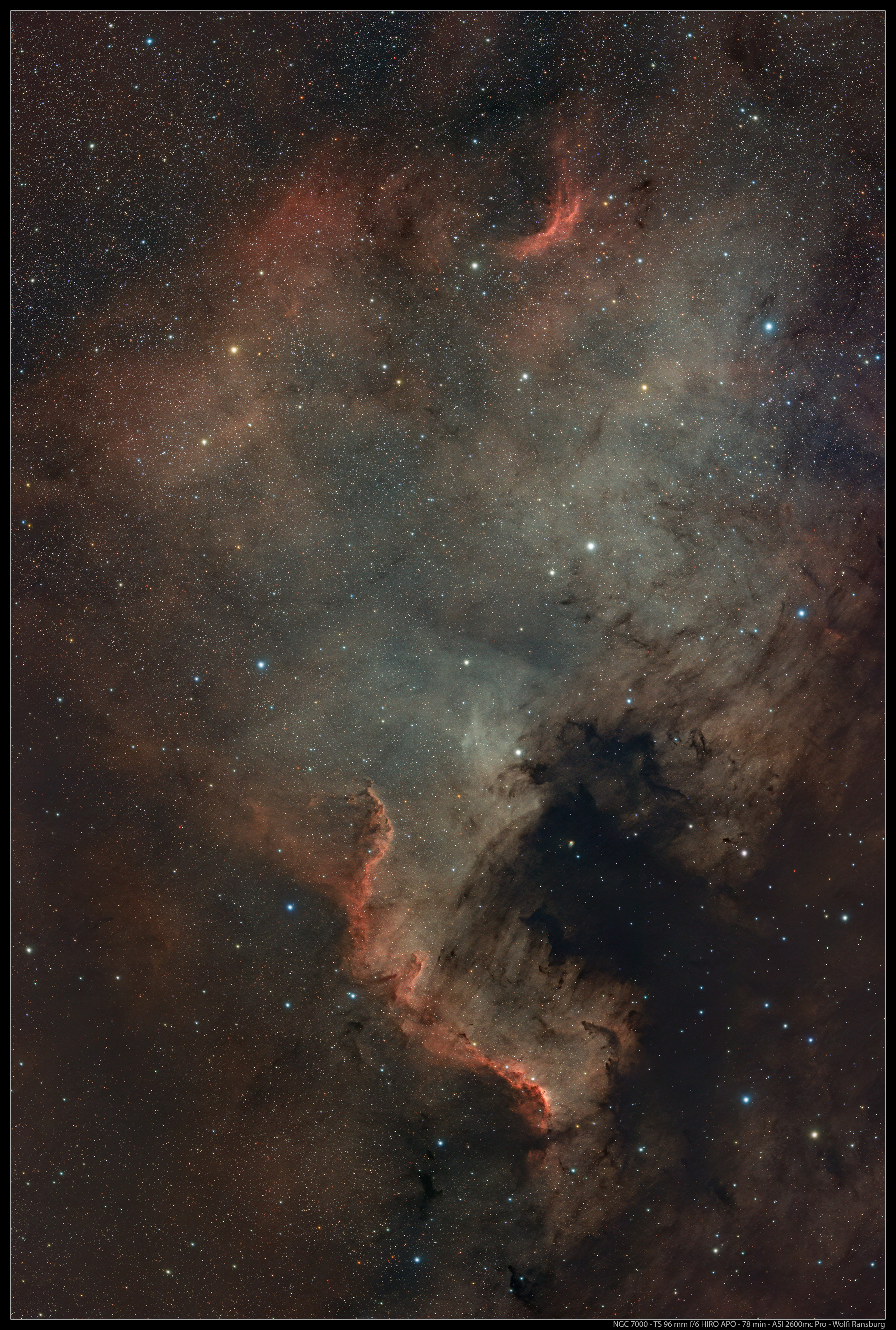 NGC 7000 oder der Nordamerikanebel verdankt seinen Namen der Ähnlichkeit mit dem gleichnamigen Kontinent. Eine besonders markante Region ist The Great Wall, ein reich strukturiertes Gebiet in der Nähe des "Golfes von Mexiko" Das Objekt ist kein reiner roter Emissionsnebel, er hat auch einglagerte bläuliche Reflexionsanteile.