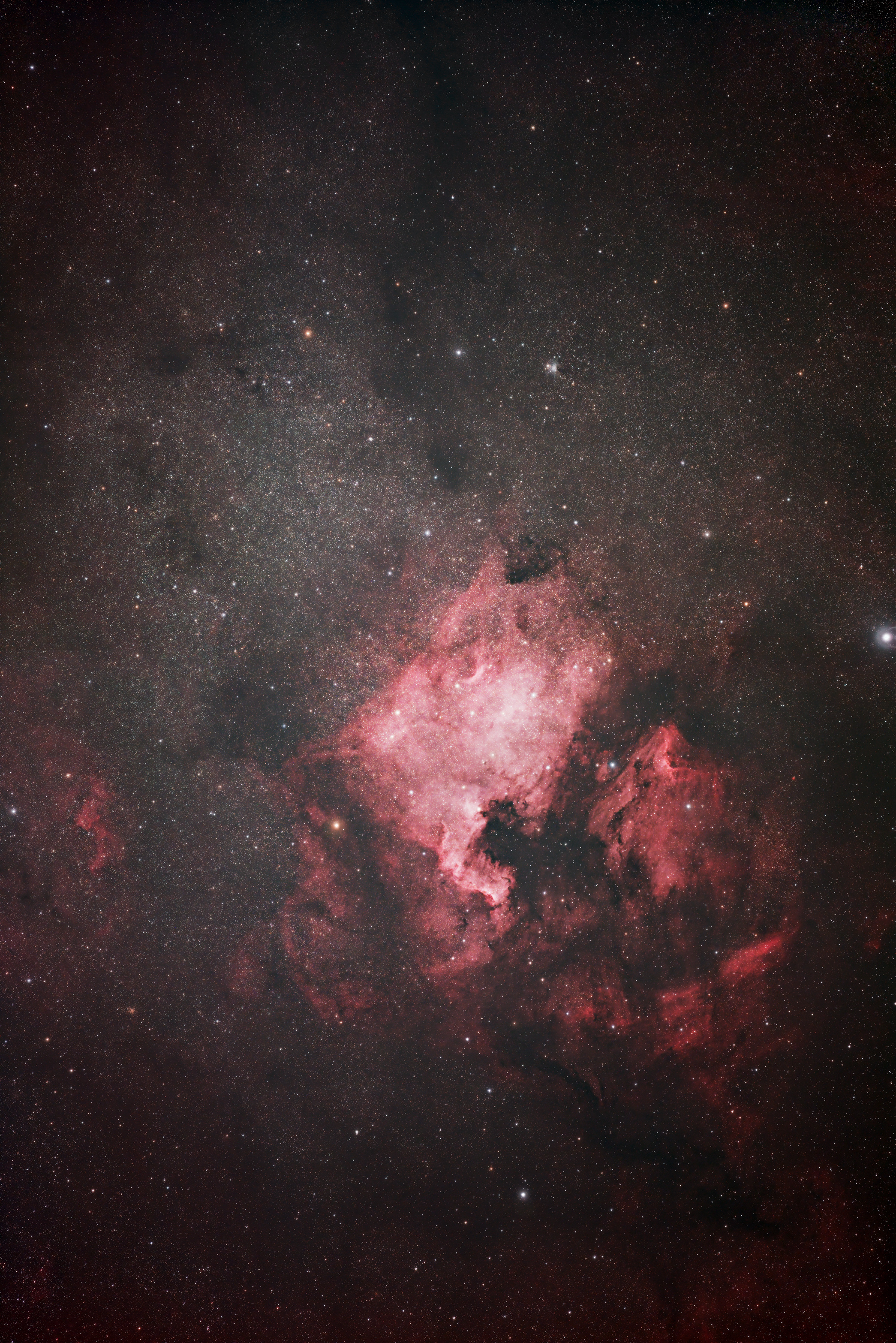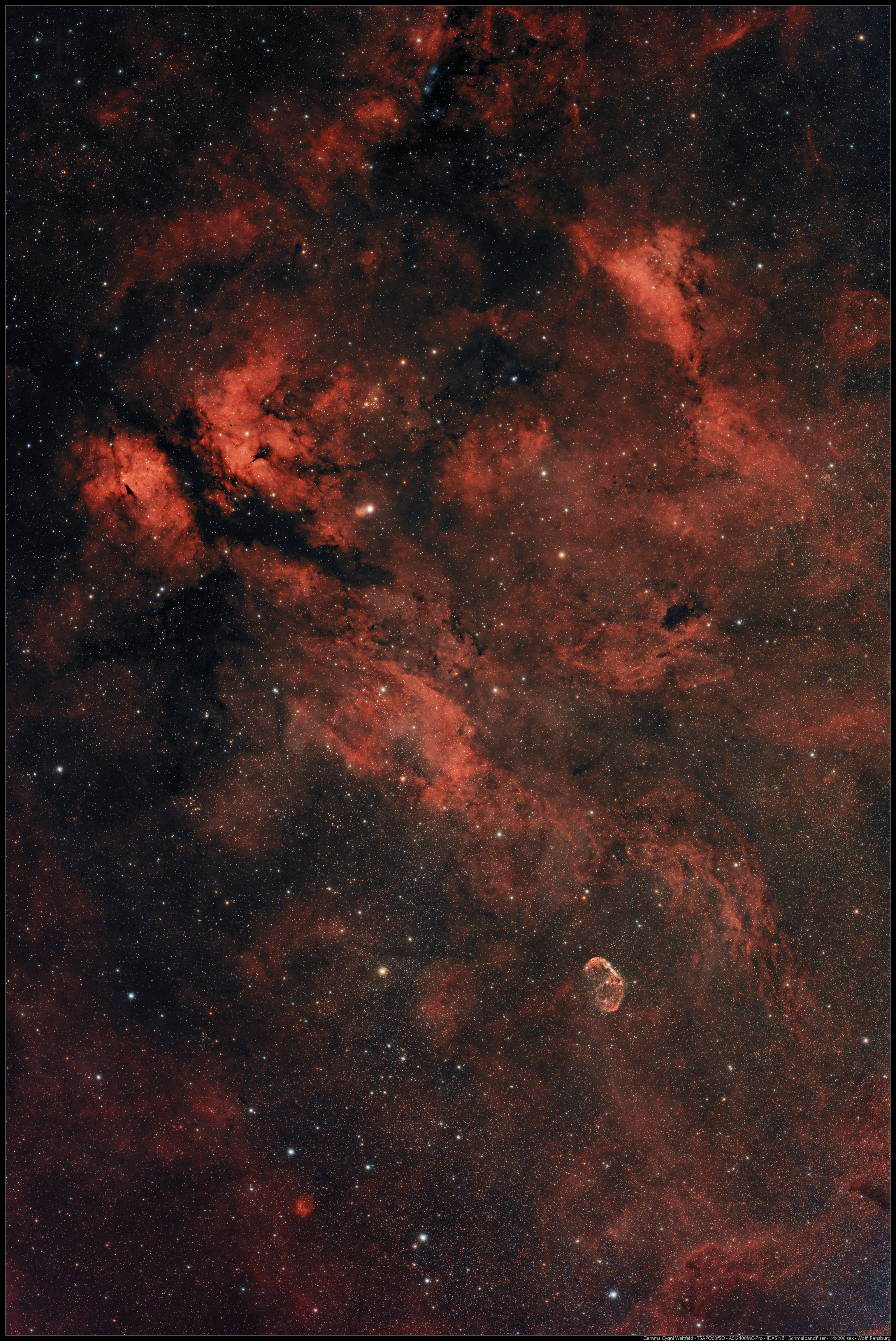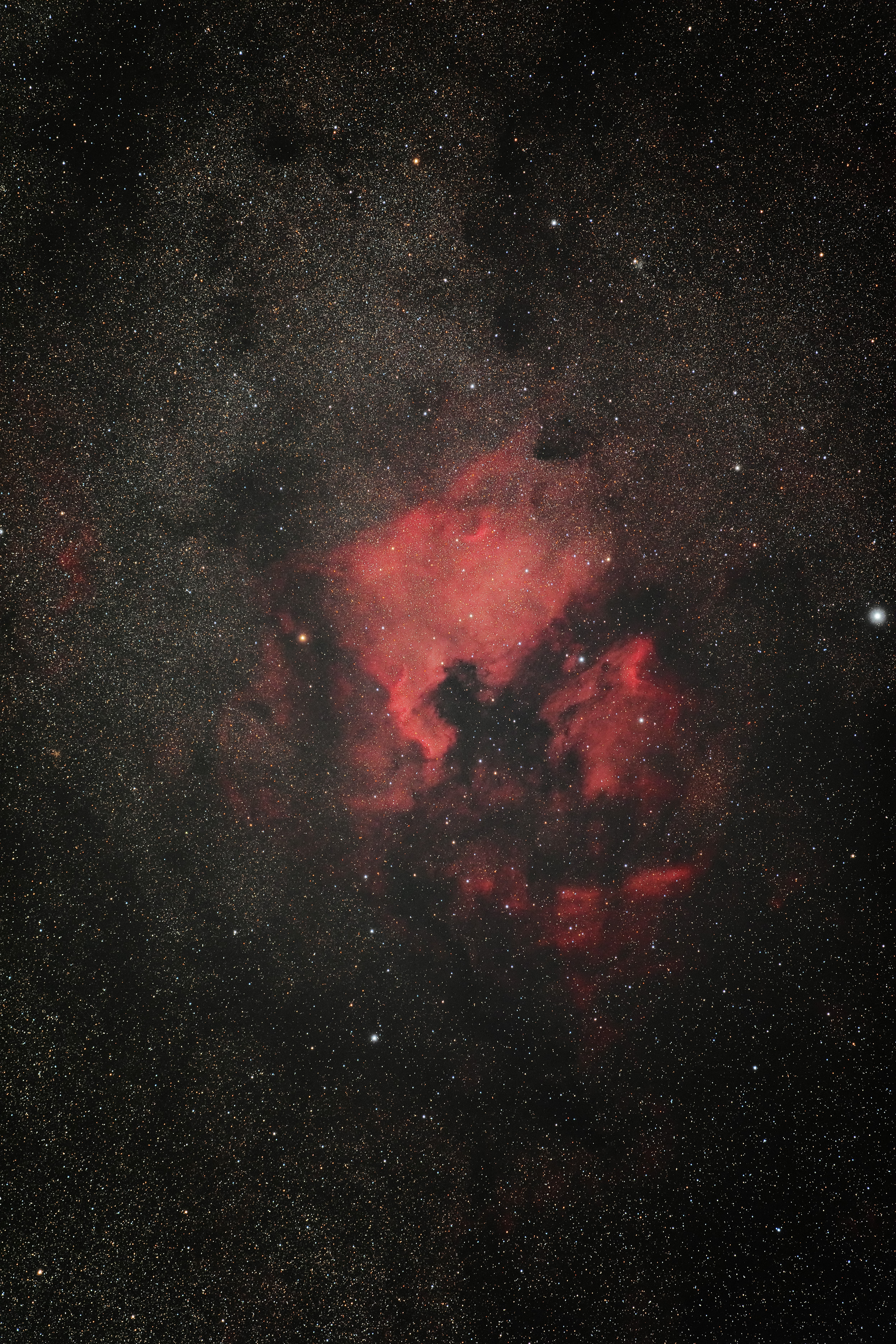 NGC 7000 oder der Nordamerikanebel verdankt seinen Namen der Ähnlichkeit mit dem gleichnamigen Kontinent. Eine besonders markante Region ist The Great Wall, ein reich strukturiertes Gebiet in der Nähe des "Golfes von Mexiko" Das Objekt ist kein reiner roter Emissionsnebel, er hat auch einglagerte bläuliche Reflexionsanteile.