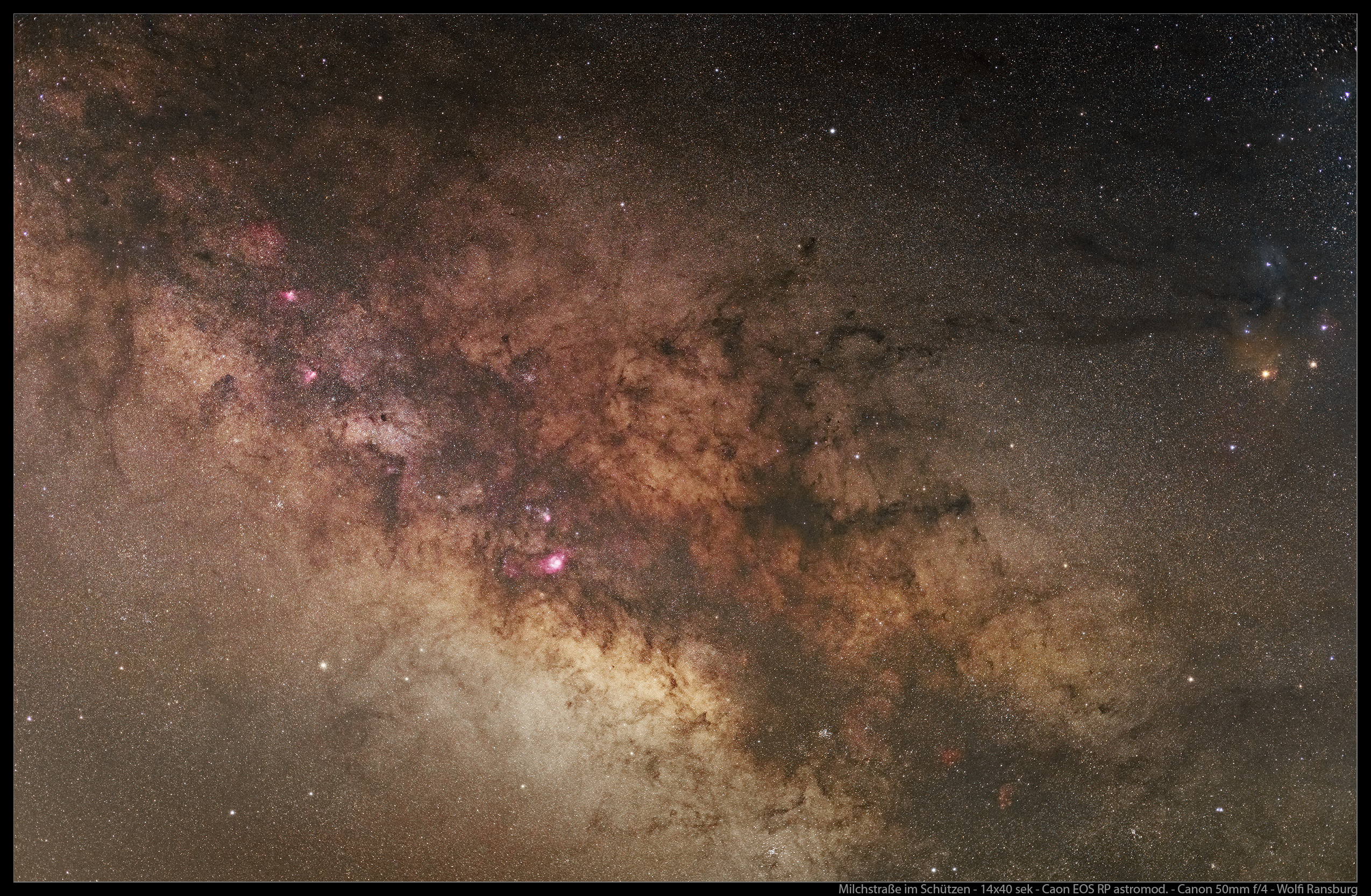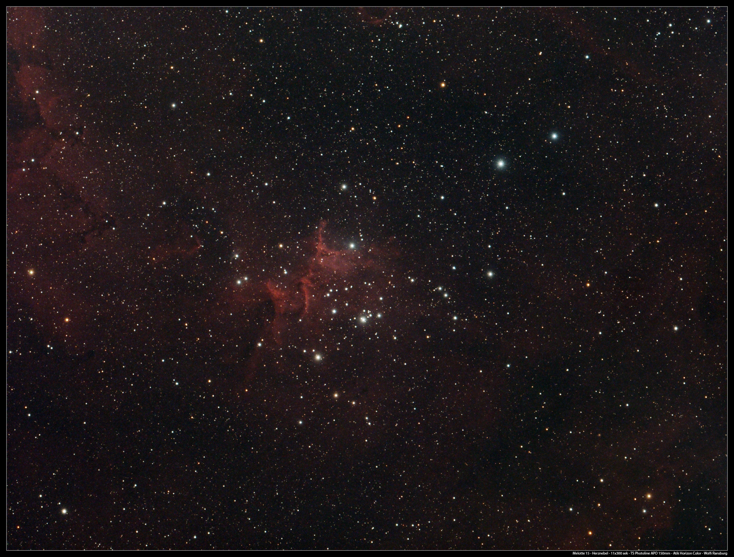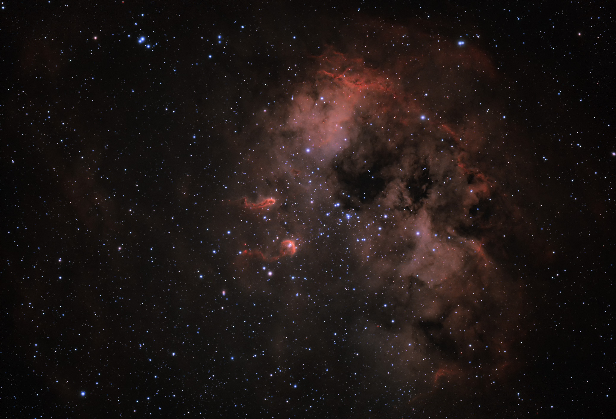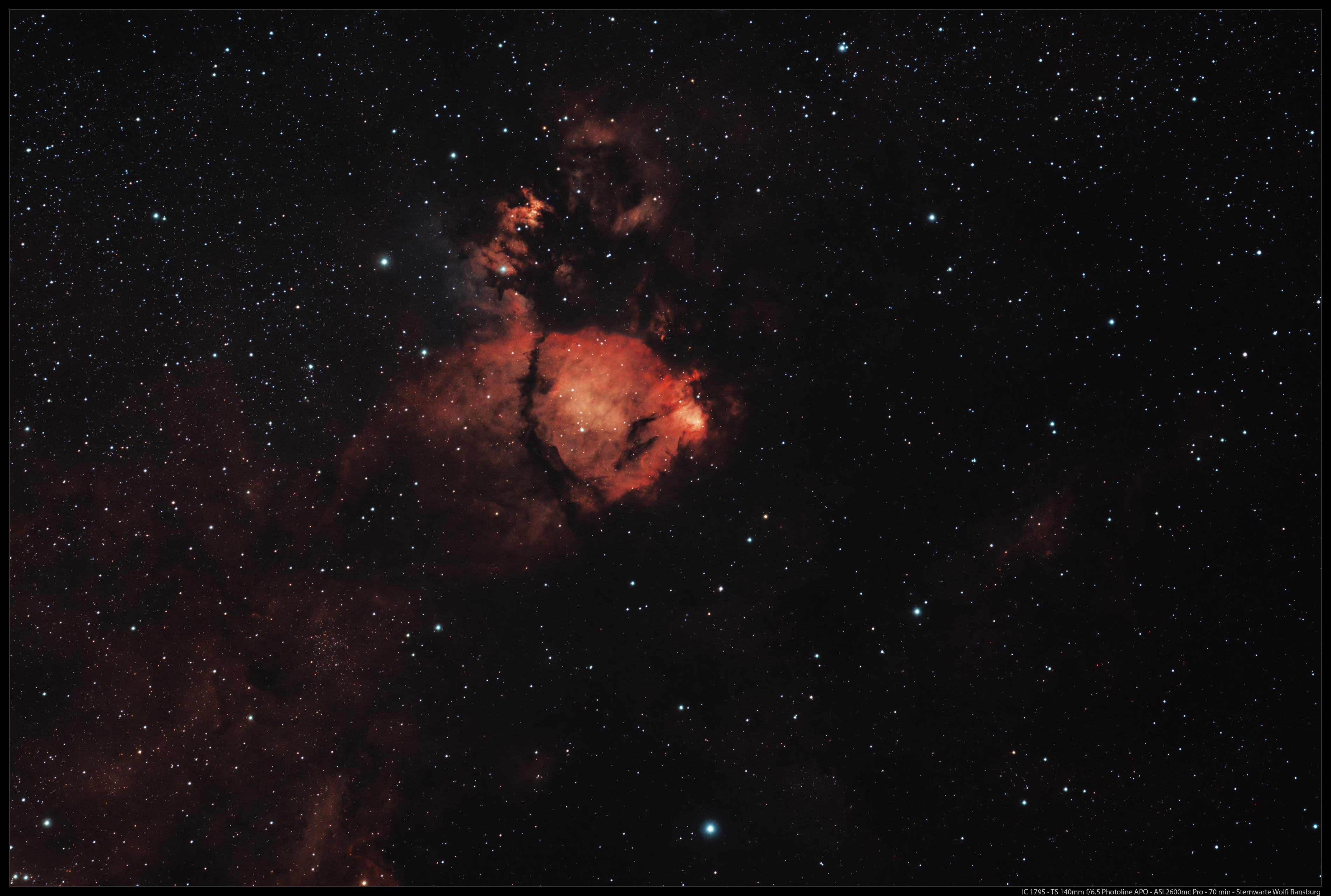 Eigentlich arbeite ich in meiner Sternwarte nur mit gekühlten Kameras, der Wetterbericht hat aber nur ein Zeitfenster von einer Stunde vorhergesagt, ideal für einen Test mit meiner Systemkamera, EOS RP (astromodifiziert) Das Zeitfenster hat sich dann aber verlängert, so daß die Zeit für den Flammennebel geblieben ist.IC 1805 ist ein großflächiger Emissionsnebel in der Cassiopeia, auch als Herznebel bekannt. Das Innere des Nebels, Melotte 15, ist eine korkenzieherförmige Strktur, die durch Sternwinde entstanden ist.