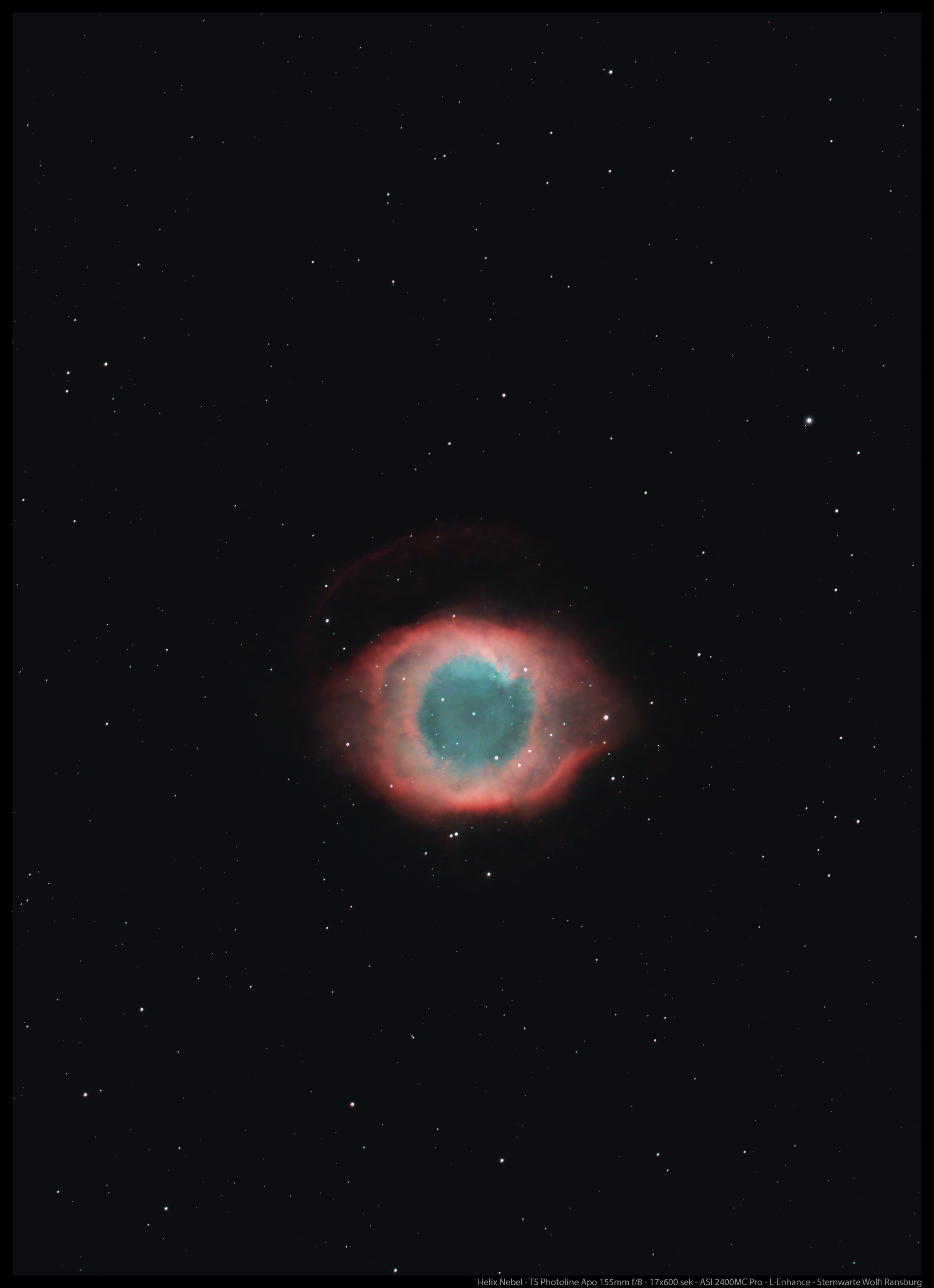 Mein Ziel ist, mit möglichst kurzer Belichtungszeit doch recht tiefe Astroaufnahmen zu machen. Gerade schwache Galaxien werden oft 10 Stunden und mehr belichtet. Diese L-RGB Aufnahme wurde nur etwa 63 Minuten lang belichtet.IC 7293, der Helix Nebel wird wegen seiner Form auch "Das Auge Gottes" genannt. Herr der Ringe Fans wird der Nebel eher an das "Allsehende Auge" erinnern. Das Objekt ist ein Planetarischer Nebel in unserer Nachbarschaft.