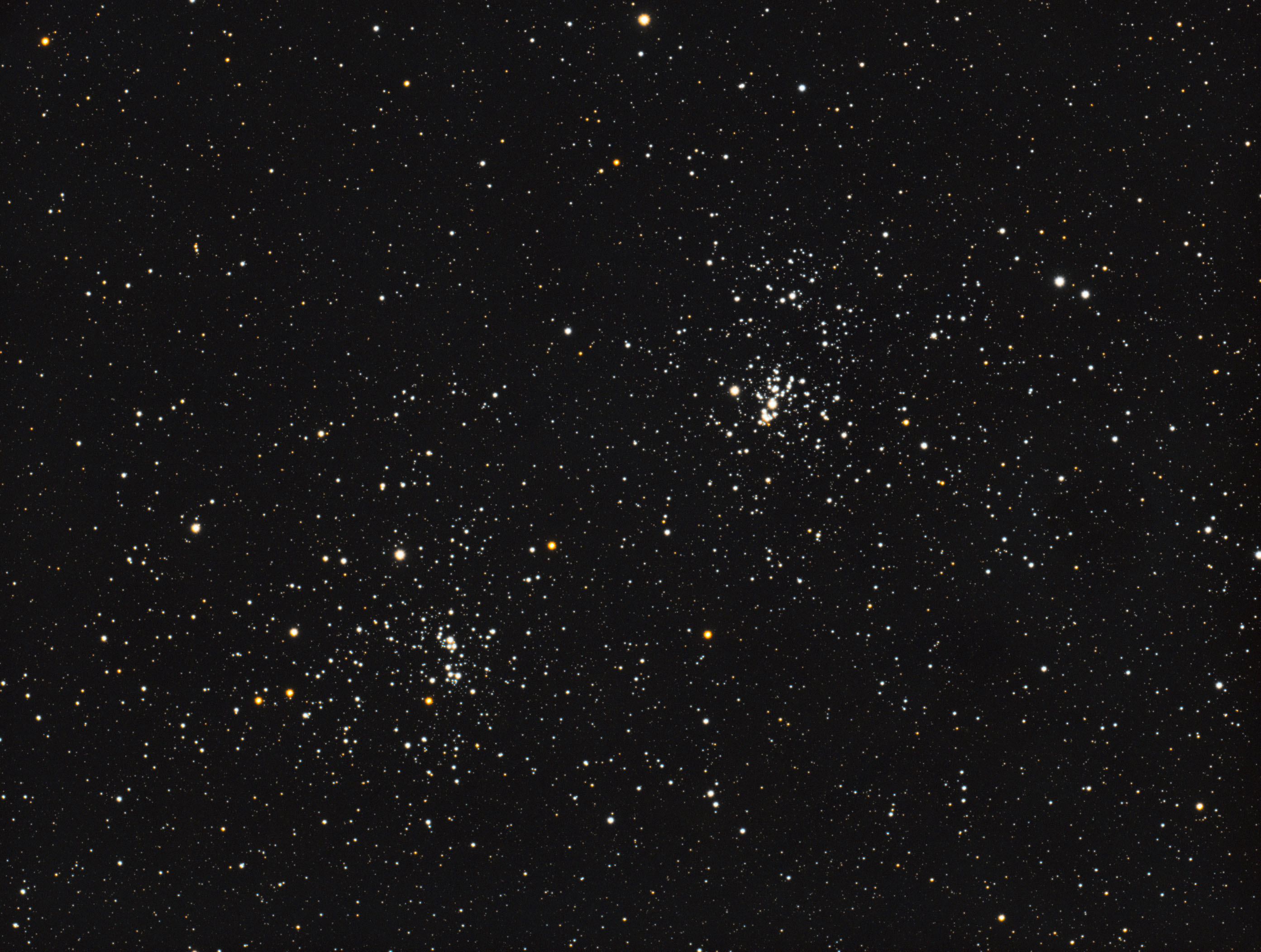 Zwischen dem Sternbild Pereus und Cassiopeia befindet sich ein schönes Objekt, der Doppelsternhaufen im Perseus, es sind zwei offene Sternhaufen in scheinbarer Nachbarschaft. Wirklichkeit sind die Sternhaufen weit voneinander entfernt aber aus der Perspektive der Erde erscheinen sie nebeneinander.