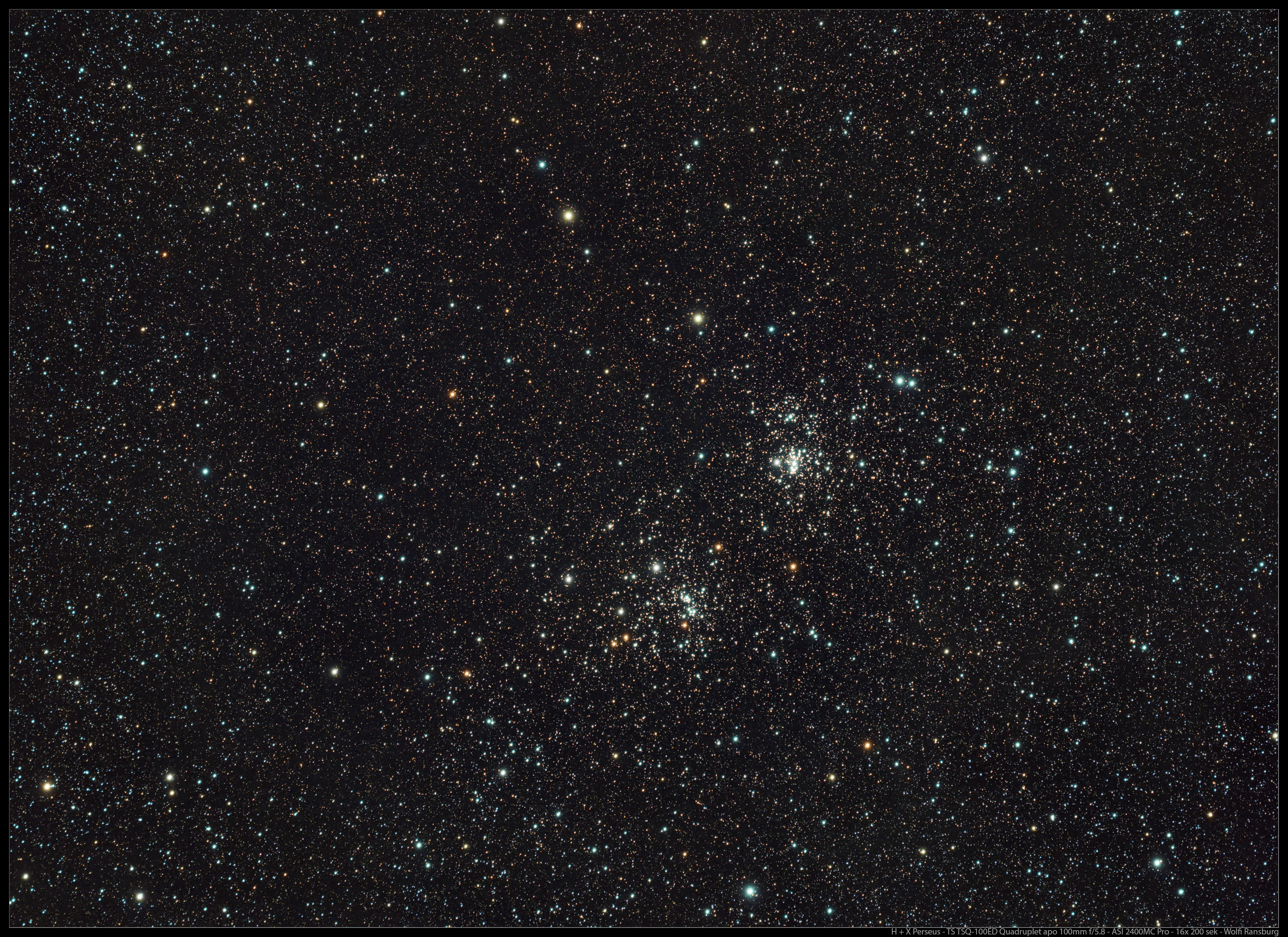 Der Doppelsternhaufen ist in guten Nächten sogar mit dem bloßen Auge sichtbar, NGC 869 und NGC884 ist ein dankbares Objekt für mittlere Brennweiten. Die beiden offenen Sternhaufen liegen in einem sternreichen Gebiet am Rande der Milchstraße.