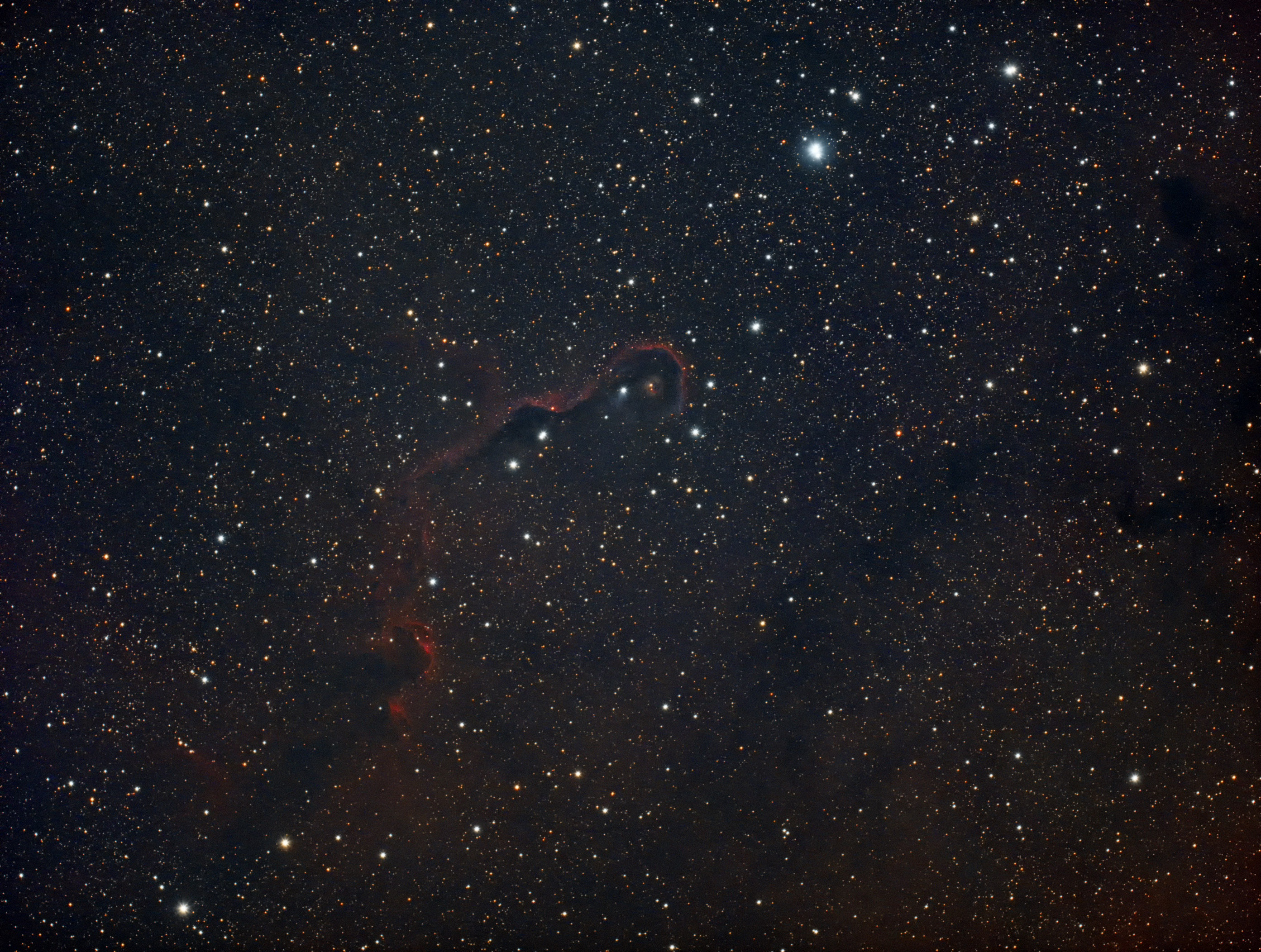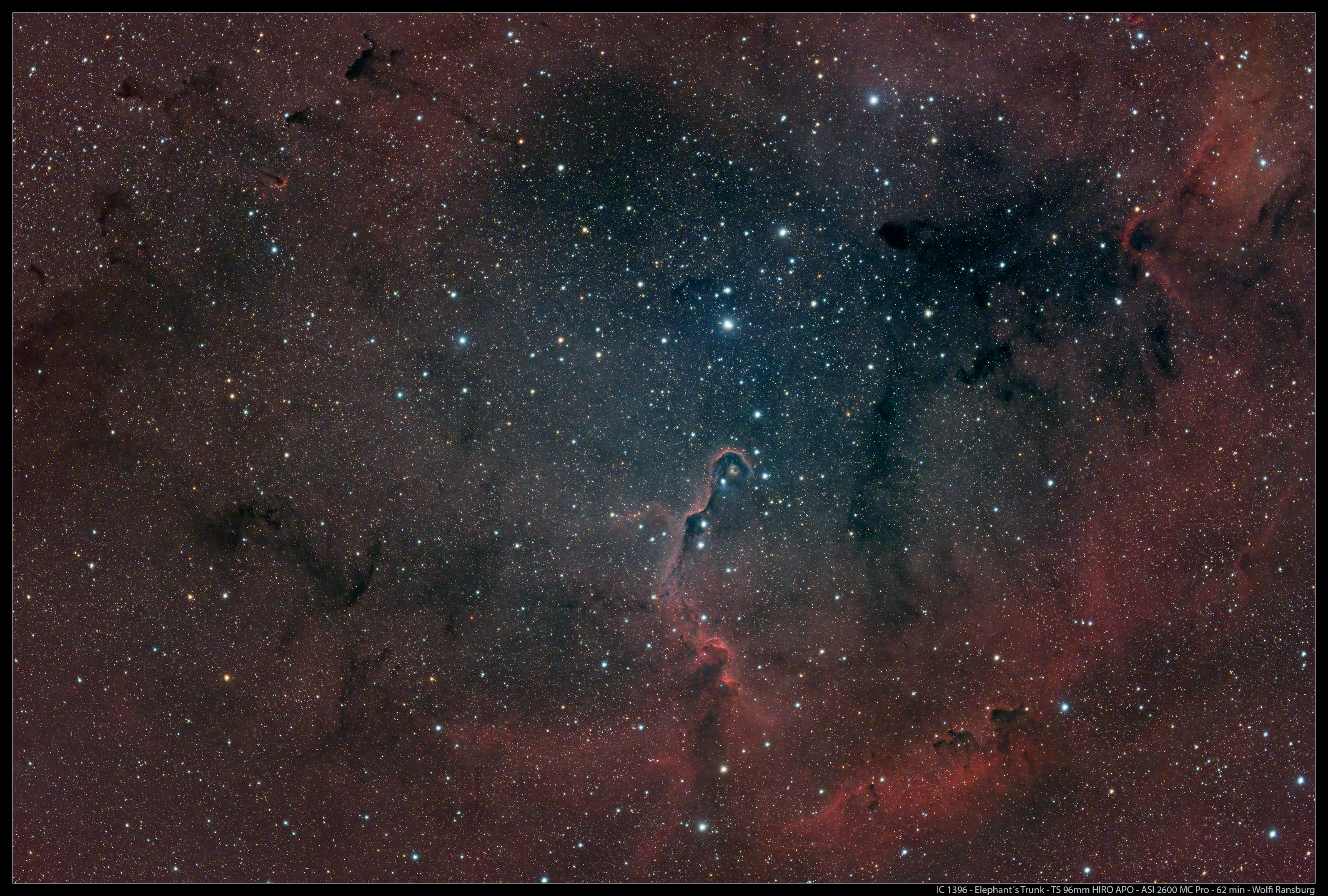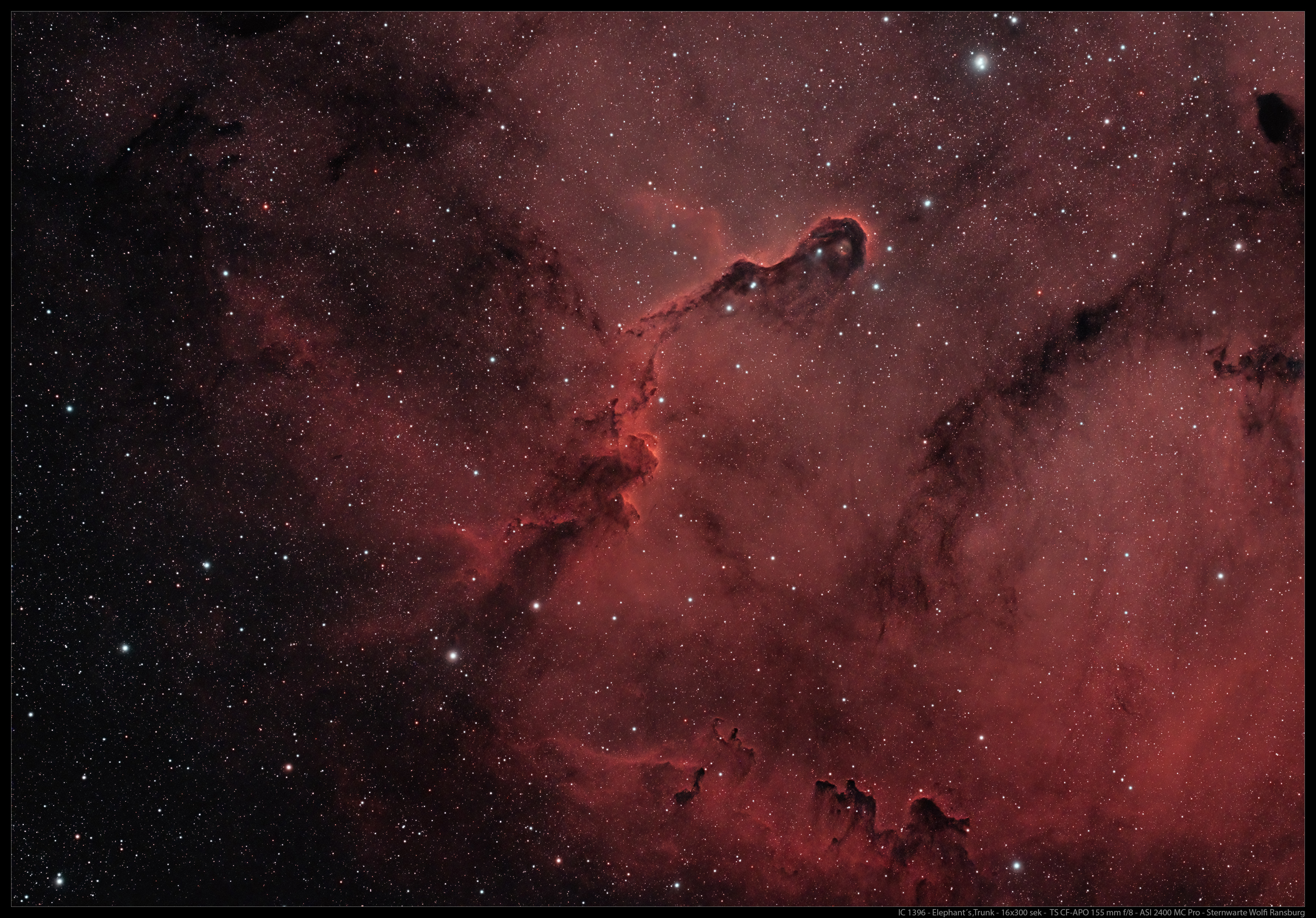 Elephant´s Trunk Nebel ist ein sehr markanter Bereich der großen Gasblase IC 1396 im Kepheus. Die markante Form des Nebels kommt durch Dunkelwolken, die das Licht der dahinter liegenden Sterne und Nebelobjekte verschlucken. Zudem verformen die Sternwinde der massereichen Sterne die Wolke.