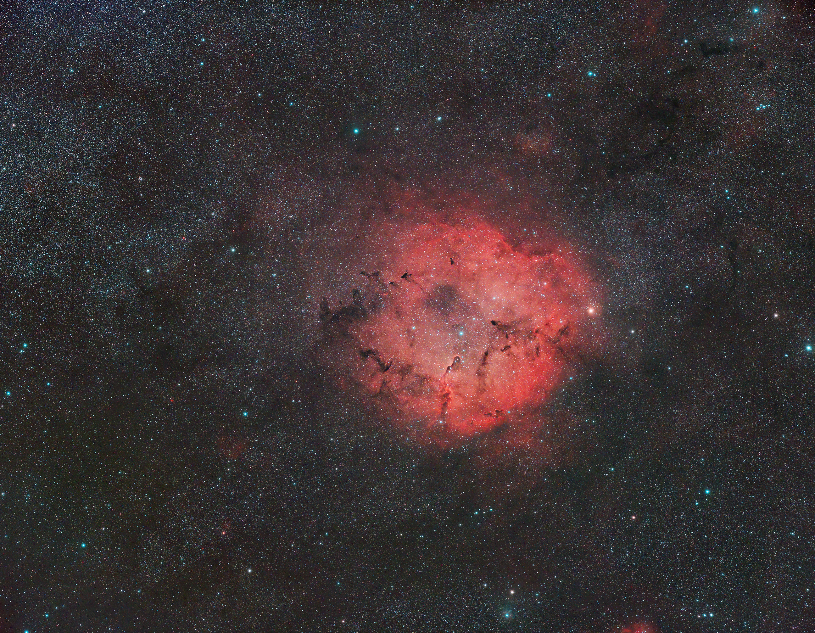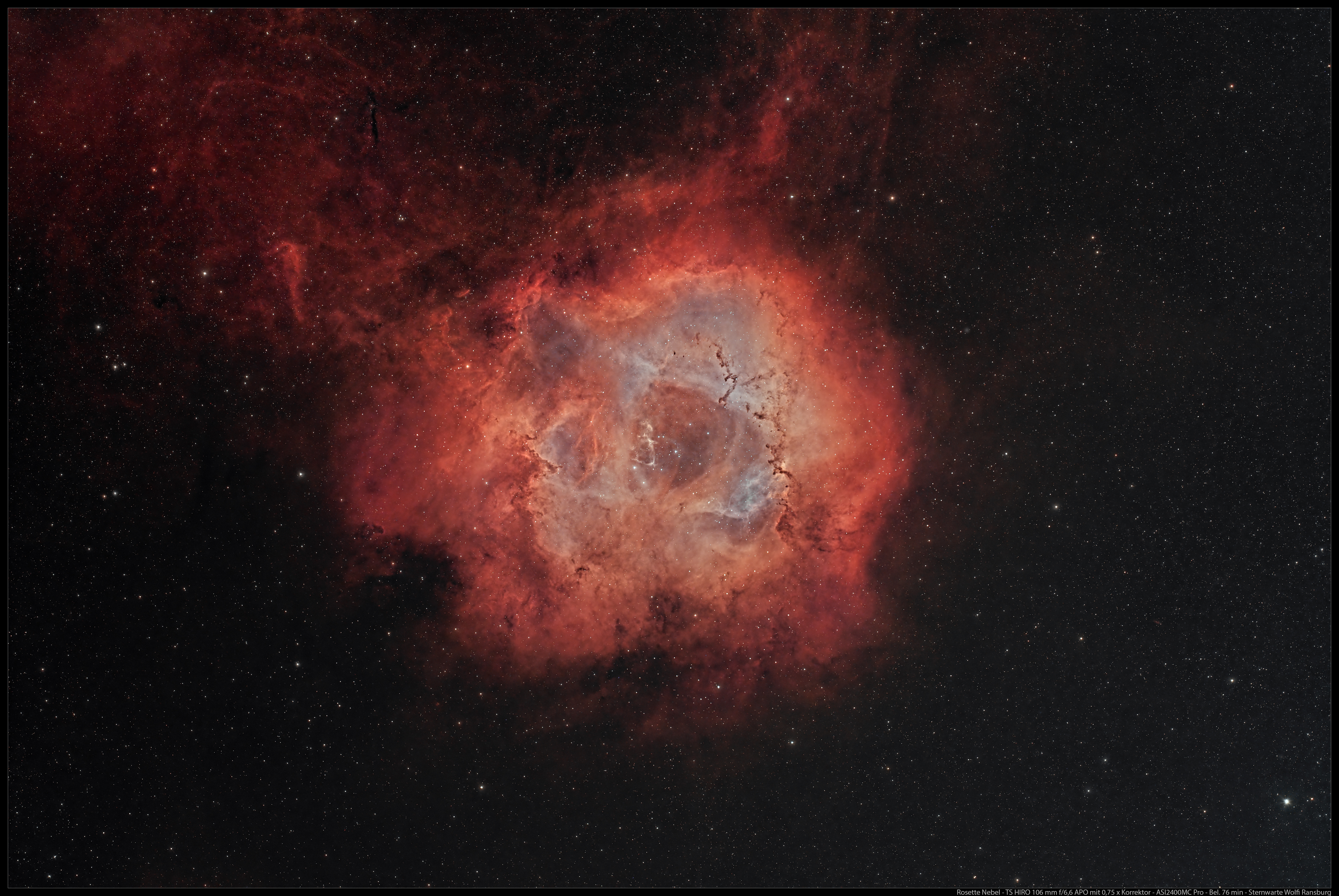 Der Rosetten Nebel ist meines Erachtens einer der schönsten Nebel des Wintersternhimmels für kleinere Brennweiten. Er kombiniert ausgedehnte H-II Regionen, im inneren Teil ein paar Reflexionsanteile und wunderschöne Dunkelwolken. Also das ideale Objekt für das "First-Light" mit meinem HIRO APO mit 106mm Öffnung. Das Öffnungsverhältnis von f/6,6 wurde mit dem Reducer auf f/4,9 verkürzt. Zum Einsatz ist meine Vollformat Kamera ASI2400MC Pro gekommen.