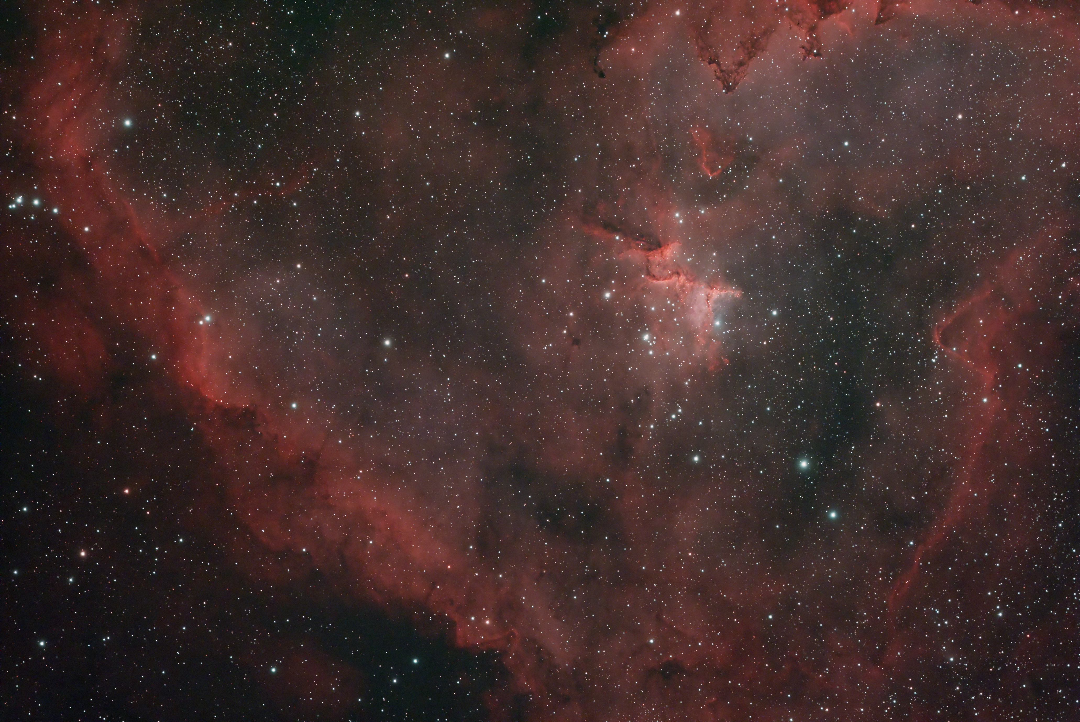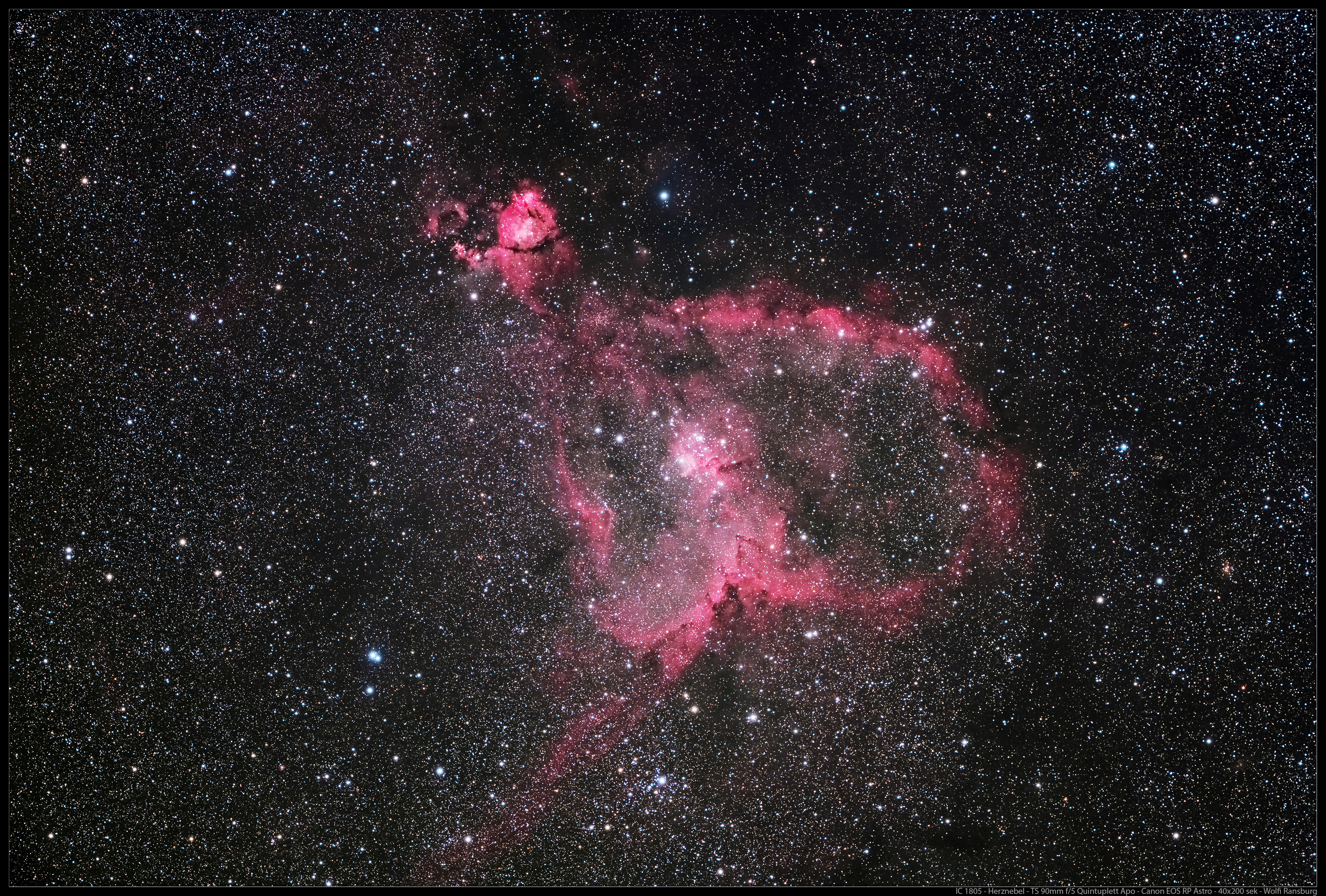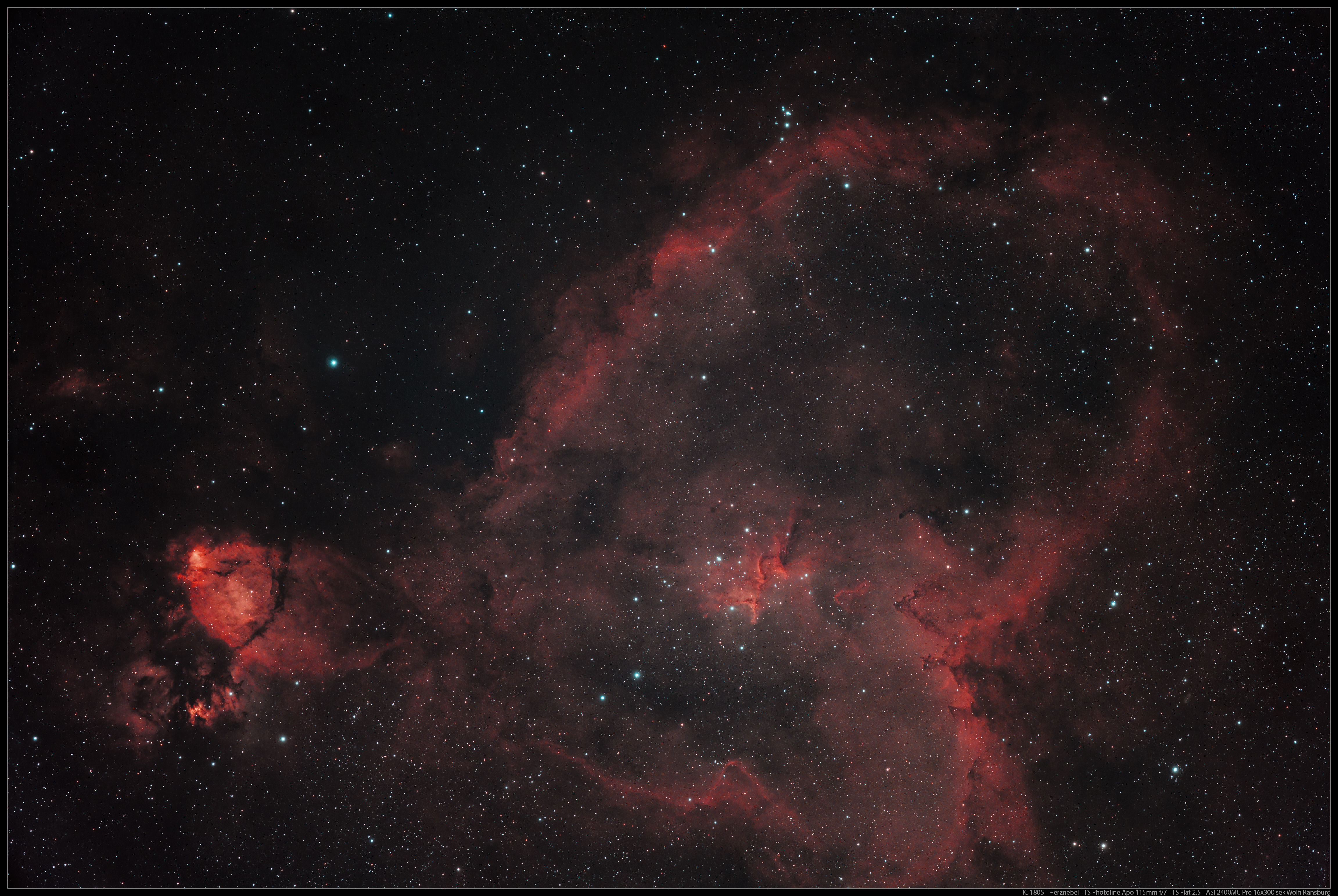 Auch diese Aufnahme ist mit meinem Photoline 115mm f/7 APO entstanden. Mit dem 2,5" Vollformat Korrektor und der ASI 2400MC Pro Vollformat Kamera ist dies eine feine Kombination für großflächige Nebel.Der Herznebel ist ein ausgedehnter Nebelkopplex im Sternbild Cassiopeia. Der Nebel ist sehr ausgedehnt. Trotzdem lohnt es sich, mit höherer Auflösung an den Nebel zu gehen, weil er im inneren sehr spannende Strukturen, die an einen Korkenzieher erinnern, hat.