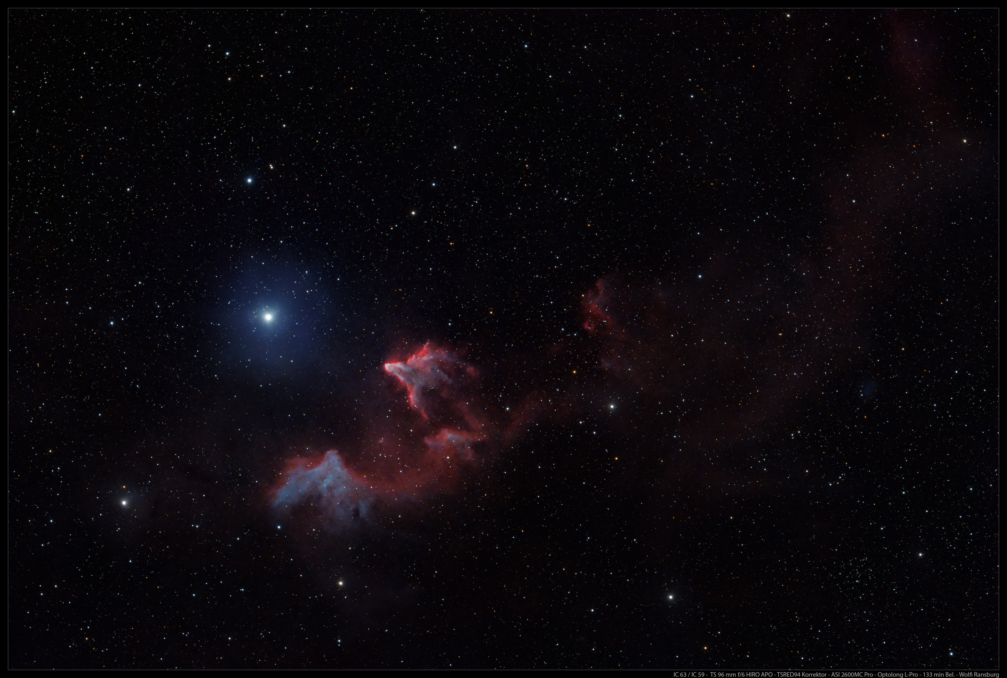 IC 63 ist auch als "Ghost of Cassiopeia" bekannt, er bildet gemeinsam mit IC 59 einen lichtschwachen Nebel sehr nahe dem hellen Stern Gamma Cassiopeia. Der Emissionsnebel ist durchsetzt mit blau leuchtenden bereichen, wo das blaue Sternenlicht reflektiert wird. Ein paar kleine Dunkelnebel ergänzen diese spannende Himmelsregion