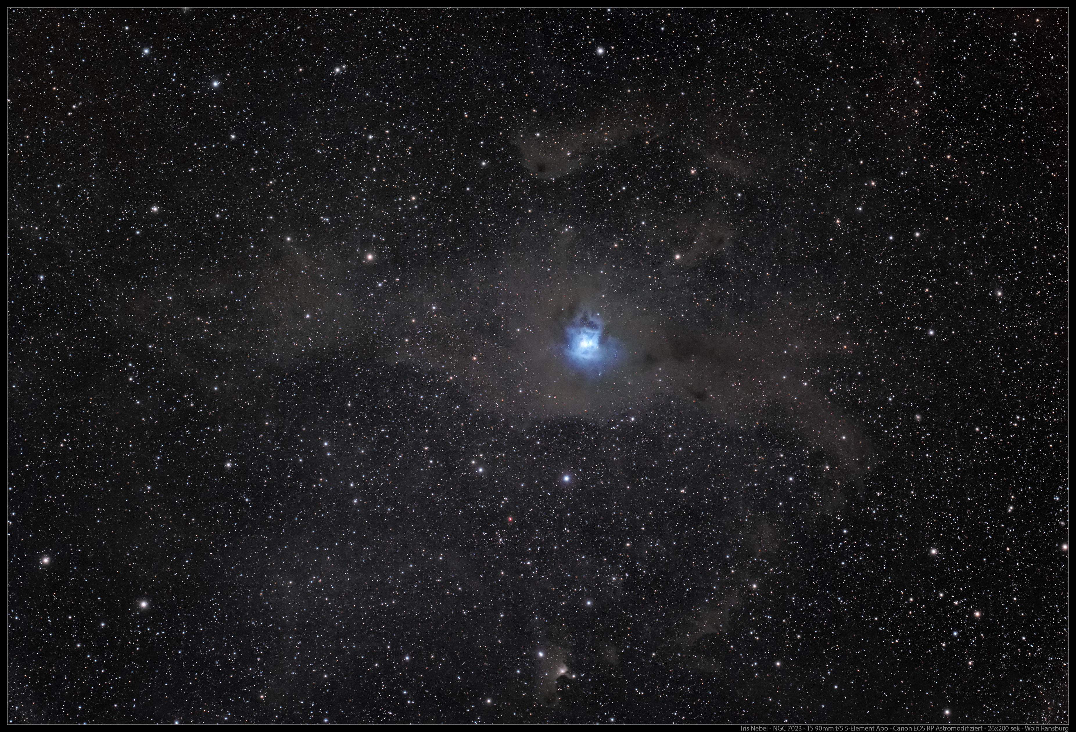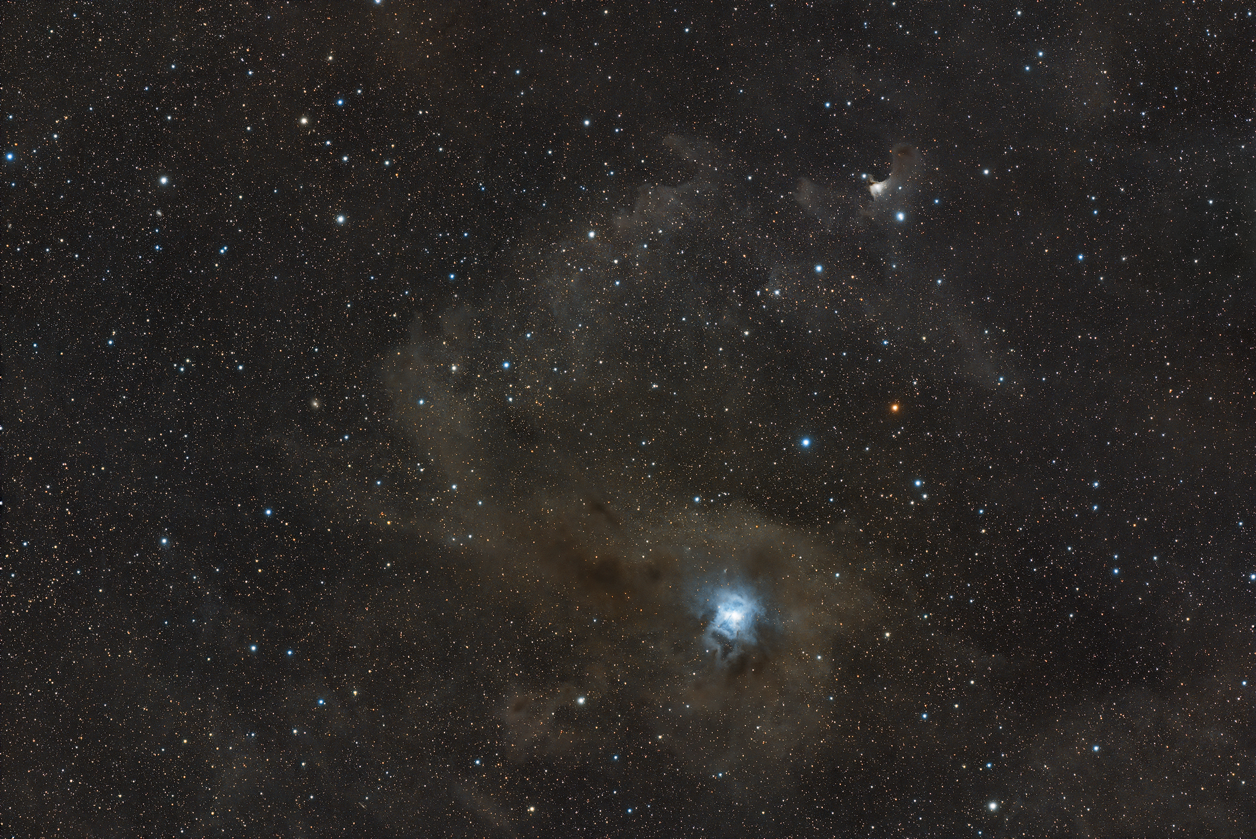 Der Irisnebel ist ein Reflexionsnebel im Sternbild Cepheus. Der blaue Nebel wird von einem hellen blauen Stern beleuchtet. Besonders spannend ist aber das Umfeld des Nebels, welches von dunklen Staubmassen dominiert ist, die in einem zarten bräunlichen Licht leuchten.