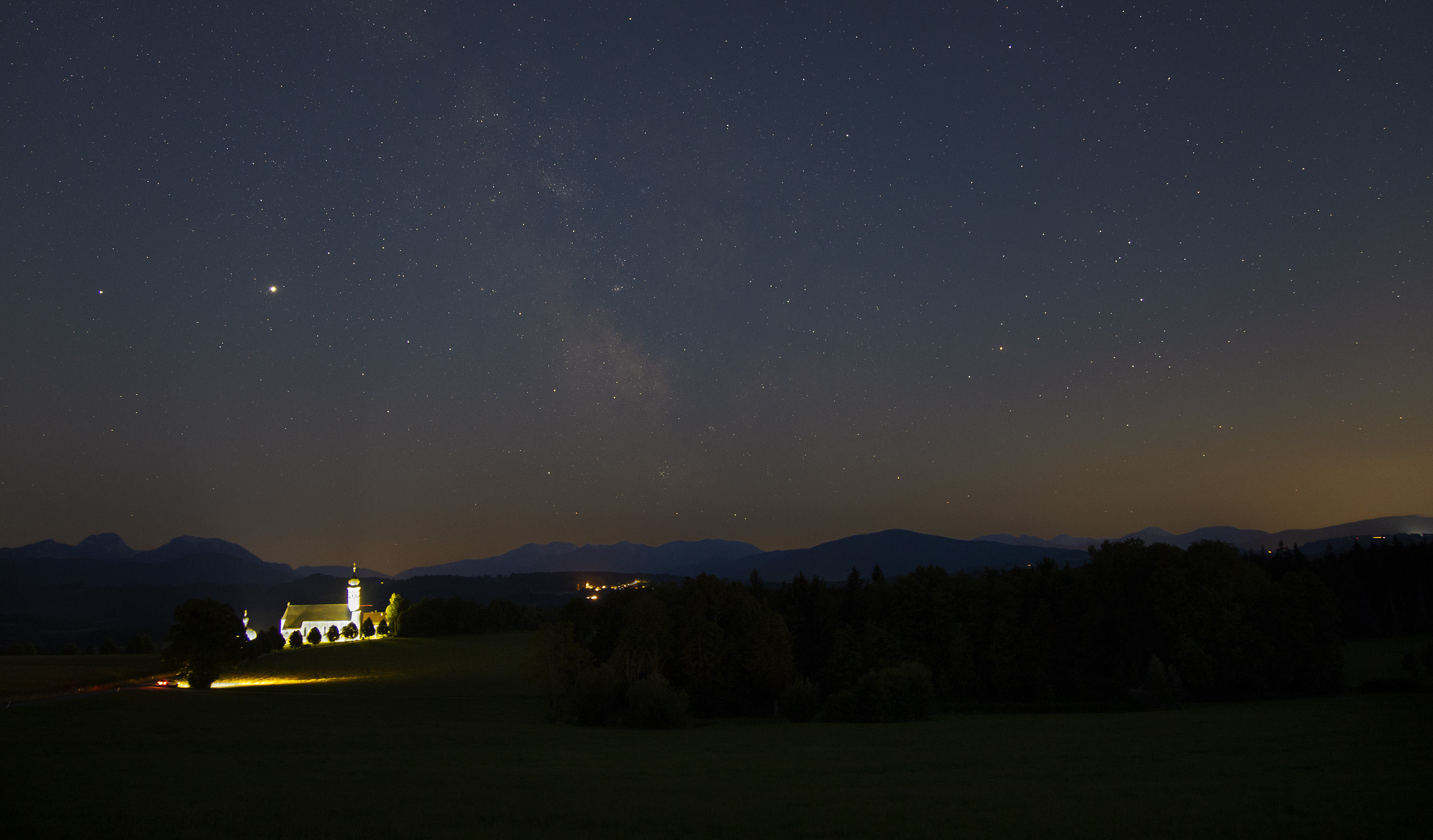 Wir erleben die faszinierende "blaue Stunde" und erleben, wie langsam die Milchstraße sichtbar wird. Erst nur ein Hauch doch dann steht sie eindrucksvoll über uns. Obwohl Tino und auch unsere Nachbarn keine eingefleischten Astrofotografen sind, ist ihnen der Spaß und die Freude an diesem Erlebnis anzumerken. Kurz vor Mitternacht fahren wir wieder nach Hause, wir haben fest vor, das zu wiederholen aber dann am Sudelfeld, wo es noch dunkler ist.NGC 7000 ist einer der bekanntesten Gasnebel des Sommerhimmels. Die markante Form erinnert tatsächlich an den namensgebenden Kontinent. Der "Golf von Mexiko" wird durch eine dunklere Region verursacht, die das Licht der Sterne schluckt. Der Nordamerikanebel ist visuell am besten mit dem Fernglas in einer klaren Sommernacht zu erkennen. Der schwächere Nebel rechts neben NGC7000 ist der Pelikannebel, mit etwas Phantasie kann man die Form erkennen.