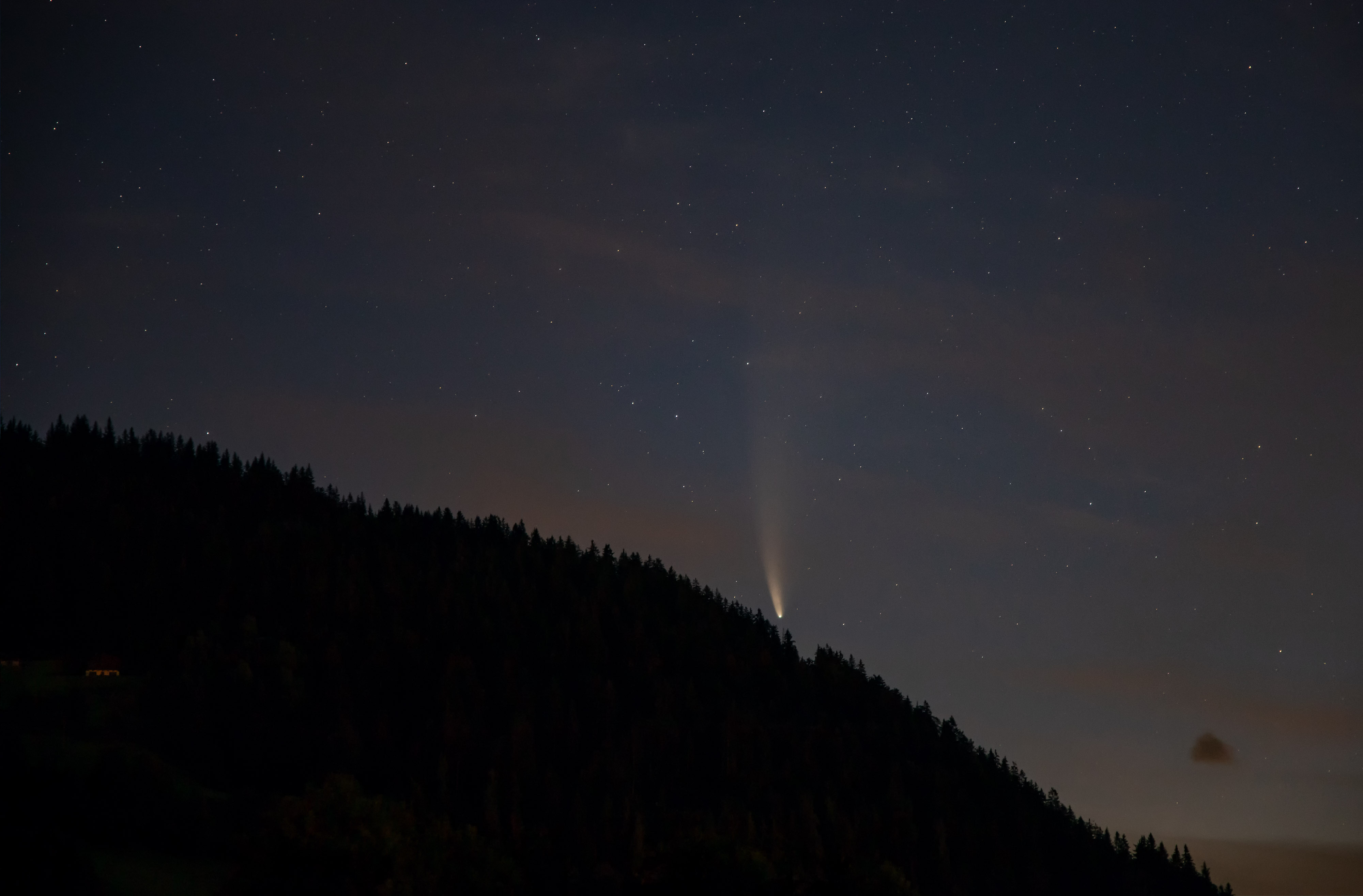 Nach einem vergeblichen Versuch, die Abendsichtbarkeit des Kometen zu nutzen, habe ich um 3h in der Frühe meine Canon EOS RP gepackt und bin losgezogen. Zu Beginn befürchtete ich, daß der Sonnberg bei Kirchberg im Weg ist, weil der Komet doch recht tief im Nordosten stand. Doch nach 15 Minuten Marsch sah ich ihn. Mit bloßem Auge war er eindeutig zu erkennen. Ein wunderschönes Bild, die Bäume des Sonnbergs im Vordergrund und dahinter der Komet in der beginnenden Morgendämmerung.