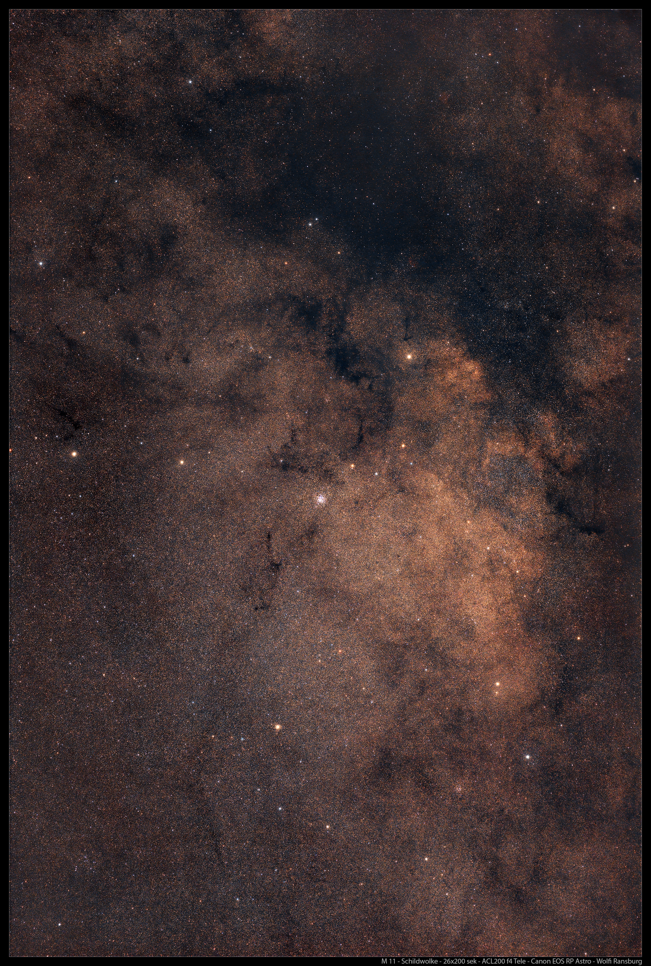 Nach längerer Zeit habe ich wieder mal eine L-RGB Aufnahme gemacht. Die Farbinformation wurde mit RGB Filtern von Baader erzeugt, die Luminanz habe ich mit dem 20nm H-Alpha Filter von Baader aufgenommen. Die Aufnahme ist gecroppt, weil der Rand nicht gut ausgeleuchtet war.M11 ist ein kompakter offener Sternhaufen in der Bildmitte, eingebettet in die Schildwolke, ein recht markanter Teil der Milchstraße im Sternbild Adler.