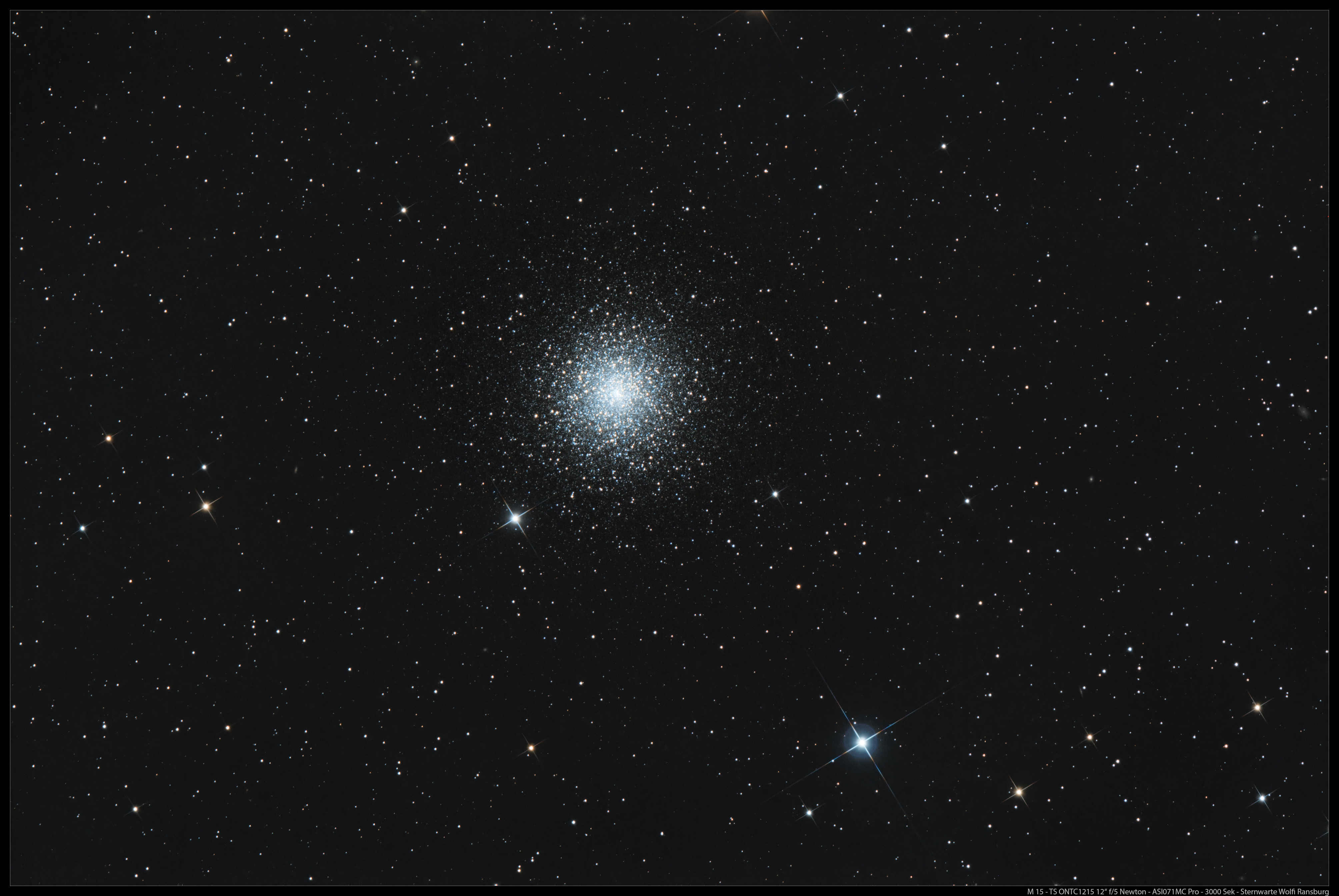Das ist die erste Aufnahme mit der Kamera ASI2600MC Pro. Sie hat einen APS-C Farbsensor mit einer hohen Auflösung und vor allem kein Verstärkerglühen mehr. 12 Aufnahmen wurden mit dem IDAS NB1 und zwei Aufnahmen mit dem Optolong L-Pro gemacht. Mich hat der direkte Vergleich der Filter interessiert. Abgesehen vom etwas schwächeren Kontrast beim L-Pro, dafür aber mehr Hintergrund, konnte ich keinen Unterschied feststellen. Das nächste Mal probiere ich eine höhere Lichtstärke aus.M15 ist einer der helleren Kugelsternhaufen. Mit 6,2mag Helligkeit ist er bereits in kleinen Ferngläsern erkennbar. Der Sternhaufen hat einen sehr dichten Kern. Im Inneren des Kugelsternhaufens wurde sogar ein schwarzes Loch entdeckt. Kugelsternhaufen sind Begleiter unserer Galaxie, die unsere Galaxie wie eine Hülle umgeben.