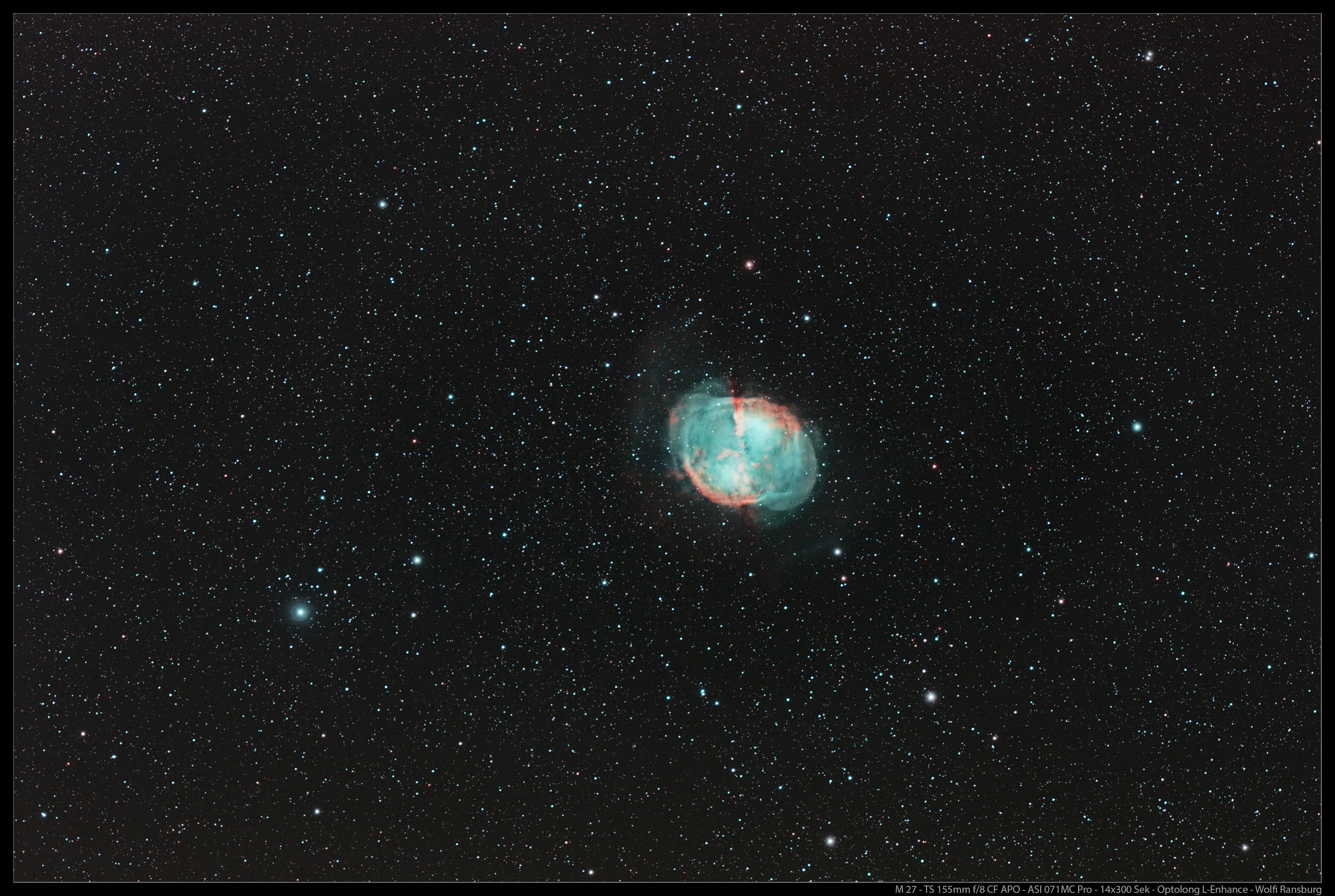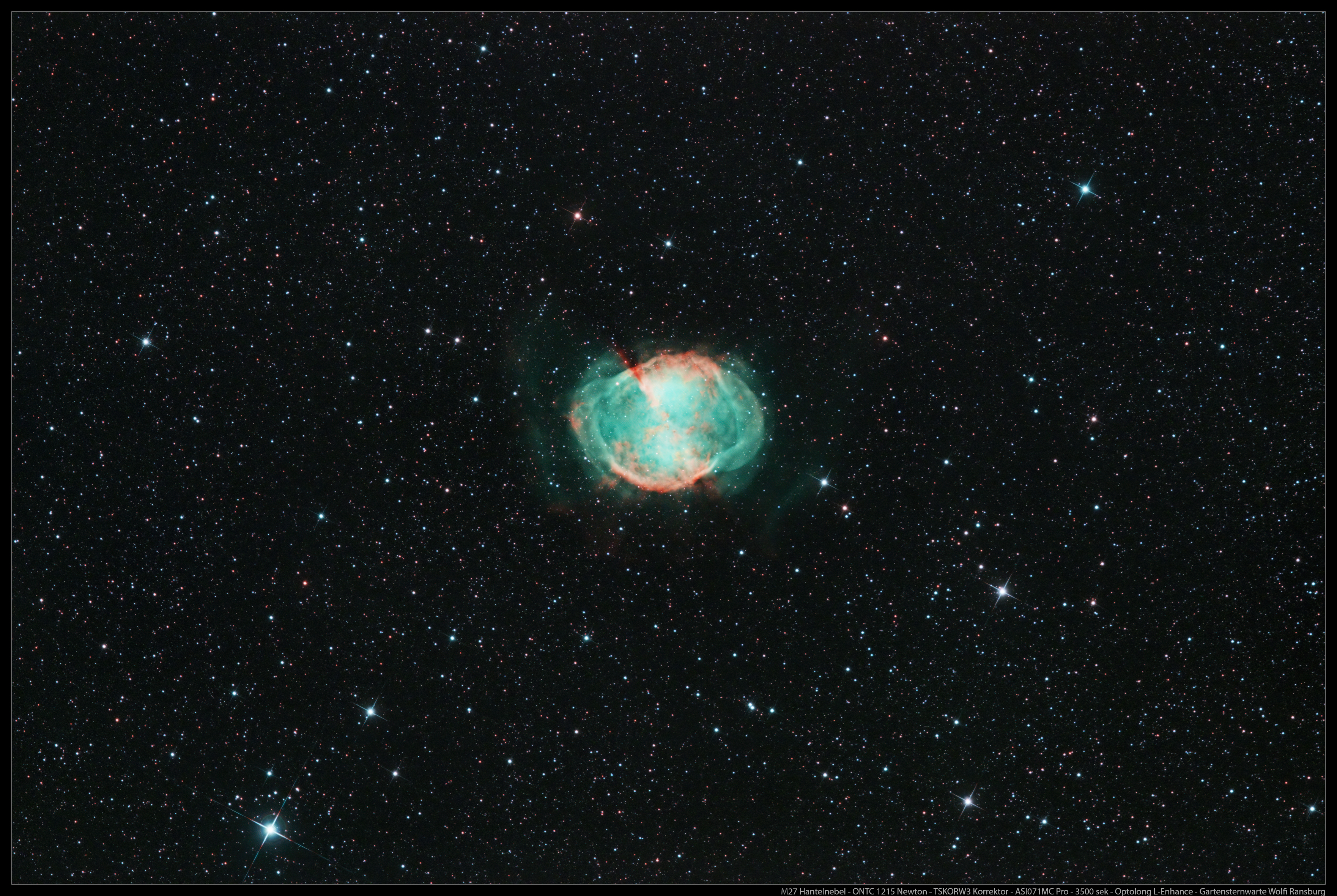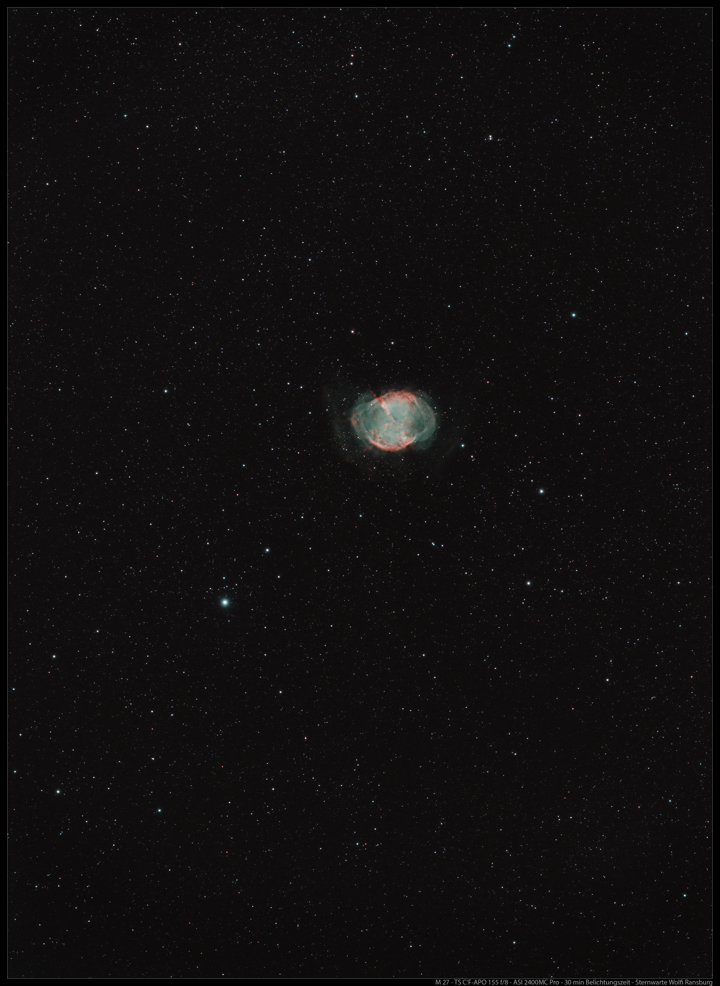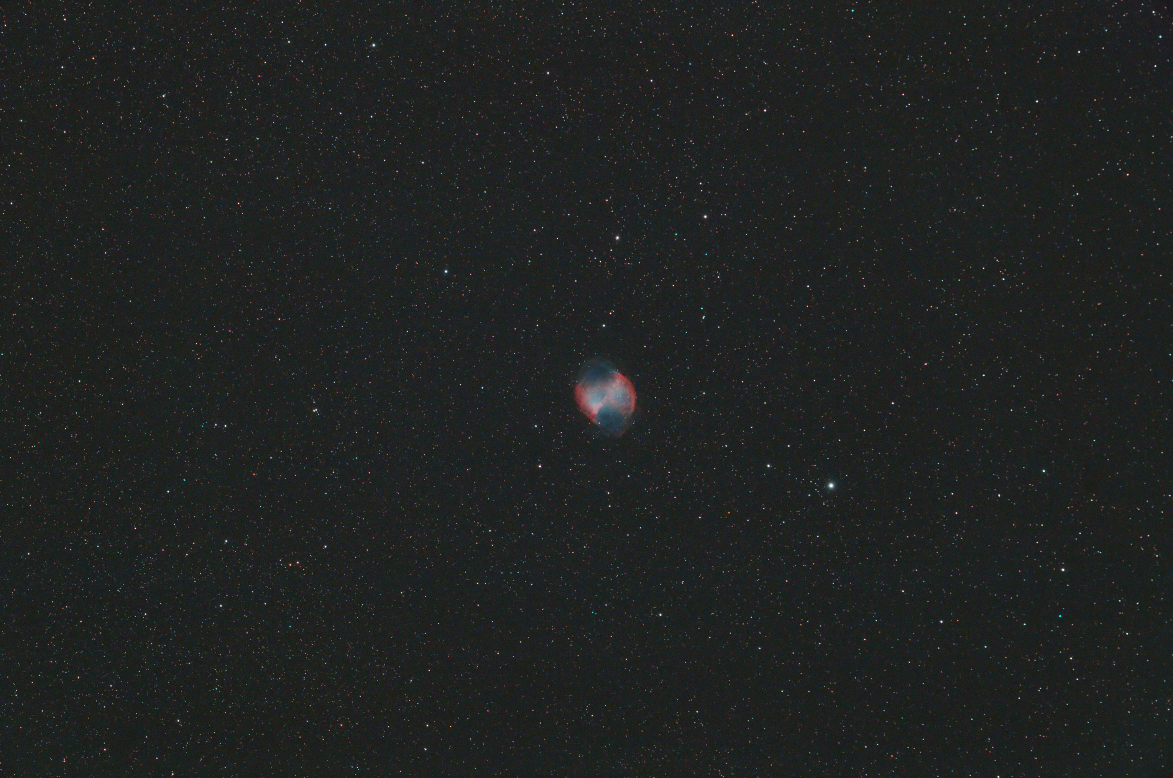 Die Aufnahme ist bei durchschnittlichen Bedingungen im Münchner Osten entstanden, der Himmel hatte nach Bortle-Skala etwa Klasse 6M27 oder der Hantelnebel ist der Überrest einer Nova. Am Ende eines Sternenlebens stößt der Rote Riese einen Teil seiner Materie ab und fällt anschließend in sich zusammen, zu einem weißen Zwerg. Dieses Schicksal wird in ferner Zukunft auch unserer Sonne blühen.