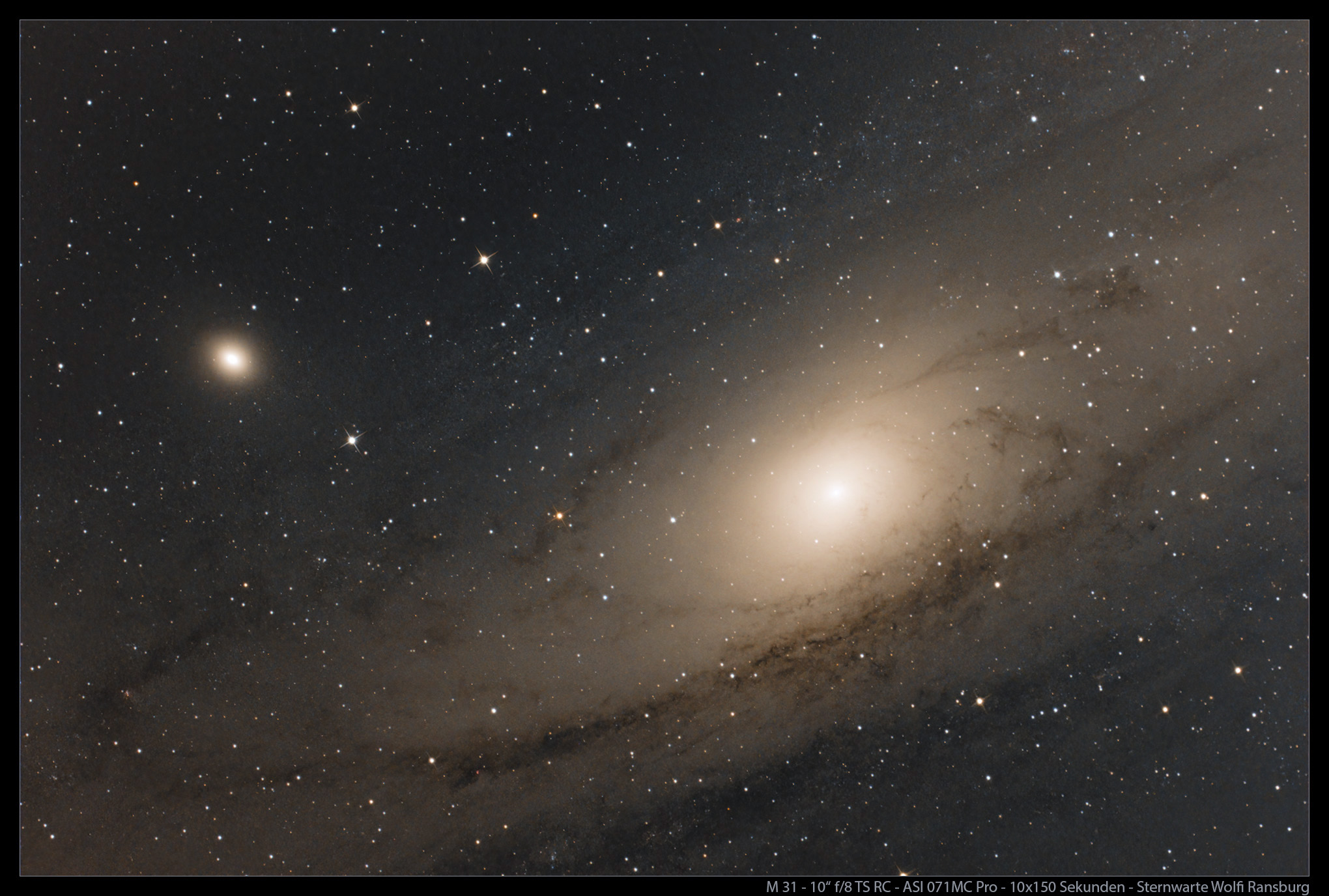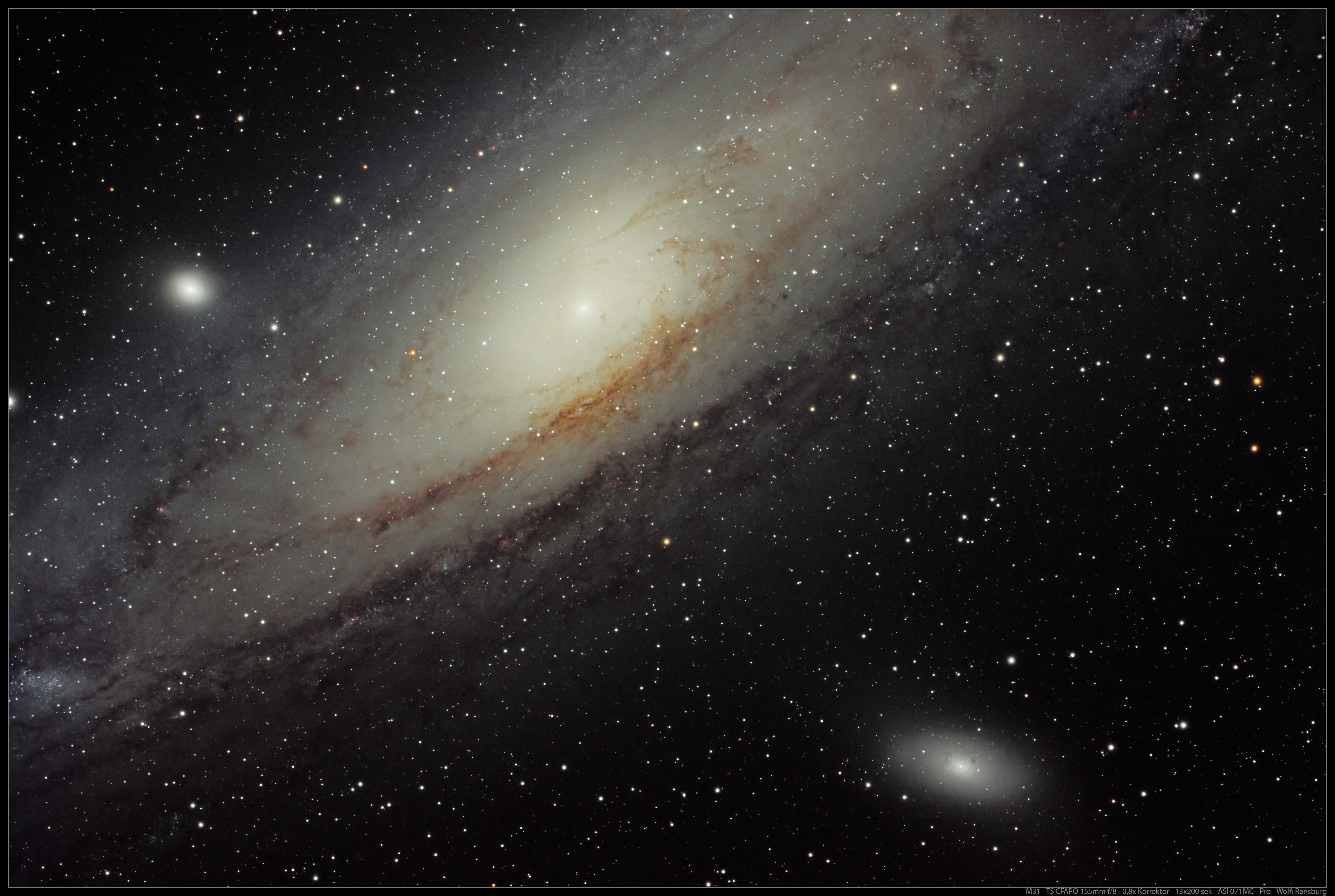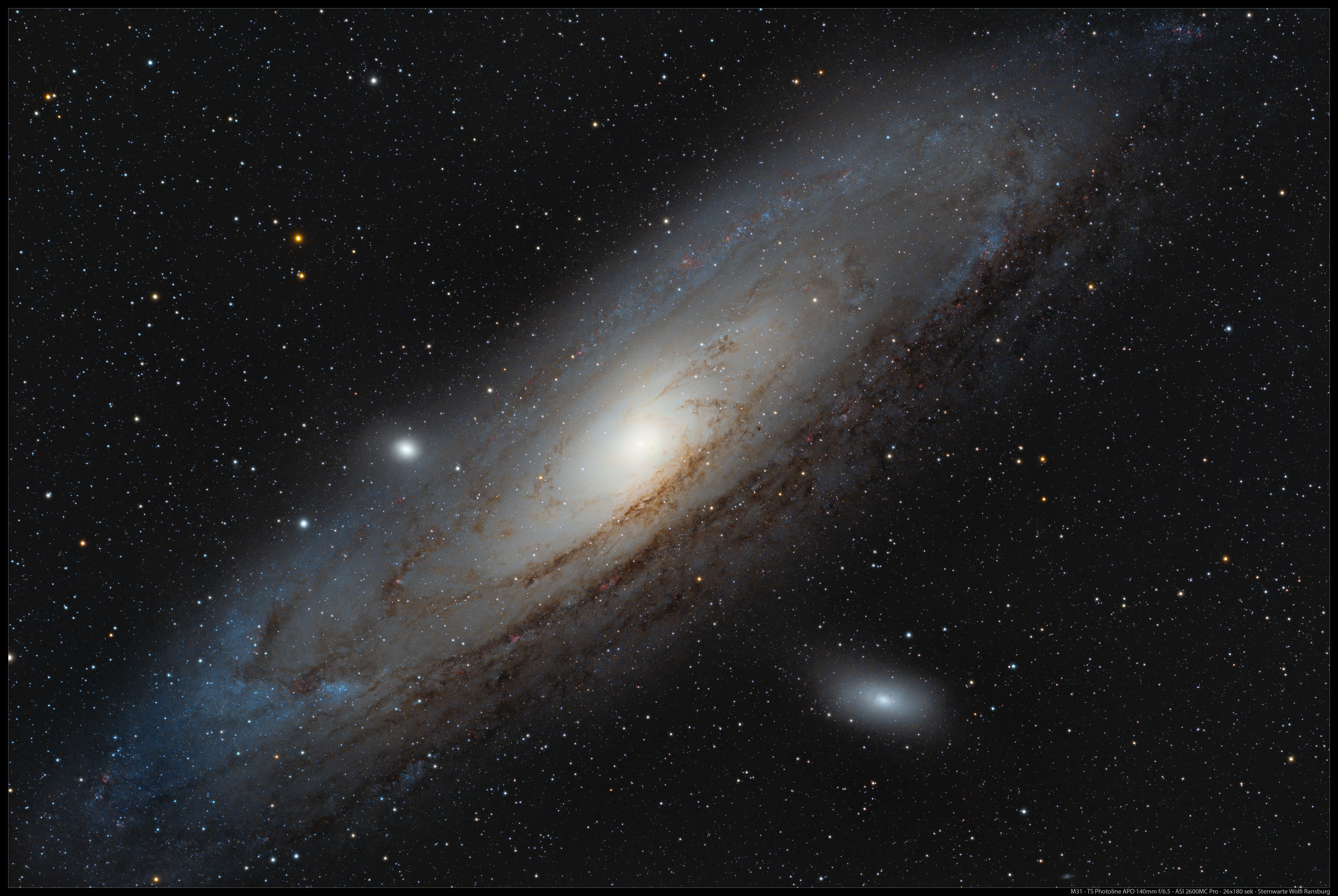 Für diese Aufnahme habe ich meinen alten Photoline 115mm f/7 APO wieder aktiviert. Mit dem 2,5" Vollformat Korrektor und der ASI 2400MC Pro Vollformat Kamera ist der Apo für diese Objekte ideal, weil er ein weites Feld und doch eine hohe Auflösung vereint.Ähnlich, wie in unserer Milchstraße, hat auch M31 viele Dunkelwolken, die das Licht der dahinterliegenden Sterne verschlucken. Die Aufnahme der Kernregion von M31 bringt diese Wolken gut zur Geltung.