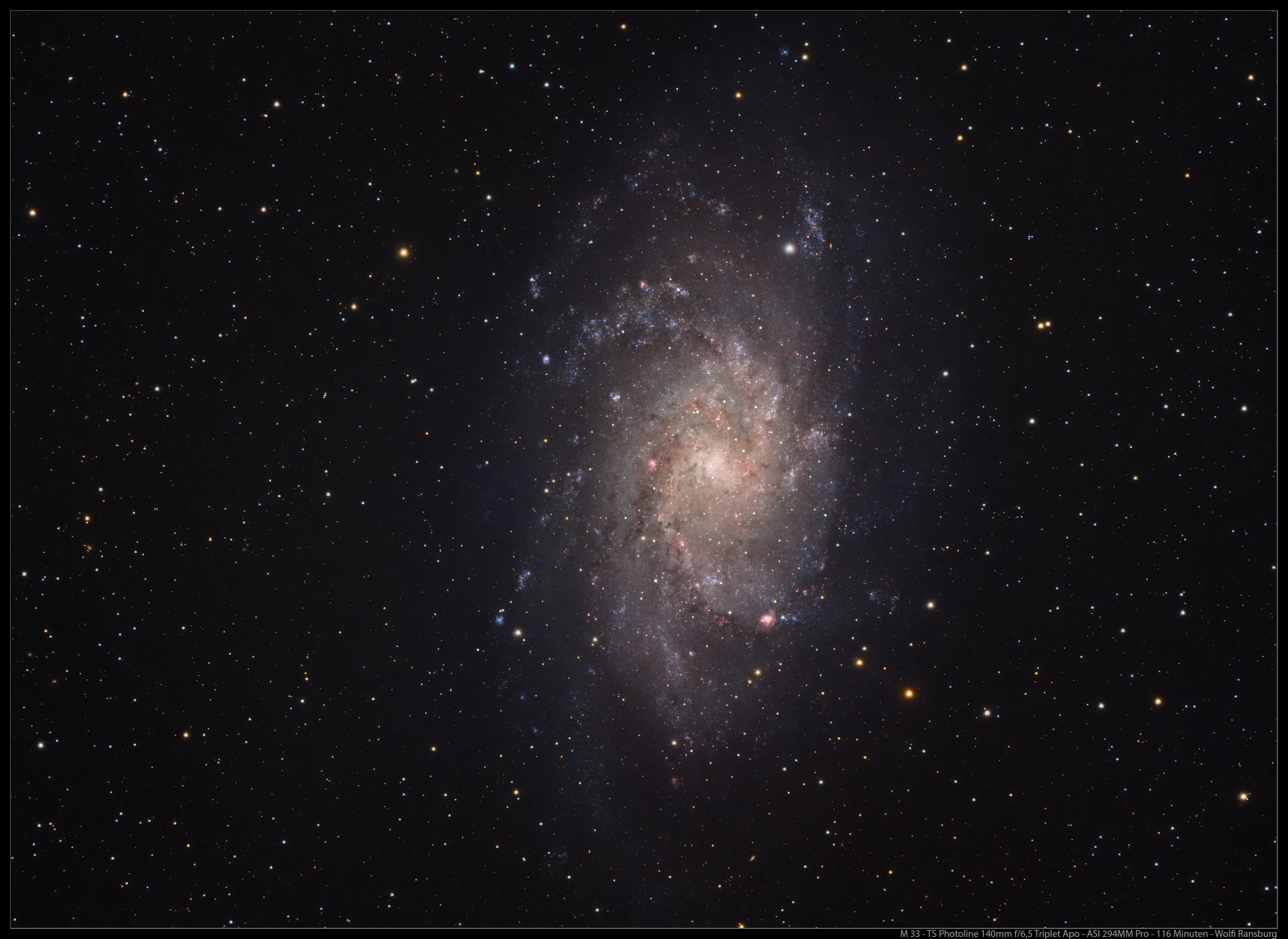 Diese Aufnahme war eine besondere Herausforderung, denn an dieser Nacht war das Seeing sehr schlecht, der Leitstern ist herumgehüpft und einige Aufnahmen waren sogar, wegen verzogener Sterne, unbrauchbar.M33 ist, wie der bekannte Andromedanebel ein Mitglied der Lokalen Gruppe, zu der auch unsere Milchstraße gehört. In sehr guten Nächten ist die Galaxie sogar mit dem bloßen Auge zu sehen. Die Galaxie zeigt eine Fülle von Details, weil wir fast von oben draufblicken. Die Aufnahme ist auch ein "First Light" mit der neuen ZWO Kamera ASI 294MM S/W Kamera. Die Aufnahme ist im L-RGB Verfahren entstanden.