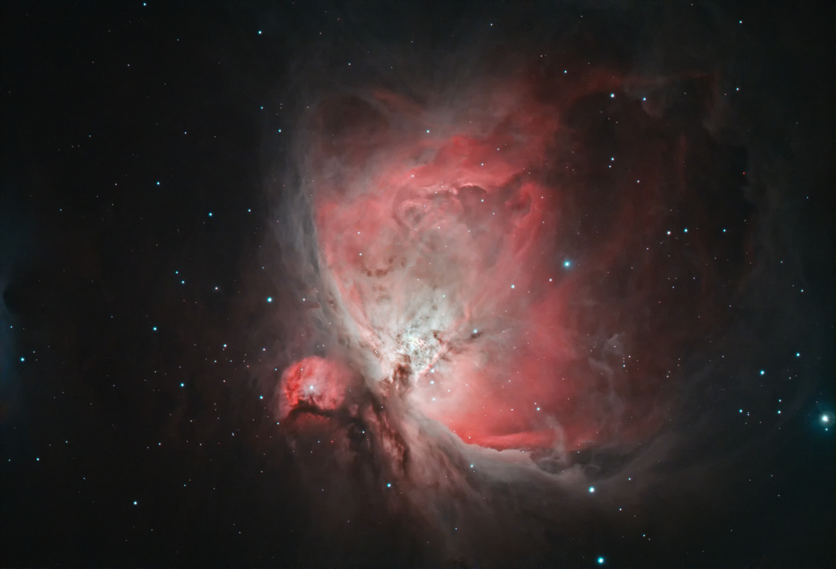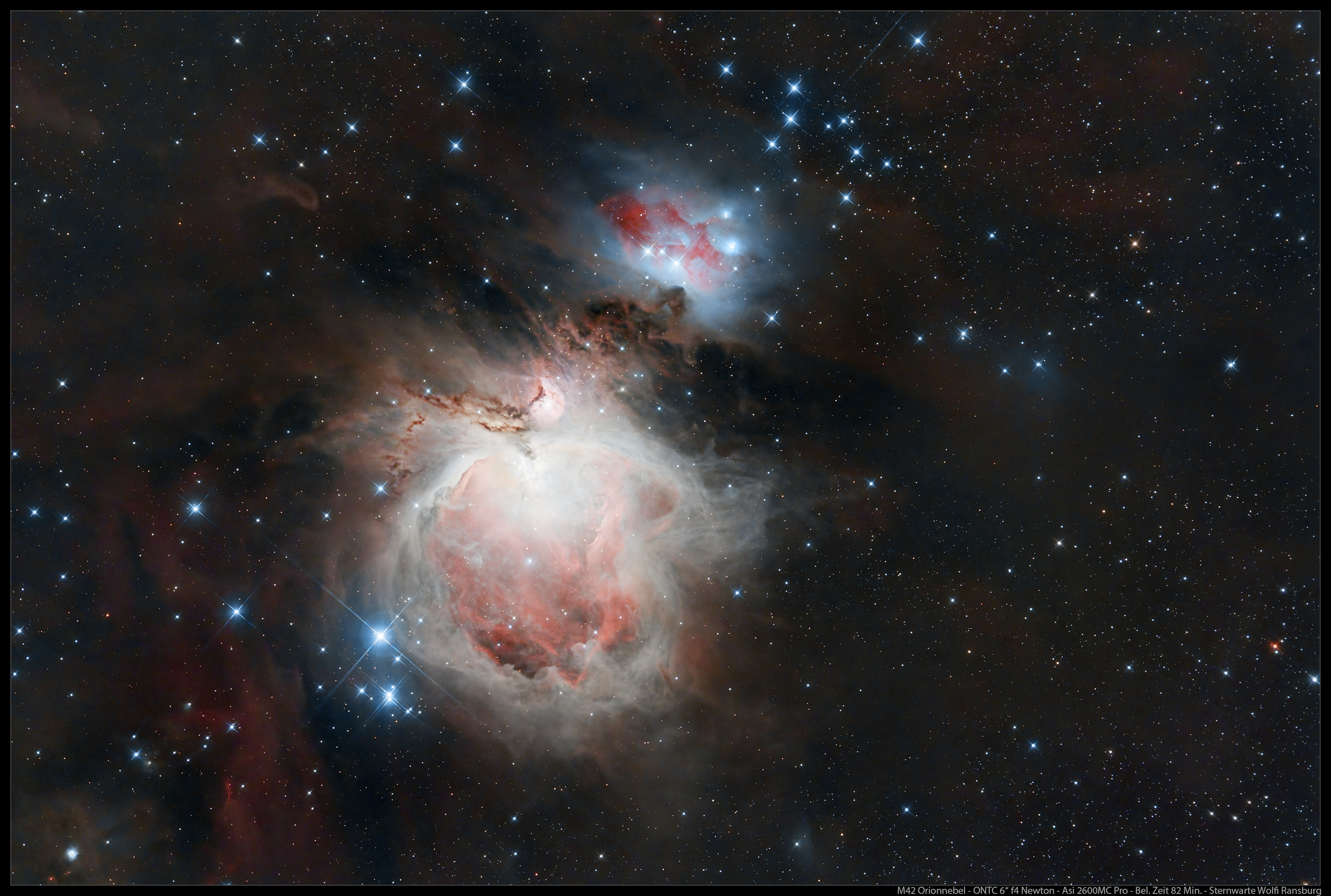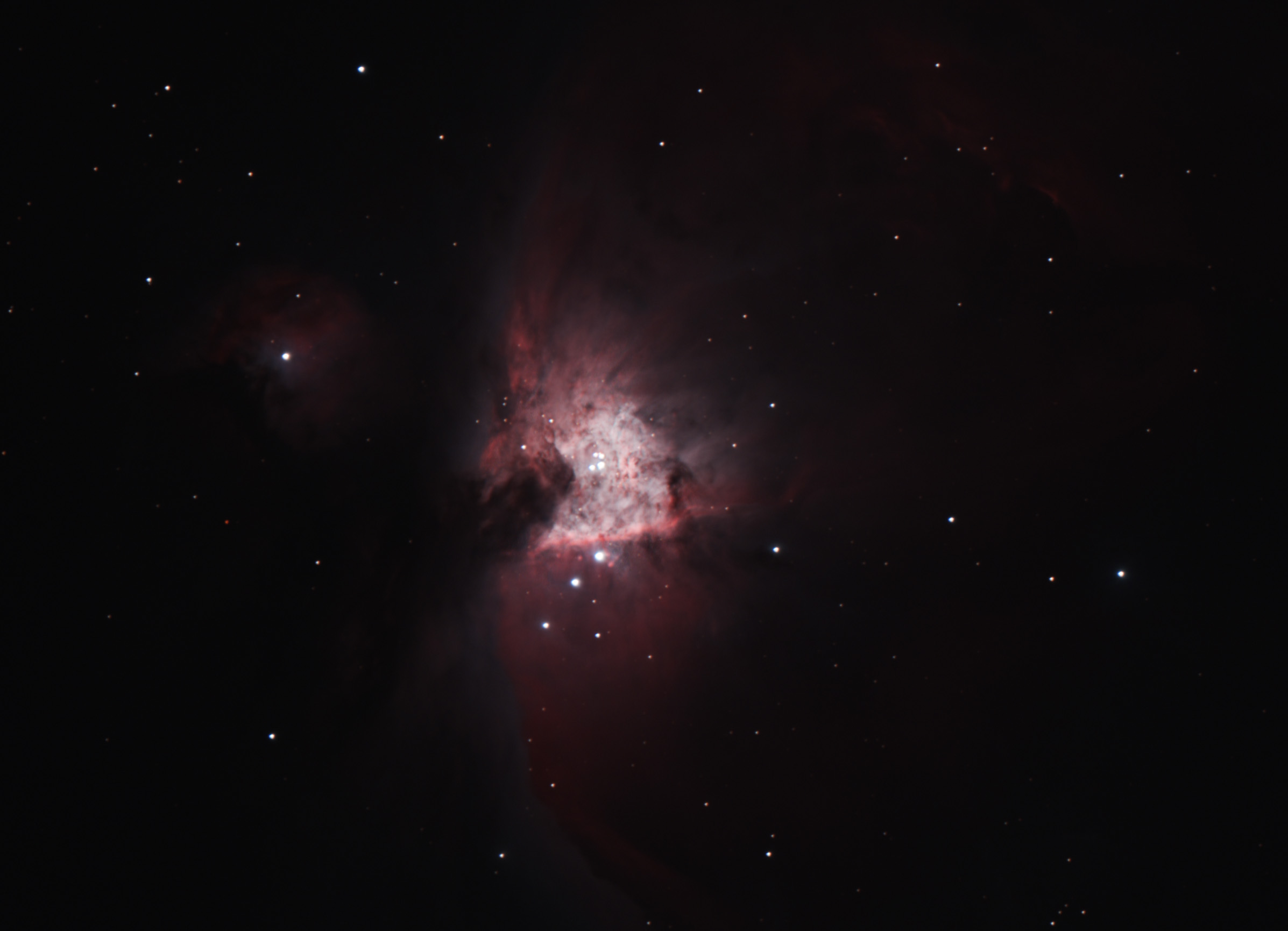 Eigentlich wollte ich diese Daten vernichten, zum einen sind es nur 95 Minuten geworden, dann sind Wolken gekommen und zudem ist mir der Fokus im Blaukanal nicht gelungen. Doch durch etwas mehr Bildbearbeitung konnte ich noch einiges retten.M42 - der große Orionnebel ist eines der bekanntesten Winterobjekte und so hell, daß er bereits mit dem bloßen Auge sichtbar ist.
