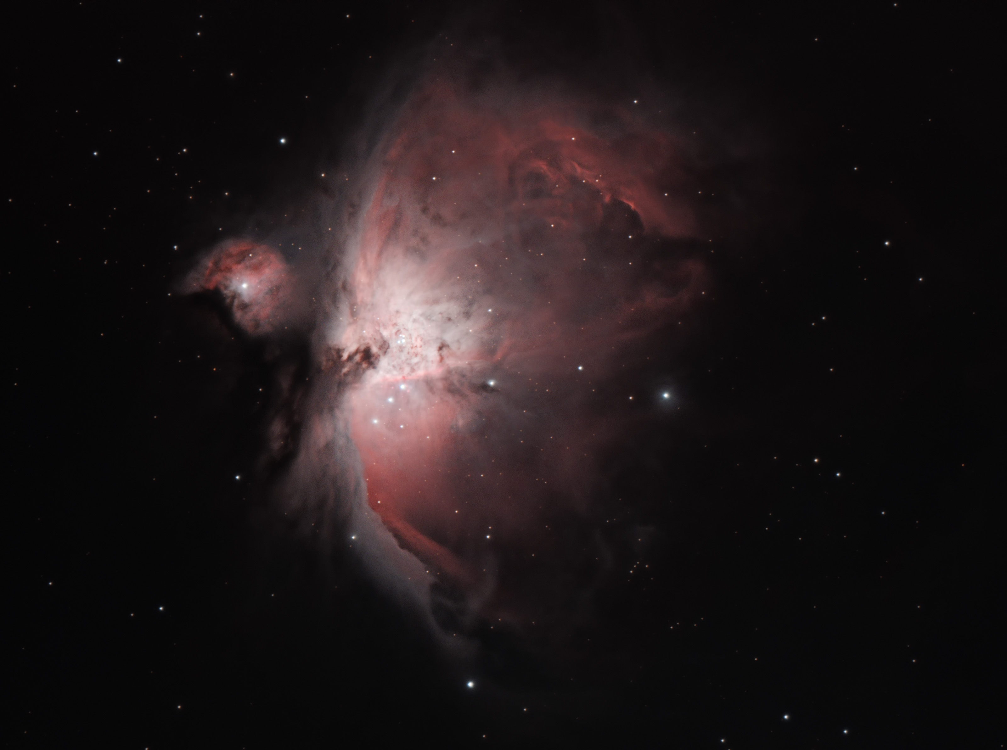 M42 musste für "first Light" herhalten. Ich habe den neuen TS-Optics 155mm f/8 Photoline Apo montiert und auch gleich eine neue Kamera eingesetzt, die ZWO ASI071MC Pro , eine gekühlte APS-C Format Color Kamera. Die Leistungsfähigkeit der Kombination hat mich überrascht. Nur 14x50 Sekunden haben ausgereicht, um ein gutes Bildergebnis zu bekommen. Die Nachbearbeitung war nur sehr moderat. Ich denke, ich werde noch einige Aufnahmen mit dieser schönen Kombination machen. Die untere Aufnahme zeigt das Zentrum des Orionnebels mit hoher Auflösung. Selbstverständlich sind auch einige protoplanetare Scheiben sichtbar.