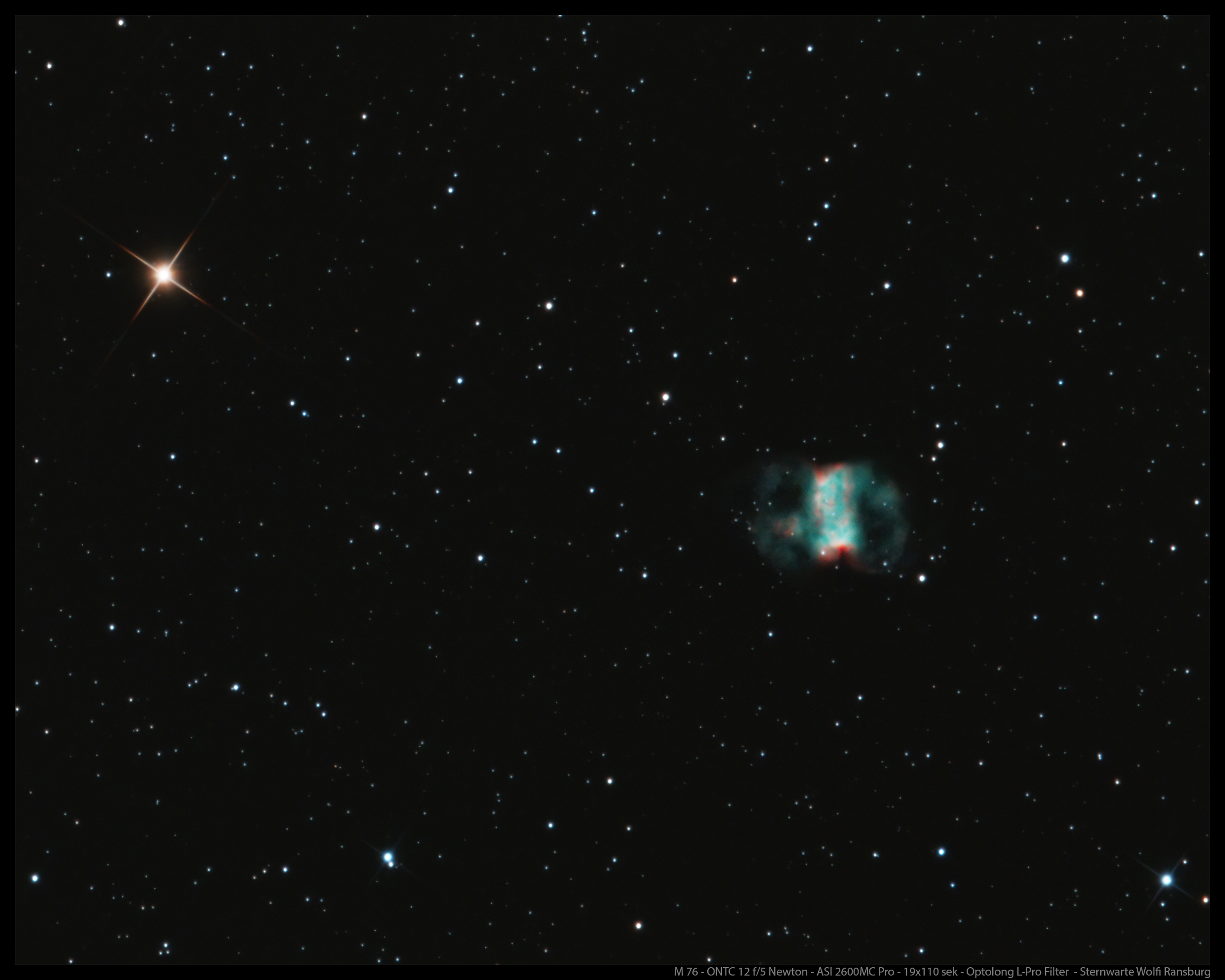 Die Aufnahme ist unter eher schlechten Bedingungen entstanden. Die Transparenz war zwar für den Münchner Vorstadthimmel gut aber das Seeing war sehr schlecht. Zudem habe ich in Maxim DL eine falsche Einstellung beim Guiden aktiviert (Anti Stiction) mit dem Ergebnis, daß die Software ständig den Dek. Motor aktiviert hat und der Autoguider hat das wieder ausgleichen müssen. Die Kombination aus diesem Fehler und dem schlechten Seeing hat zu den aufgeblähten Sternen geführt.M76 ist ein kleiner aber recht heller planetarischer Nebel im Sternbild Perseus. Der Nebel hat nur einen Durchmesser von 3,12 Bogenminuten.