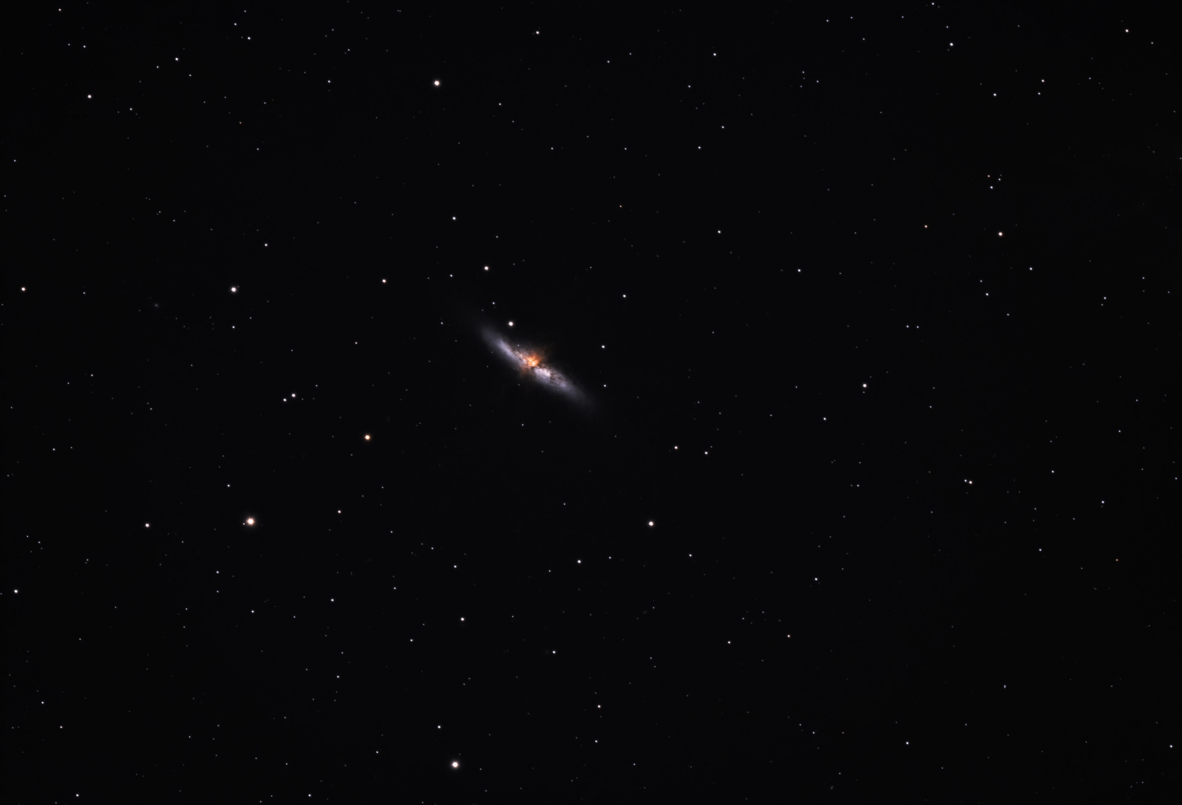M82 im großen Wagen ist besondere Galaxie. Durch den Vorbeiflug von M81, einer größeren Galaxie, hat sich die Sternentstehung in M82 dramatisch erhöht. M82 ist auch eine starke Infrarotquelle. Ein besonderes Merkmal sind die Unmengen an Materie, die aus der Galaxie herausgeschleudert werden. Selbst auf Amateuraufnahmen wie dieser erinnert das Bild an eine Explosion.