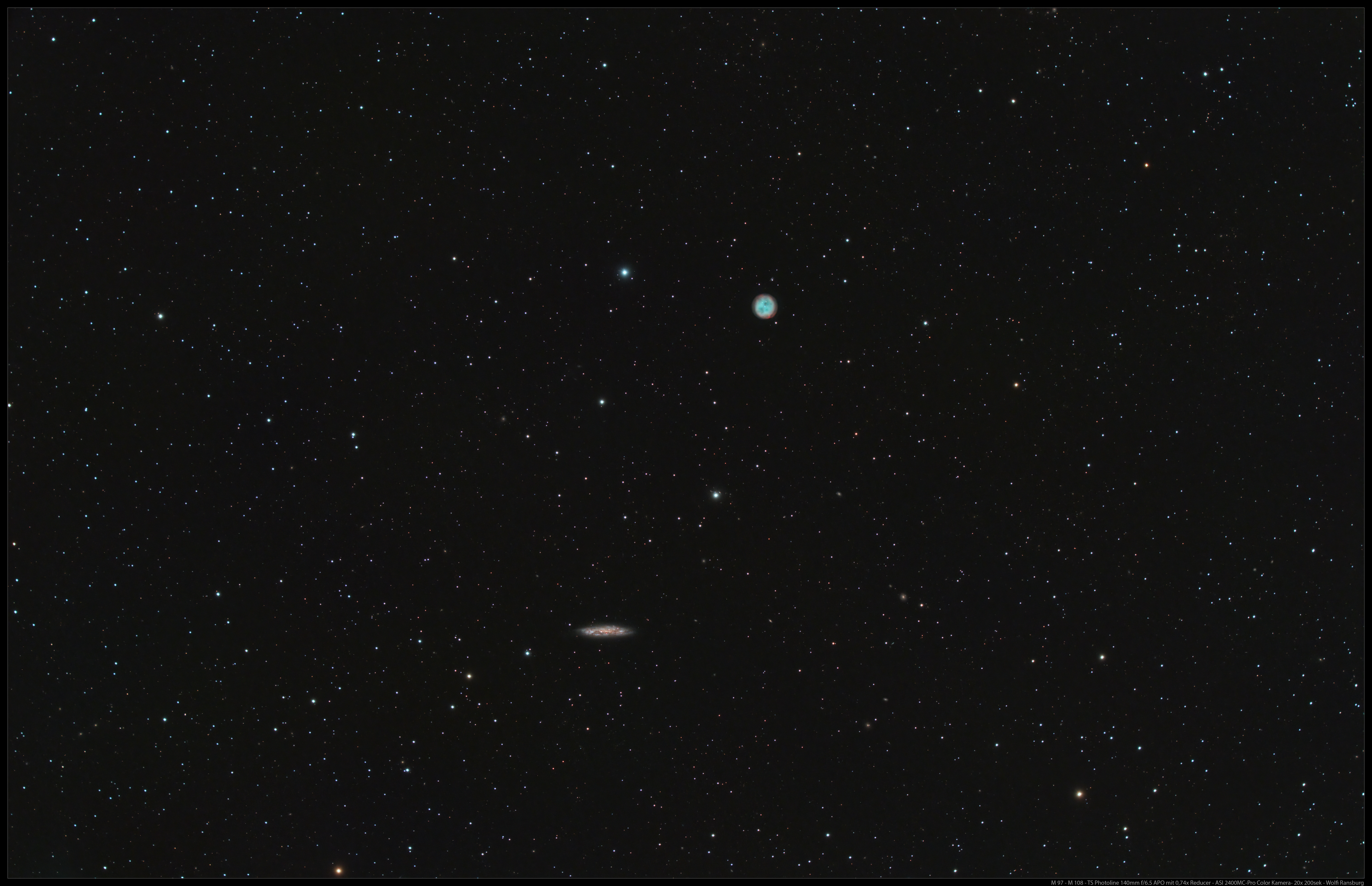 Diese Aufnahme ist ein erster Test und "first Light" mit dem neuen ONTC1215 12" f5 Newton von Teleskop-Service. Ich denke, der große Newton wird einen Stammplatz in meiner Sternwarte haben.Der planetarische Nebel M97 und die Galaxie M108 im Großen Wagen bilden einen reizvollen Kontrast, da die beiden Objekte sehr unterschiedlich sind. M97 ist ein Teil unserer Galaxie und der Überrest einer Nova. M108 hingegen ist eine Galaxie in etwa 34 Millionen Lichtjahren Entfernung. Besonders reizvoll sind die vielen kleinen Galaxien im Umfeld dieser Objekte. Es lohnt sich, das Bild mit voller Auflösung zu betrachten.