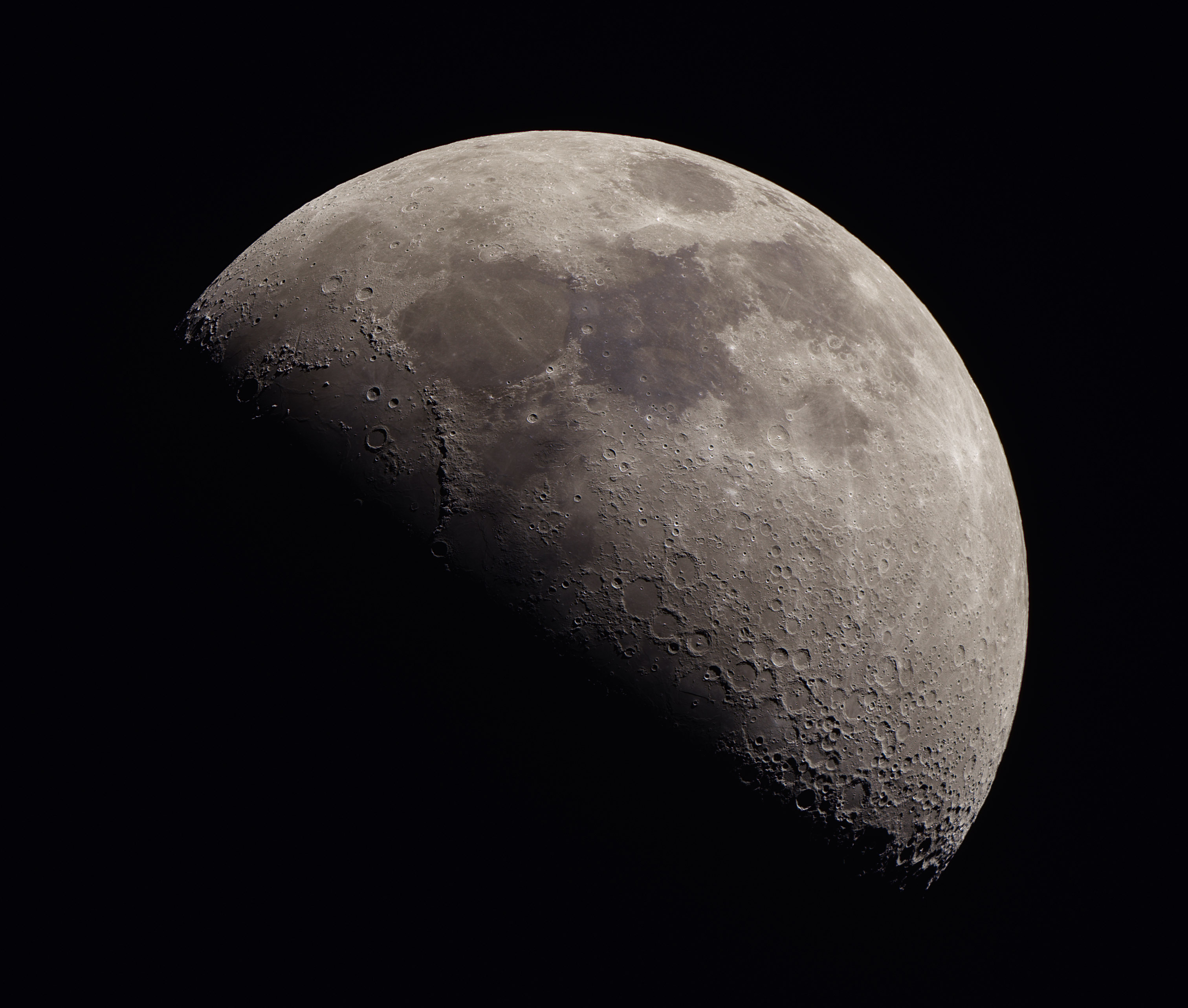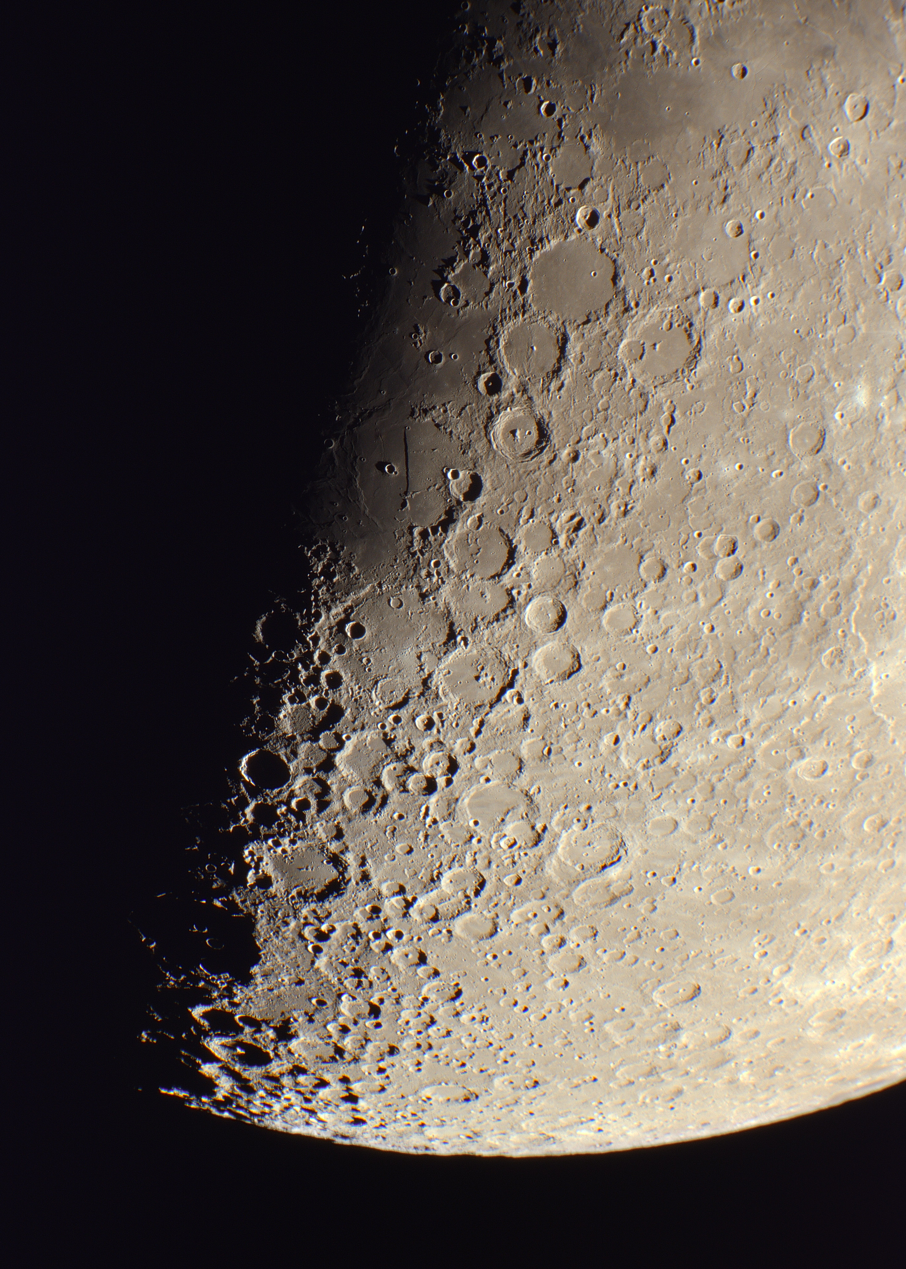 Der Mond gehört normalerweise nicht zu meinen Zielen, er ist eher ein "Störfaktor" wegen seiner Helligkeit. Aber manchmal reizt er mich trotzdem. Die Vergrößerung der höher aufgelösten Aufnahme wurde mit einer 2,5x Barlow von TS-Optics gesteigert.