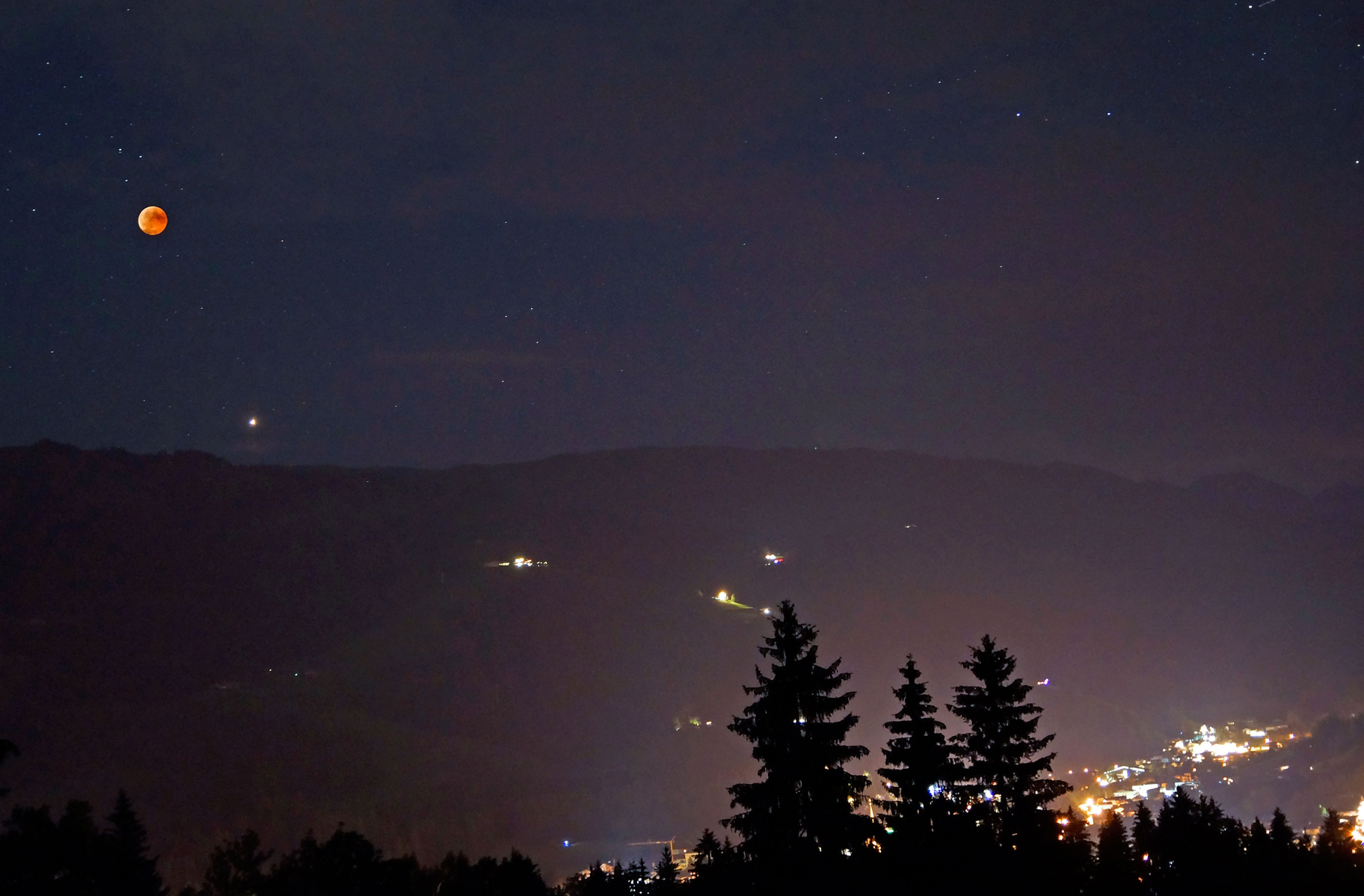 Ich wollte die Mondfinsternis gemeinsam mit Tino und Edi einfach nur genießen, also nur Kamera und das gute Sony 16-50mm Tele. Unser avisierter Beobachtungsort – der Gaisberg bei Kirchberg. Und dort warteten wir und warteten … Irgendwann kam mir der Gedanke, uh, der Mond steht ja weit südlich, genau dort, wo sich der verfinsterte Mond befinden sollte, war ein Berg. Also nichts wie alles schnell ins Auto verstauen und ab auf die gegenüberliegende Seite des Tales in Richtung Sonnberg. Immer höher schraubte sich die Straße und plötzlich – der Mond war da, tiefrot und kaum zu sehen. Ab mit dem Auto in die nächste Einfahrt, Fotostativ und Kamera wurden aufgebaut und … anbei das fotografische Ergebnis. Der helle Lichtpunkt rechts unterhalb des Mondes ist übrigens der Planet Mars.