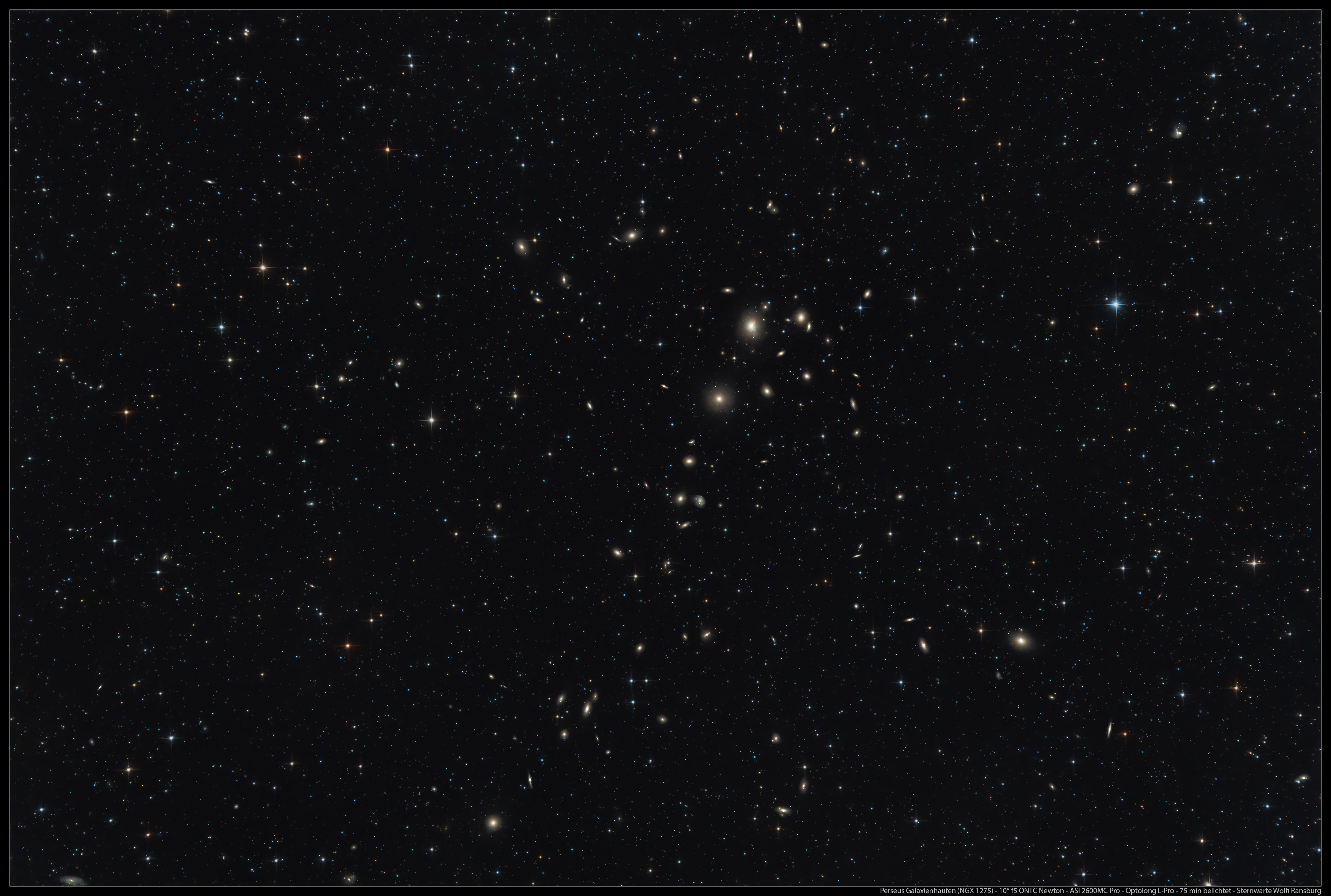 Der Galaxienhauden im Perseus (Abell 426) ist ein Ansammlung von etwa 1000 Galaxien. In der Mitte ist die irreguläre Galaxie NGC 1275, die mit der Radioquelle Perseus A verbunden ist.