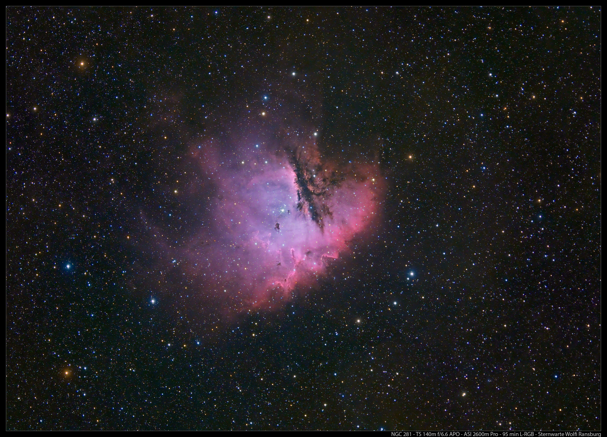 NGC 281 ist ein Gasnebel in der Cassiopeia in dessen Mitte ein offener Sternhaufen eingebettet ist. Deshalb gibt es im Nebel bläuliche Reflexionsanteile, rötliche Anteile wo der Nebel selbst strahlt und sogar dunkle Bereiche, wo die Materie so dicht ist, daß sie das Licht verschluckt.