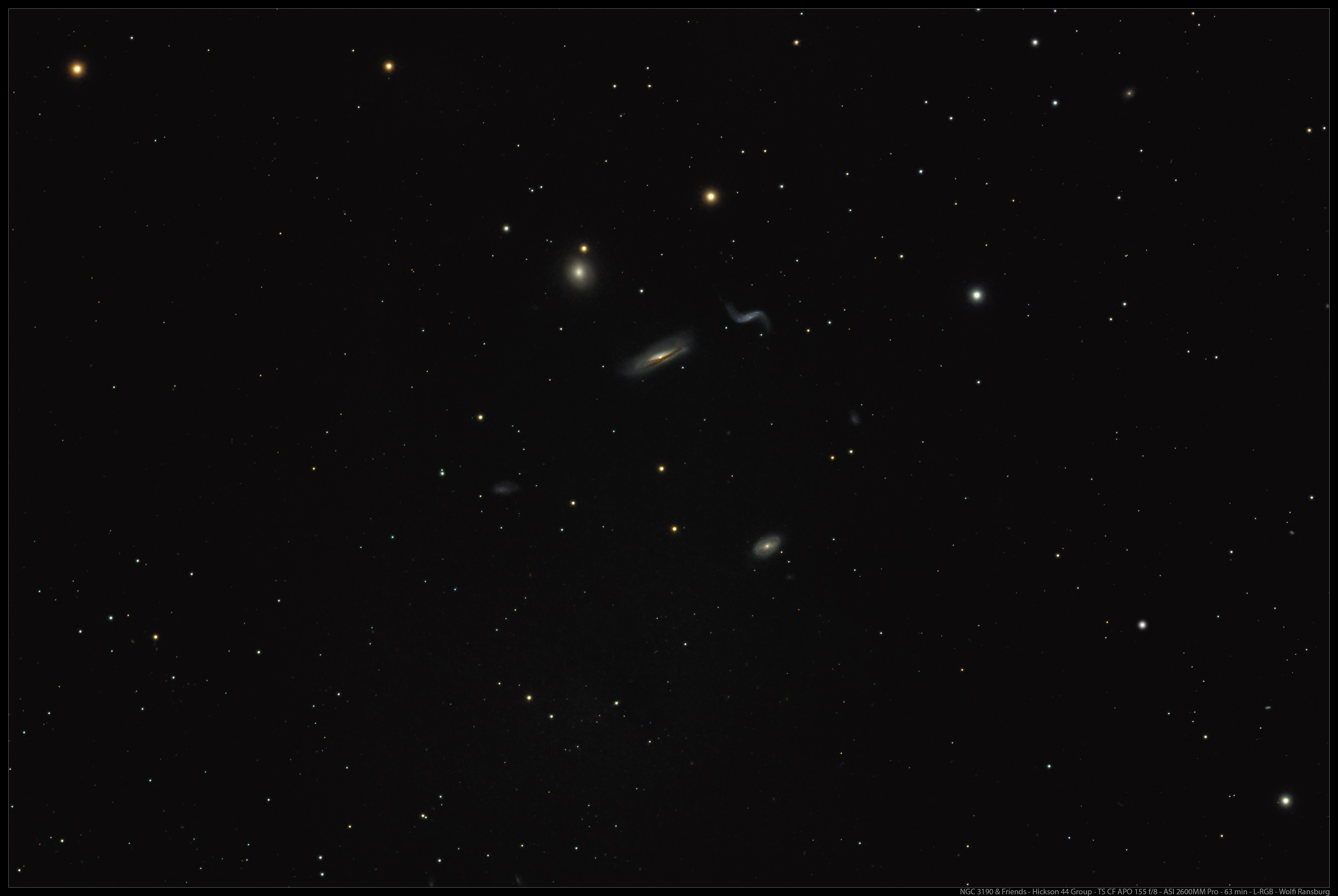 Der Photoline APO mit 140mm Öffnung und f/6,5 in Verbindung mit dem 0,74x Reducer bietet eine hohe Lichtstärke. In Verbindung mit der Vollformat Kamera ASI 2400 kann man so ein großes Feld ablichten bei gleichzeitig guter Feldqualität und moderaten BelichtungzeitenNGC 3190 ist eingebettet in eine kleine Galaxiengruppe mit dem Namen Hickson 44. Die Galaxie selbst ist etwa 53 Millionen Lichtjahre von uns entfernt. Sie ist eine Galaxie, die in einer Wechselwirkung steht. Durch die Gravitationskraft wurde diese Galaxie verformt.