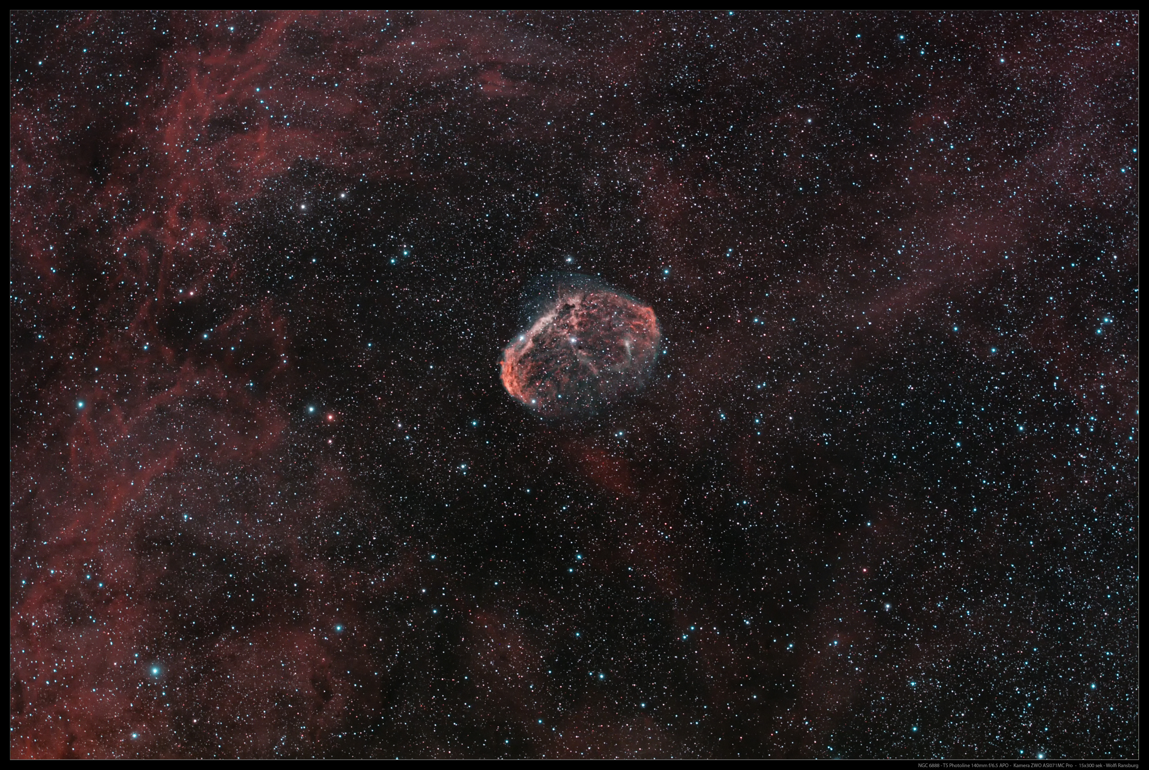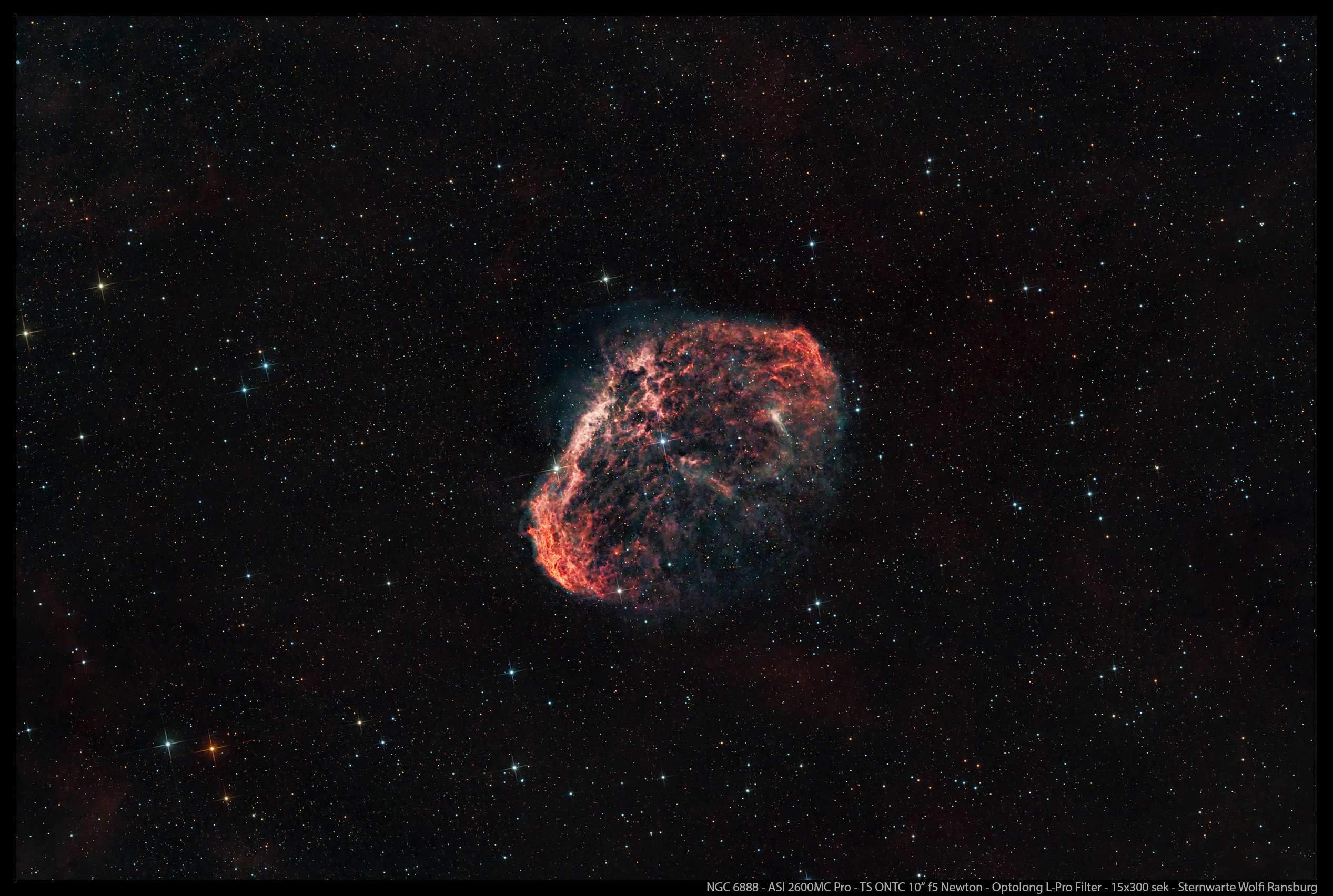 Der Crescent Nebel oder Sichelnebel ist ein relativ kleiner Emissionsnebel im Sternbild Schwan. Der Nebel ist deutlich kleiner, als der Nordamerikanebel oder Cirrusnebel, in seiner Nachbarschaft. Der Zentralstern in der Nebelmitte regt den Nebel zum Leuchten an. Zudem treiben die starken Sternwinde den Nebel außeinander und wo die Nebelmasse mit dem interstellaren Medium kollidiert, beginnt der Nebel ebenfalls zu leuchten. Auch das Umfeld von NGC 6888 ist voll von feinen Emissionsnebeln, die in einem zarten Rotton leuchten.
