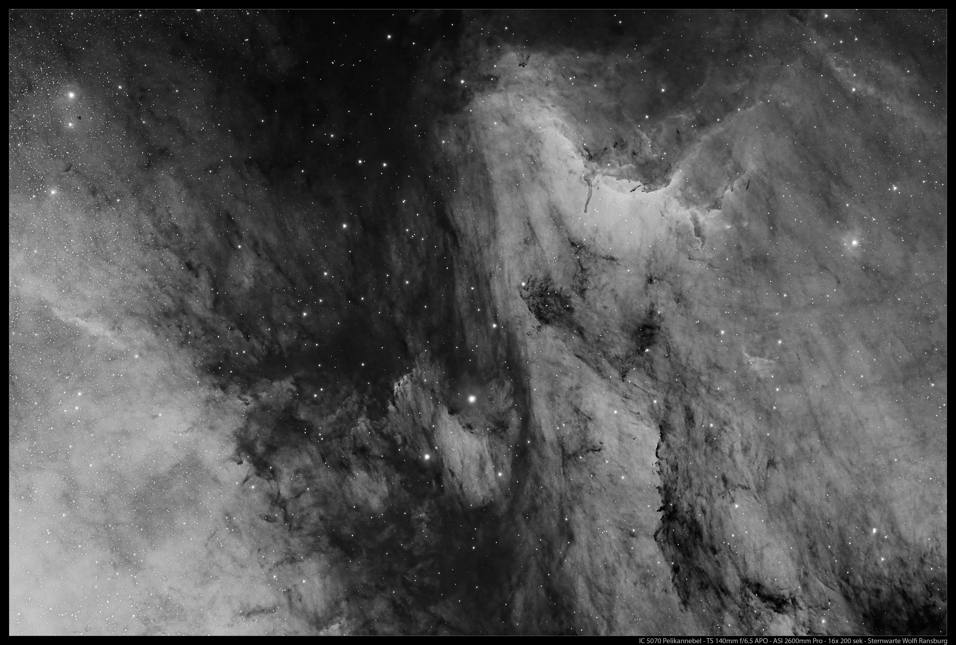 Eigentlich wollte ich nur meinen neuen Antlia ALP-T 5nm Schmalbandfilter testen, es war schließlich ein Tag vor Vollmond. Zudem wollte ich mit meiner ASI2600MC Pro etwas mit dem Gain experimentieren. Doch dann dachte ich mir, warum nicht einfach 17x250 Sekunden auf den Cirrusnebel draufhalten. Es waren wegen dem Mond wirklich nur wenige Sterne am Himmel. So gesehen bin ich vom Ergebnis echt überrascht. Teleskop: TS 140mm f6.5 APO Korrektor: TSFLAT25DEL Kamera: ASI2600MC Pro - GAIN 100 Filter: Antlia ALP-T 5nm Schmalband Filter Belichtung: 17x 250 SekundenDer Pelikan Nebel, mit etwas Phantasie erkennt man seine Form, befindet sich neben dem bekannten Nordamerika Nebel und fasziniert durch feine Strukturen. Er ist ein Emissionsnebel. Die Strukturen kommen durch eingelagerte oder vorgelagerte Dunkelwolken.