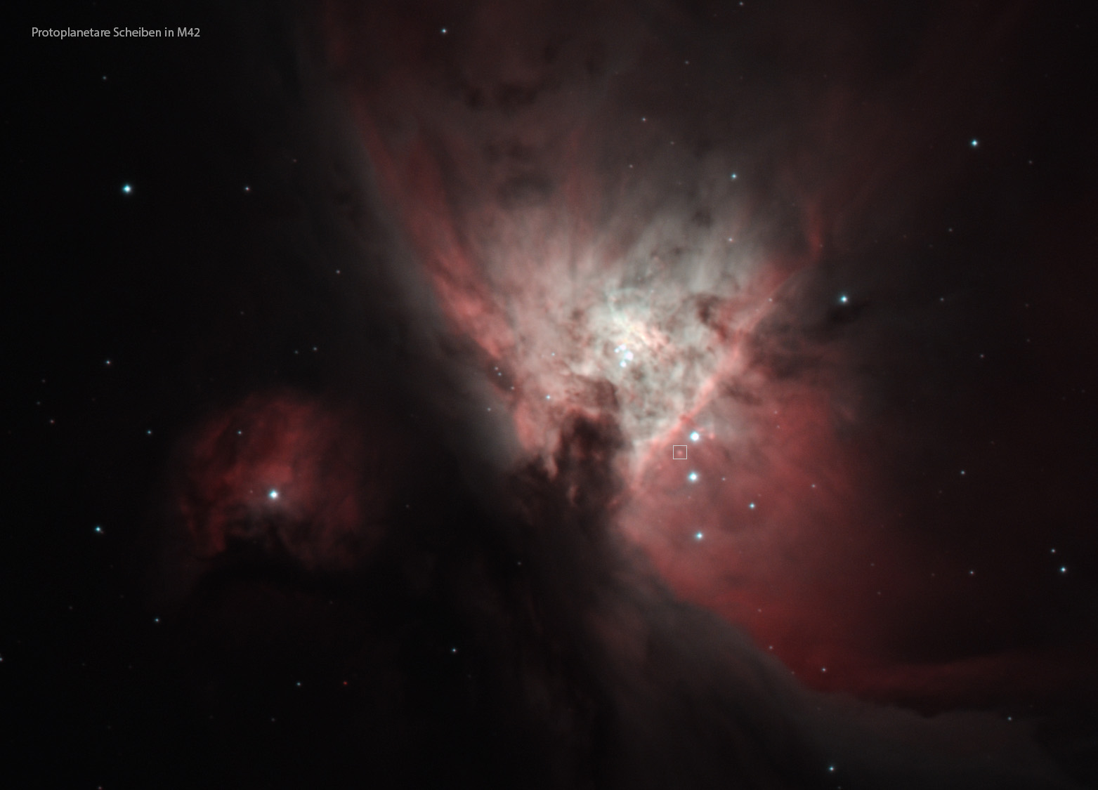 M42 oder der Orionnebel ist ein sehr heller Gasnebel im Sternbild Orion. Er ist problemlos mit dem freien Auge sichtbar und ist ein Komplex einer sehr viel größeren Molekülwolke. Der Nebel besteht zum Großteil aus Wasserstoff, der von den innenliegenden Sternen zum Leuchten angeregt wird. M42 ist eine Region, in der viele Sterne entstehen. Die Aufnahme des Nebels ist deutlich einfacher, als die Ausarbeitung, da der Innenbereich des Nebels sehr hell ist. Man muß also die Randbereiche anheben und die Helligkeit des Innenbereiches stark absenken, ohne daß der Nebel anfängt, unnatürlich zu wirken - kein leichtes Unterfangen. M42 bietet dem Amateurastronomen noch eine besondere Möglichkeit, die Aufnahme einer protoplanetaren Scheibe. Aus dieser Scheibe entwickelt sich später ein kleiner brauner Zwergstern oder ein Planet (2. Aufnahme - kleines Quadrat)