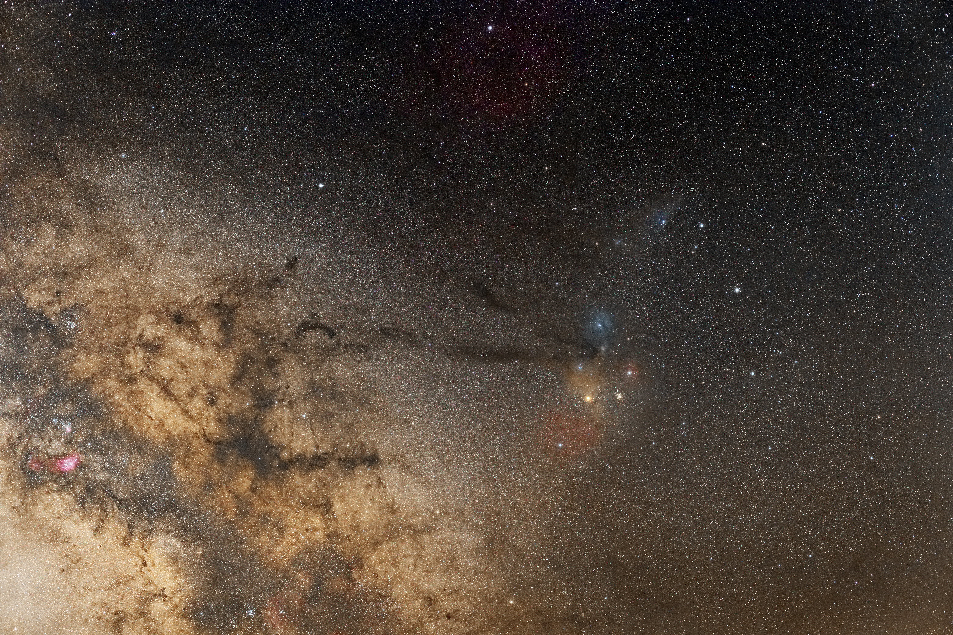 Diese Aufnahme ist eigentlich ein Abfallprodukt aus der Perseidenbeobachtung. Ich habe einfach meine H-EQ5 aufgebaut und bei eher durchschnittlichen Bedingungen (die Milchstraße war kaum mit dem Auge erkennbar) auf das Objekt gehalten. Der gute Kontrast kommt hauptsächlich durch den Optolong L-Enhance Filter, der sehr gut mit den modernen CMOS Sensoren harmoniert.Das war meine 2. Aufnahme in Kroation, wieder mit dem Star Adventurer. Nach einem schnellen Einnorden, habe ich einfach 20x40 Sekunden in Richtung Antares belichtet. Mein Ziel war die farbenfrohe Region um Rho Ophiuchi. Schön sind auch die ausgeprägten Dunkelwolken zu sehen, die diese Region mit der Milchstraße verbinden.