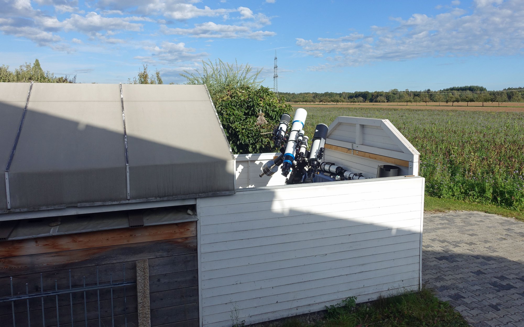 Eine Sternwarte im Garten ist der Traum von vielen Amateurastronomen. Ich konnte mir diesen Traum verwirklichen. Das "Heim" für die Montierung und Teleskope ist eine Schiebedachhütte, die seit 2006 Jahren Wind, Wetter und Stürmen trotzt. Trotzdem kann man das schwere Schiebedach noch immer mit dem kleinen Finger öffnen. Die Sternwarte bietet innen 3x3 Meter Platz. Sicherlich, der Stadtrand Münchens bietet keinen besonders guten Himmel aber dank moderner Filter und guter Kameras kann ich fotografisch tief in den Himmel vordringen.