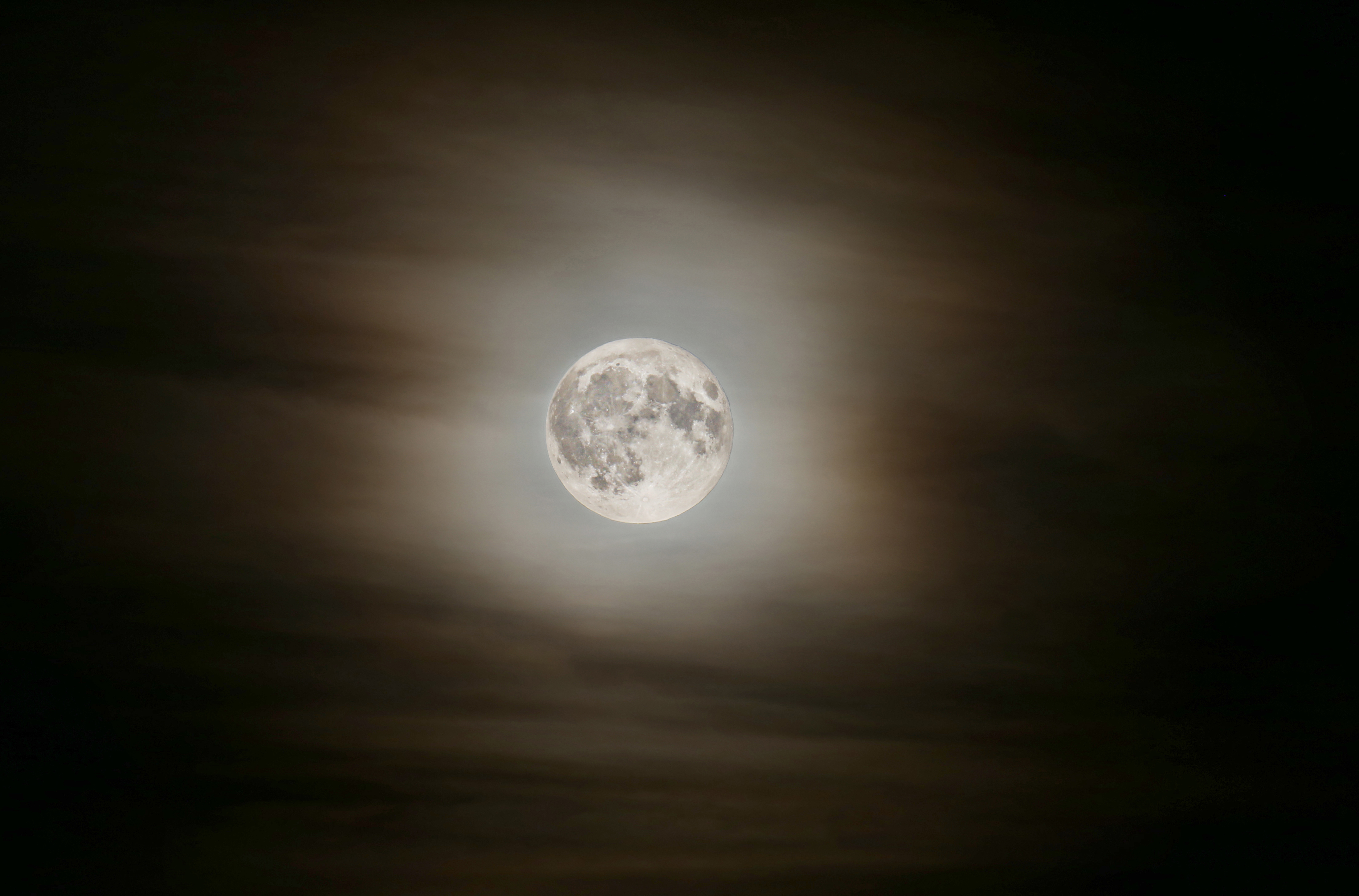 Die Aufnahme ist eine Kombi aus einer kurzen Belichtung um die Details der Mondoberfläche zu sehen und einer längeren Belichtung, um die Wolken festzuhalten.